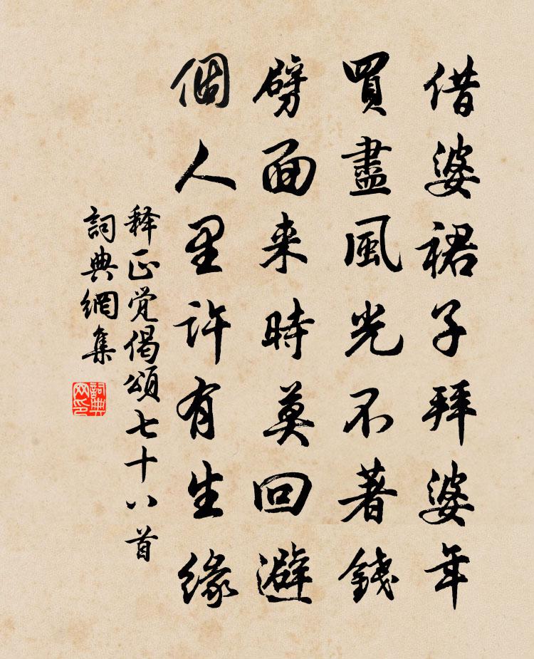 詩詞名句歷史字典書法欣賞書法字典國語詞典說文解字康熙字典古漢語字典標 題 作 者 詩 句 偈頌七十八首作者:釋正覺 朝代:宋代偈頌七十八首原文借婆裙子拜婆年,買盡風光不著錢。劈面來時莫迴避,個人里許有生緣。詩詞問答問:偈頌七十八首的作者是誰?答:釋正覺問:偈頌七十八首寫於哪個朝代?答:宋代釋正覺偈頌七十八首書法欣賞偈頌七十八首書法作品詩詞推薦秋懷陸游〔宋代〕星斗闌乾河漢流,建州風物更禁秋。年來多病題詩嬾,付與鳴蛩替說愁。清河茂才以良筆並詩為惠次韻奉答林逋〔宋代〕郊翰秋勁愈於錐,筠管溫溫上玉輝。聊為夫君一棲閣,老來駑緩久知非。偈二首釋倚遇〔宋代〕法昌今日開爐,行腳僧無一個。唯有十八高人,緘口圍爐打坐。不是規矩嚴難,免見諸人話墮。直饒口似秤鎚,未岳陽樓雜詠十二絕胡寅〔宋代〕范公才具濟川舟,翰墨居然第一流。第向遺文窺遠意,原言憂樂繼前修。答王內翰范舍人歐陽修〔宋代〕相從一笑歡無厭,屢獲新篇喜可涯。自昔居前誚◇秕,幸容相倚媿蒹葭。白麻詔令追三代,青史文章自一家。我亦寄懶庵劉子翬〔宋代〕山暝雨連夕,今晨天氣清。遙懷懶庵人,高臥掩柴荊。幽寂性所嗜,蕭然寄平生。惟應田叟來,對床話躬耕。晨炊杜遷市煮筍楊萬里〔宋代〕金陵竹筍硬如石,石猶有髓筍不及。杜遷市里筍如酥,筍味清絕酥不如。帶雨斫來和籜煮,中含柘漿雜甘露。可齏姑射山詩題曾山人壁釋惟鳳〔宋代〕東西望朔漠,姑射獨崔嵬。一片兩片雲,終南太華來。根繞黃河曲,影落清渭隈。深澗飲渴虹,邃河生秋雷。古徑又和饒計使丹青閣韻趙汝騰〔宋代〕久聞傑閣原今酬,亭午登臨到上頭。二水清澄新雨霽,眾峰蒼峭凍雲留。擬賡場圃詩人句,休負煙波墨客愁。信使山堂前庭有奇石數種其狀皆與物形相類在此久文同〔宋代〕海底初生處,扶疏苦未全。幾時隨鐵網,流落漢江邊。蘇幕遮 別子馬鈺〔元代〕出凡籠,無系絆。落魄婪耽,日作無常觀。十四兒孫都棄┾。自在逍遙,風月為吾伴。背葫蘆,攜鐵罐。壺貯瓊漿過故人陳羽山居戴叔倫〔唐代〕向來攜酒共追攀,此日看雲獨未還。不見山中人半載,依然松下屋三間。峰攢仙境丹霞上,水繞漁磯綠玉灣。卻望詠黃石公葛慶龍〔宋代〕挾書律重火猶光,天下岩搜不敢藏。圯上老人無見者,一編親寫授張良。雙松堂李處權〔宋代〕對植是何年,岩岩挺寥廓。風雷已屢起,霜雪終不著。先生立其中,偃蹇相參錯。高標與秀氣,鼎足冠伊洛。想此送處士自番禺東遊便歸蘇台別業李群玉〔唐代〕啞軋暮江上,櫓聲搖落心。宛陵三千里,路指吳雲深。蓴菜動歸興,忽然聞會吟。南浮龍川月,東下敬亭岑。多君頌古十一首釋子益〔宋代〕撥草瞻風尋劍客,桃花一見便忻然。直饒真到不疑地,放下更參三十年。十一月四日風雨大作二首·其一陸游〔宋代〕風卷江湖雨闇村,四山聲作海濤翻。溪柴火軟蠻氈暖,我與狸奴不出門。將赴東陽留上包諫議戴叔倫〔唐代〕敝邑連山遠,仙舟數刻同。多慚屢回首,前路在泥中。贈章八元張繼〔唐代〕相見談經史,江樓坐夜闌。風聲吹戶響,燈影照人寒。俗薄交遊盡,時危出處難。衰年逢二妙,亦得悶懷寬。送外兄方卿公美赴廣東憲十絕黃公度〔宋代〕新息功名晚始收,送君今去跕鳶州。男兒未上雲台畫,莫念平生馬少游。名句推薦回樂烽前沙似雪,受降城外月如霜。李益《夜上受降城聞笛》 別日南鴻才北去,今朝北雁又南飛。魚玄機《閨怨》 梨花自寒食,進節只愁余。楊萬里《寒食上冢》 呼童烹雞酌白酒,兒女嬉笑牽人衣。李白《南陵別兒童入京》 晴日暖風生麥氣,綠陰幽草勝花時。王安石《初夏即事》 人散市聲收,漸入愁時節。劉克莊《生查子·元夕戲陳敬叟》 而今燈漫掛。不是暗塵明月,那時元夜。蔣捷《女冠子·元夕》 涓涓不塞,將為江河。熒熒不救,炎炎奈何姜子牙《六韜·文韜·守土》 竹影和詩瘦,梅花入夢香。王庭筠《絕句·竹影和詩瘦》 停車坐愛楓林晚,霜葉紅於二月花。杜牧《山行》