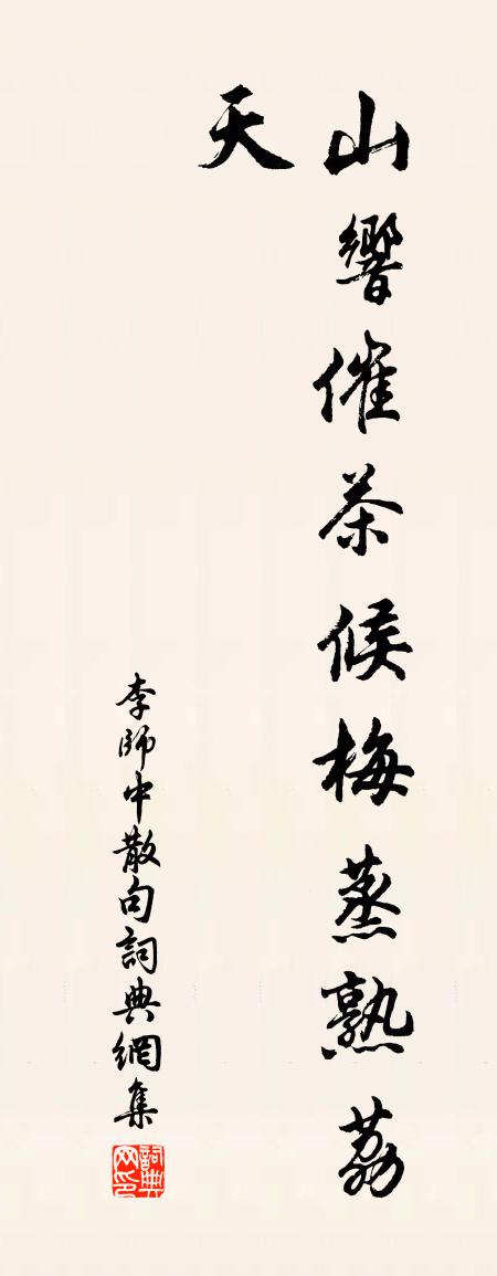 詩詞名句歷史字典書法欣賞書法字典國語詞典說文解字康熙字典古漢語字典標 題 作 者 詩 句 句作者:李師中 朝代:宋代句原文山響催茶候,梅蒸熟荔天。詩詞問答問:句的作者是誰?答:李師中問:句寫於哪個朝代?答:宋代李師中句書法欣賞句書法作品詩詞推薦夏園梅堯臣〔宋代〕夏園甘果熟,日覺樹林稀。休笑道傍李,無人摘自肥。冬夜對書卷有感陸游〔宋代〕人生如夢終當覺,世事非天孰可憑?萬卷雖多當具眼,一言惟恕可銘膺。所聞要足敵憂患,吾道豈其無廢興?白髮西江月馬鈺〔元代〕心內常搜己過,口中不說他非。世人為處我無為。乞食街前不恥。日日飽餐玉蕊。時時爛飲刀圭。一朝引出化生兒挽高宗皇帝章四首衛涇〔宋代〕致治勤三紀,怡神壽九齡。玉卮傳漢殿,寶冊煥堯庭。慶事方頻舉,哀歌詎忍聽。萬邦惟戴舜,億載奉慈寧。挽吳茂新侍郎三首劉克莊〔宋代〕□□乘驄馬,安能作噤烏。去因攻潞國,來又薦君謨。□□延英疏,丹青洛社圖。嗚呼傳不朽,猶足警奸諛。同景仁況之諸君游南再飲梅花下韓維〔宋代〕茲園曠不涉,寒草忽已芽。同游三四人,及此風景嘉。芳梅如我期,朱萼承素華。欣然坐其下,偃君初月斜。攀條閒詠三首姜特立〔宋代〕莫笑歸耕計未然,我今得計是歸田。天公若也憐衰晚,更乞閒身二十年。偈頌九十三首釋梵琮〔宋代〕開爐無可做,大家團團坐。坐久卻成勞,撥動爐中火。火星忽迸散,內外俱照破。一聲寒雁叫長空,雲中道人正高湖州歌九十八首 其四十五汪元量〔宋代〕銷金帳下忽天明,夢裡無情亦有情。何處亂山可埋骨,暫時相對坐調笙。山中與裴秀才迪書王維〔唐代〕近臘月下,景氣和暢,故山殊可過。足下方溫經,猥不敢相煩,輒便往山中,憩感配寺,與山僧飯訖而去。 北贈道師曹鄴〔唐代〕舉世皆問人,唯師獨求己。一馬無四蹄,頃刻行千里。應笑北原上,丘墳亂如蟻。宮詞一百首岳珂〔宋代〕雉扇雙分識聖顏,紫宸上合正催班。退朝花底紛歸騎,春在金門萬柳間。東歸白居易〔唐代〕翩翩平肩輿,中有醉老夫。膝上展詩卷,竿頭懸酒壺。食宿無定程,仆馬多緩驅。臨水歇半日,望山傾一盂。藉草端午貼子詞皇后閣五首周麟之〔宋代〕剪就冰綃月影團,不須多羨女乘鶯。君王瑤札新題處,一樣蟾花點點丹。【南呂】金字經_曉來春勻透貫雲石〔元代〕曉來春勻透,西園第一枝,香暖朱簾酒滿卮。思,休歌腸斷詞。關心事,夜闌入靜時。 金芽薰曉日,碧風度小寄題蜀李氏義概堂樓鑰〔宋代〕養氣非為俠,輕財弗市恩。仁聲高月旦,義概徹天閽。稱美推賢嗣,揚名有順孫。活人幾百萬,何止駟容門。次韻杜天達見寄晁補之〔宋代〕冷屋寒舟兩處懷,一封歸信隔年開。愁容頓與河冰泮,佳思先隨岸柳來。射雉便甘忘我矢,畫蛇何怪奪君杯。端知胡和聊用所贈王復翁韻見寄疊韻奉謝徐瑞〔宋代〕世味居然如嚼晚,貧間獨愛故丘瓜。寸心自欲期千載,一理端能貫百家。為山功夫在進簣,窮源訊息間乘槎。此去延祥寺孫直臣〔宋代〕雷雨隨車上寶坊,僧夸山味最悠長。地靈終日無塵到,天淨常時見海光。神雀羽毛多隱晦,臥龍頭角本軒昂。石樓九日同黃宏公游古城山於石〔宋代〕信步攀躋感舊遊,寒煙衰草思悠悠。西風白髮空驚老,晚節黃花獨耐秋。宇宙幾人歡喜飲,江山一片古今愁。淵明名句推薦蕭條庭院,又斜風細雨,重門須閉。李清照《念奴嬌·春情》 人有不為也,而後可以有為。孟子《孟子·離婁章句下·第八節》 雨濕花房,風斜燕子,池閣晝長春晚。呂渭老《選冠子·雨濕花房》 鳥無聲兮山寂寂,夜正長兮風淅淅。李華《弔古戰場文》 汴水流,泗水流,流到瓜州古渡頭。吳山點點愁白居易《長相思·汴水流》 人去空流水,花飛半掩門。秦觀《南歌子·香墨彎彎畫》 滿紙荒唐言,一把辛酸淚!曹雪芹《紅樓夢·第一回》 今人嗤點流傳賦,不覺前賢畏後生。杜甫《戲為六絕句》 國無三年之食者,國非其國也墨子《墨子·05章 七患》 憐不可存,憐人者無證其忠。友宜重懲,援友者惟其害。來俊臣《羅織經·問罪卷第十》