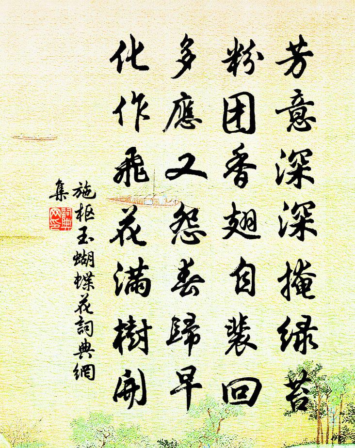 詩詞名句歷史字典書法欣賞書法字典國語詞典說文解字康熙字典古漢語字典標 題 作 者 詩 句 玉蝴蝶花作者:施樞 朝代:宋代玉蝴蝶花原文芳意深深掩綠苔,粉團香翅自裴回。多應又怨春歸早,化作飛花滿樹開。詩詞問答問:玉蝴蝶花的作者是誰?答:施樞問:玉蝴蝶花寫於哪個朝代?答:宋代施樞玉蝴蝶花書法欣賞玉蝴蝶花書法作品詩詞推薦山亭柳王哲〔元代〕春景精研。花草新鮮。夏日赫綻紅蓮。忽然秋早至,見山亭、柳上鳴蟬。飈地朔風來到,飄白雪、遍山川。百歲光和陳擇之春日四絕張栻〔宋代〕泗上當時鼓瑟人,風雩豈是樂閒身。言外默傳千聖旨,胸中長有四時春。鵲橋仙 浙省李參政燕予杭之白塔寺,南廡樂盧摯〔元代〕遂醺然而歸。翌日,載酒西湖,春宴已伺於舟中矣。大參公謂鄧不可無江山畫圖,樓台煙雨。滿意雲間金縷。饒他次韻東皋寺主僧知恭見寄陳著〔宋代〕平地起叢林,工夫歲月深。百吟三教髓,一飯十方心。慣聽人傳說,閒將夢去尋。書來足 * ,亦是老知音。雪中聽箏楊巨源〔唐代〕玉柱泠泠對寒雪,清商怨徵聲何切。誰憐楚客向隅時,一片愁心與弦絕。登城五首劉克莊〔宋代〕漢人稱勁粵,累世不加兵。狂卒才三百,如何便縋城。失調名佚名〔宋代〕愁厭厭、脈脈上心誰消遣。送范憲東叔帥潼川四首陳傅良〔宋代〕逢人九頓首,遇事三折肱。雖知少為狂,正復老可憎。吾今有儲粟,吾昔有短檠。魯論訓何如,周易讀未曾。言歸路逢青州王大夫赴鎮立馬贈別白居易〔唐代〕大旆擁金羈,書生得者稀。何勞問官職,豈不見光輝。赫赫人爭看,翩翩馬欲飛。不期前歲尹,駐節語依依。[前六朝門元帝周曇〔唐代〕木柵江城困魏軍,王褒橫議遏謀臣。賓降未免俱為戮,一死安能謝益仁。高士詠師金吳筠〔唐代〕聖人貴素樸,禮義非玄同。師金告顏生,可謂達化宗。夫子飾芻狗,自然道斯窮。應物方矯行,俯仰靡不通。句錢惟演〔宋代〕高為天一柱,秀作海三峰。所住堂黃庭堅〔宋代〕此山花光佛所住,今日花光還放光。天女來修散花供,道人自有本來香。玲瓏四犯陳允平〔宋代〕金屋春深,似灼灼娉婷,真真嬌艷。洗淨鉛華,依舊曲眉豐臉。猶記舞歇涼州,漸縹緲、碧雲繚亂。白玉環、寶鏡次韻和再拜梅堯臣〔宋代〕建溪茗株成大樹,頗殊楚越所種茶。先春喊山掐白萼,亦異鳥觜蜀客夸。烹新斗硬要咬盞,不同飲酒爭畫蛇。從揉中書夜直夢忠州白居易〔唐代〕閣下燈前夢,巴南城裡游。覓花來渡口,尋寺到山頭。江色分明綠,猿聲依舊愁。禁鍾驚睡覺,唯不上東樓。淮陰行劉禹錫〔唐代〕何物令儂羨,羨郎船尾燕。銜泥趁檣竿,宿食長相見。句俞桂英〔宋代〕母念子行遠,兒雲爺未歸,沁園春 送鄉人高子翔次來韻許有壬〔元代〕放眼蕪城,北盡淮*,東馳海門。嘆故園遙隔,關山歧路,好懷深負,風月乾坤。邂逅佳人,笑談清致,所見而今舒村趙蕃〔宋代〕有竹如椽故可佳,況於竹外隱鷗沙。不嫌官道多車馬,此地端宜著釣車。名句推薦綠楊帶雨垂垂重。五色新絲纏角粽。歐陽修《漁家傲·五月榴花妖艷烘》 將贍才力,務在博見劉勰《文心雕龍·事類》 空山松子落,幽人應未眠。韋應物《秋夜寄邱員外 / 秋夜寄丘二十二員外》 行到水窮處,坐看雲起時。王維《終南別業 / 初至山中 / 入山寄城中故人》 瘦葉幾經雪,淡花應少春。於武陵《贈賣松人》 百結愁腸郁不開,此生惆悵異鄉來。秋瑾《九日感賦》 後不乏人,榮之方久,賢者自苦亦惠嗣。來俊臣《羅織經·固榮卷第六》 相顧無相識,長歌懷採薇。王績《野望》 看風流慷慨,談笑過殘年辛棄疾《八聲甘州·故將軍飲罷夜歸來》 羞日遮羅袖,愁春懶起妝。魚玄機《贈鄰女 / 寄李億員外》