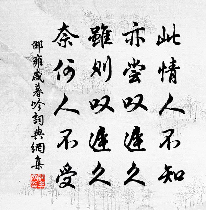 詩詞名句歷史字典書法欣賞書法字典國語詞典說文解字康熙字典古漢語字典標 題 作 者 詩 句 歲暮吟作者:邵雍 朝代:宋代歲暮吟原文此情人不知,亦嘗嘆遲久。雖則嘆遲久,奈何人不受。詩詞問答問:歲暮吟的作者是誰?答:邵雍問:歲暮吟寫於哪個朝代?答:宋代邵雍歲暮吟書法欣賞歲暮吟書法作品詩詞推薦雲月胡宏〔宋代〕朝看南山雲,暮看西山月。雲物時有無,月魄遞盈闕。月明雲昭章,雲散月奇絕。屈伸至理中,莫道吾生拙。隴頭姚寬〔宋代〕下隴流水咽,上隴征人別。秦樹暗秋雲,燕鴻隔春雪。閃倏見胡騎,翩翩傳漢節。戍客起愁心,心與飛蓬折。和董端明大野漁父圖李彌遜〔宋代〕撇棹歸來起暮涼,樂哉誰復慕軒裳。橫短笛,罷鳴榔。紅藕花繁作陣香。送顏韶(得飛字)岑參〔唐代〕遷客猶未老,聖朝今復歸。一從襄陽住,幾度梨花飛。世事了可見,憐君人亦稀。相逢貪醉臥,未得作春衣。春日絕句陸游〔宋代〕楊家園裡醉殘春,醉倩傍人拾墮巾。紅紫飄零不須嘆,東君渠自是行人。參寥上人初得智果院會者十六人分韻賦詩軾得蘇軾〔宋代〕漲水返舊壑,飛雲思故岑。念君忘家客,亦有懷歸心。三間得幽寂,數步藏清深。攢金盧橘塢,散火楊梅林。茶筍山居歸來恰一年有感吳芾〔宋代〕去歲茲辰始息肩,俄然日月已周天。經營小隱雖雲畢,栽種清陰苦未圓。湖畔百年多古木,山前一望足平川。從嗟偈頌六十首釋曇華〔宋代〕晴蜓許是好晴蜓,飛來飛去不曾停。被我摘卻兩邊翼,恰似一枚大鐵釘。江行雜書戴表元〔宋代〕荒城日暮秋江長,{禾罷}稏野熟秋風香。青天茫茫不知處,扁舟臥入菰蒲鄉。波深浪靜魚鴨樂,遙林墮景同飛揚新都驛遠平軒劉望之〔宋代〕霜晴木落送歸鞍,袖手微吟此慰顏。勝欲憑欄招白鳥,更煩剪樹出青山。晚悲薄祿非三釜,賴許清詩見一斑。看到倦尋芳湯恢〔宋代〕餳簫吹暖,蠟燭分煙,春思無限。風到楝花,二十四番吹遍。煙濕濃堆楊柳色,晝長閒墜梨花片。悄簾櫳,聽幽禽送王書記之官永興司馬光〔宋代〕白髮添新鑷,紅塵滿弊衣。人生適未值,吾道豈雲非。鞏洛風煙遠,函秦草樹微。長安春酒美,行樂勿令希。次韻士特贈別劉子翬〔宋代〕客舍愁分袂,梅花小雪前。夜看牛渚月,春別剡溪船。麗句光行色,悲歌慘別筵。後期相約處,雙闕五雲天。與昌國善友釋正覺〔宋代〕駕潮舟澀岸頭沙,得與岩僧款語些。夢付莊周窗外蝶,疑醒樂廣酒中蛇。夜堂莫怪雲慳月,春嶠將知雨促華。想像圓覺院聞杜鵑張舜民〔宋代〕秦川渺渺楚天長,血色山花哭斷腸。謝汝殷勤苦相勸,如今倦客已還鄉。虛席韋莊〔唐代〕一閉香閨後,羅衣盡施僧。鼠偷筵上果,蛾撲帳前燈。土蝕釵無鳳,塵生鏡少菱。有時還影響,花葉曳香繒。奉和御製南郊七言六韻詩楊億〔宋代〕潔齋恭己奉蒼旻,報本園壇備物陳。酒縮楚茅三獻畢,灰飛嶰管一陽新,高空瑞氣長隨輦,永夕清霜暗濕巾。泰畤生查子·春從何處歸晏幾道〔宋代〕春從何處歸,試向溪邊問。岸柳弄嬌黃,隴麥回青潤。多情美少年,屈指芳菲近。誰寄嶺頭梅,來報江南信。縱游深山隨所遇記之陸游〔宋代〕山徑欹危細棧通,孤村小店夕陽紅。竹郎有廟臨江際,木客無家住箐中。木蘭李商隱〔唐代〕二月二十二,木蘭開坼初。初當新病酒,復自久離居。愁絕更傾國,驚新聞遠書。紫絲何日障,油壁幾時車。弄粉名句推薦誰念文園病客?夜色沉沉,獨抱一天岑寂。張埜《奪錦標·七夕》 先拂商弦后角羽,四郊秋葉驚摵摵。李頎《聽董大彈胡笳聲兼寄語弄房給事》 天下從事者,不可以無法儀。無法儀而其事能成者,無有。墨子《墨子·04章 法儀》 吞舟之魚,陸處則不勝螻蟻呂不韋《呂氏春秋·覽·審分覽》 一春夢雨常飄瓦,盡日靈風不滿旗。李商隱《重過聖女祠》 竹樹無聲或有聲,霏霏漠漠散還凝。杜荀鶴《春日山中對雪有作》 絕景良時難再並,他年此日應惆悵。劉禹錫《八月十五夜桃源玩月》 紅葉晚蕭蕭,長亭酒一瓢。許渾《秋日赴闕題潼關驛樓 / 行次潼關逢魏扶東歸》 故人具雞黍,邀我至田家。孟浩然《過故人莊》 扁舟昨泊,危亭孤嘯,目斷閒雲千里。吳潛《鵲橋仙·扁舟昨泊》