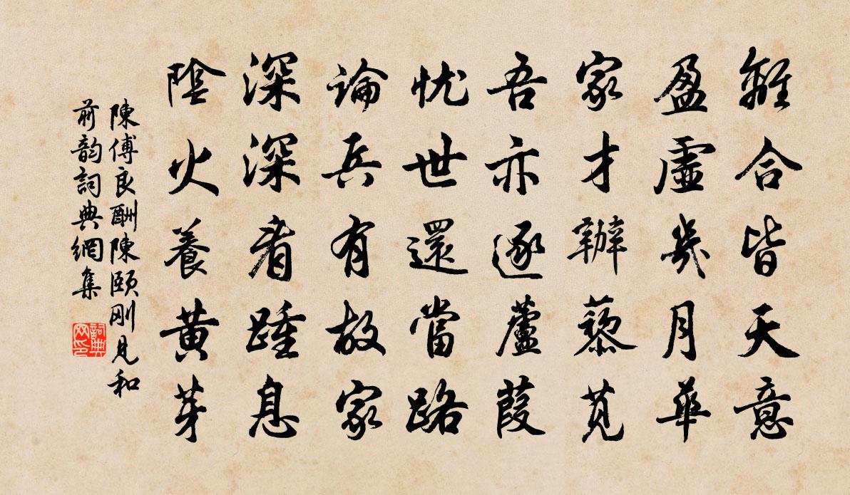 詩詞名句歷史字典書法欣賞書法字典國語詞典說文解字康熙字典古漢語字典標 題 作 者 詩 句 酬陳頤剛見和前韻作者:陳傅良 朝代:宋代酬陳頤剛見和前韻原文離合皆天意,盈虛幾月華。家才辦藜莧,吾亦逐蘆葭。憂世還當路,論兵有故家。深深看踵息,陰火養黃芽。詩詞問答問:酬陳頤剛見和前韻的作者是誰?答:陳傅良問:酬陳頤剛見和前韻寫於哪個朝代?答:宋代陳傅良酬陳頤剛見和前韻書法欣賞酬陳頤剛見和前韻書法作品詩詞推薦朱伯勤同子文弟、幼楚侄來訪,書事楊萬里〔宋代〕板橋再葺岸頭橫,茅屋新添樹外明。山勢追回一溪水,波光飛到萬花亭。沉煙久冷爐猶馥,帘子閒垂腳自平。坐看論俗十二首劉子翬〔宋代〕西村人漸歸,撐柱燒殘屋。東村但蒿萊,死者無人哭。昔茲號富穰,被禍尤殘酷。二三里中豪,喪亂身為僇。遺骸春秋戰國門楚惠王周曇〔唐代〕芹中遇蛭強為吞,不欲緣微有害人。何事免成心腹疾,皇天惟德是相親。日暮天無雲熊孺登〔唐代〕杳杳復蒼然,無雲日暮天。象分青氣外,景盡赤霄前。漸吐星河色,遙生水木煙。從容難附麗,顧步欲澄鮮。但見自和前詩鄰舟皆鹽商戴復古〔宋代〕總被利名役,機心欲算沙。舟行阻風色,客夢負年華。洲渚四五曲,漁樵 * 家。江村無限好,滿眼是蘆花。水龍吟(無射商惠山酌泉)吳文英〔宋代〕艷陽不到青山,古陰冷翠成秋苑。吳娃點黛,江妃擁髻,空濛遮斷。樹密藏溪,草深迷市,峭雲一片。二十年舊夢筆陣李劉〔宋代〕鼓舞先聲自管城,細聽鏖戰了無聲。看來亦異常蛇勢,掃退詞場萬馬兵。春日即事二首項安世〔宋代〕拂拂水紋亂,陰陰花氣芳。輕霏入平野,小雨渡橫塘。柳色未全綠,草根猶半黃。春容不可狀,欲脫意還忘。次韻高子勉十首黃庭堅〔宋代〕志士難推轂,將如高子何。心期誠不淺,餘論或相多。欲向滄洲去,還能小艇麽。鸕鶿西照處,相併曬漁蓑。晝倦楊萬里〔宋代〕愛日曛人慾睡昏,自勻嫩火炷爐薰。蜘蛛已去惟存網,猶罥窗間一隻蚊。寄謝三城太守韓子華舍人邵雍〔宋代〕洛陽自為都,二千有餘年。舉步圖籍中,開目今古間。西北岌宮殿,東南傾山川。照人伊洛清,迎門嵩少寒。水竹和陶丙辰歲八月中於下潠田舍獲吳芾〔宋代〕淵明事南畝,躬自獲岩隈。雖復竭吾力,卻得舒我懷。所收既不薄,卒歲事可諧。隣家相慰勞,競持酒與雞。留連書謝文靖東山圖王銍〔宋代〕山如出繭眉,溪似縈風帶。雅意樂溪山,安用攜粉黛。煙雲無定姿,姝麗有真態。謝公經世心,遇物何顯晦。鐘鼎次韻陸務觀編修新津遇雨,不得登修覺山,徑范成大〔宋代〕送客多情難語離,僕夫無情車載脂。平生飄泊知何限,少似新津風雨時。和鄭國器六首曹勛〔宋代〕濕玉吹香吐萬花,先春粲粲等芳華。朵雲不惜吟疏影,踏雪應能訪我家。黃河清晁端禮〔宋代〕晴景初升風細細。雲收天淡如洗。望外鳳凰雙闕,蔥蔥佳氣。朝罷香菸滿袖,近臣報、天顏有喜。夜來連得封章,迎春樂令/迎春樂佚名〔宋代〕神州麗景春先到。看看是、韶光早。園林深處東風過,紅杏里、鶯聲好。漠漠青煙遠遠道。觸目是、綠楊芳草。莫湖村秋曉陸游〔宋代〕劍閣秦山不計年,卻尋剡曲故依然。盡收事業漁舟里,全付光陰酒榼邊。平野曉聞孤唳鶴,澄湖秋浸四垂天。九關題榮子邕陋居二首張耒〔宋代〕一室荒蕪孺子貧,知君四海入經綸。殺身虎口終何補,灑掃庭除自可人。定風波 題軸軒左右埋二石檻植荷其中姚燧〔元代〕旋汲清泉石斛方。便疑身已置江鄉。 * 吞胸雲夢小。應笑。白頭兒戲未曾忘。荷葉且看張翠蓋。此外。芙蓉誰望名句推薦征蓬出漢塞,歸雁入胡天。王維《使至塞上》 女子今有行,大江溯輕舟。韋應物《送楊氏女》 吳酒一杯春竹葉,吳娃雙舞醉芙蓉。白居易《憶江南詞三首》 歸夢寄吳檣。水驛江程去路長。陸游《南鄉子·歸夢寄吳檣》 君子坦蕩蕩,小人長戚戚。孔子弟子《論語·述而篇》 菊花何太苦,遭此兩重陽?李白《九月十日即事》 連山變幽晦,綠水函晏溫柳宗元《飲酒》 驕奢淫逸,所自邪也。左丘明《左傳·隱公·隱公三年》 黑雲壓城城欲摧,甲光向日金鱗開。李賀《雁門太守行》 三杯兩盞淡酒,怎敵他、晚來風急?李清照《聲聲慢·尋尋覓覓》