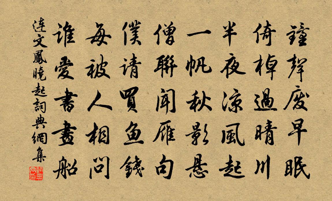 詩詞名句歷史字典書法欣賞書法字典國語詞典說文解字康熙字典古漢語字典標 題 作 者 詩 句 曉起作者:連文鳳 朝代:宋代曉起原文鐘聲廢早眠,倚棹過晴川。半夜涼風起,一帆秋影懸。僧聯聞雁句,仆請買魚錢。每被人相問,誰愛書畫船。詩詞問答問:曉起的作者是誰?答:連文鳳問:曉起寫於哪個朝代?答:宋代連文鳳曉起書法欣賞曉起書法作品詩詞推薦次韻敘李提刑往臨先正治並所聞先正論桃源事項安世〔宋代〕疇昔拜臞仙,桃源問果然。洞非人世外,花在此心邊。寂寂蒸霞地,沉沉浴日天。南陽劉子驥,獨泛問津船。春中司空圖〔唐代〕伏溜侵階潤,繁花隔竹香。嬌鶯方曉聽,無事過南塘。李粹伯侍御輓詞二首范成大〔宋代〕公昔參敷納,人期到辨章。珠光空月皎,玉氣忽虹藏。歲晚東方騎,生平北海觴。玳簪風雨散,幾客奠楸行?鷓鴣天韓元吉〔宋代〕萬古光寒太白精。直宜分作兩郎星。不然安得難兄弟,先後堯蓂三莢生。霜月冷,斗杓橫。老人今夜已齊明。他年賚佚名〔先秦〕文王既勤止,我應受之。敷時繹思,我徂維求定。時周之命,於繹思。近況鄧林〔宋代〕近況只如此,深山無見聞。二中猶學道,三上漫攻文。芸葉春繙日,梨花曉夢雲。添香仍煮茗,嚴敬事天君。彥通叔祖約游雲水寺二首楊萬里〔宋代〕竹深草長綠冥冥,有路如無又斷行。風亦恐吾愁寺遠,殷懃隔雨送鍾聲。柳李商隱〔唐代〕曾逐東風拂舞筵,樂遊春苑斷腸天。如何肯到清秋日,已帶斜陽又帶蟬。應百里李天益來求作奉川十詠似之龍松陳著〔宋代〕皮皴肉緊發蒼然,伏雪眠風傲歲年。不見南陽龍臥者,本心元自直通天。郡王閣端午帖子夏竦〔宋代〕彤闈永奉千年慶,金策將封一字王。佇向景風承異渥,預從佳節納多祥。壯椿歲(壽趙丞相)佚名〔宋代〕恭審某官間期淑氣,特立高標。仰維岳之生賢,一朝獻頌;賦緇衣而入相,四海同聲。欣逢五百年之期,願上八千句王蘧〔宋代〕繡裳畫袞雲垂地。維摩詰畫贊黃庭堅〔宋代〕維摩無病自灼灸,不二門開休闖首。文殊讚嘆辜負人,不如趙州放笤帚。不二法門無別路,諸方臨水不敢渡。鶖子華山畿·啼相憶佚名〔南北朝〕啼相憶,淚如漏刻水,晝夜流不息。風舒岳祥〔宋代〕太虛無朕兆,因物見形聲。入竹須搶地,驅潮欲打城。八方隨氣轉,萬里掃塵清。反從虎嘯生。八月十四夜月范仲淹〔宋代〕光華豈不盛,賞宴尚遲遲。天意將圓夜,人心待滿時。已知千里共,猶訝一分虧。來夕如澄霽,清風不負期。溪上夜釣陸游〔宋代〕少時妄意學金丹,八十溪頭把釣竿。露濕茭叢姑惡哭,煙深沙渚鷺鷥寒。登臨每嘆乾坤大,強健猶應歲月寬。作意偈傾一百三十三首釋法薰〔宋代〕東頭貴買,西頭賤賣。田地穩密衲僧,不妨遊戲自在。飯保褔陸游〔宋代〕簁雨雲低未放晴,閉門作病憶閒行。攝衣丈室參耆宿,曳杖長廊喚弟兄。飽飯即知吾事了,免官初覺此身輕。歸來題上虞縣信芳堂戴復古〔宋代〕河陽種桃彭澤柳,歲歲春風夸不朽。何如君種一池蓮,開向五月六月天。紅妝當暑清無汗,綠葉染風香不斷。坐令名句推薦試問春歸誰得見?飛燕,來時相遇夕陽中。辛棄疾《定風波·暮春漫興》 今朝有酒今朝醉,莫管門前是與非。吳承恩《西遊記·第五回》 牛羊自歸村巷,童稚不識衣冠。王維《田園樂七首·其四》 人怕三見面,樹怕一墨線。佚名《增廣賢文·下集》 命里有時終須有,命里無時莫強求。佚名《增廣賢文·上集》 世事漫隨流水,算來一夢浮生。李煜《烏夜啼·昨夜風兼雨》 見人不正,雖貴不敬也;見人有污,雖尊不下也。司馬遷《史記·日者列傳》 二月湖水清,家家春鳥鳴。孟浩然《春中喜王九相尋 / 晚春》 犯刑若履虎,不畏落爪牙。李白《秦女休行》 濤瀾洶湧,風雲開闔。蘇轍《黃州快哉亭記》