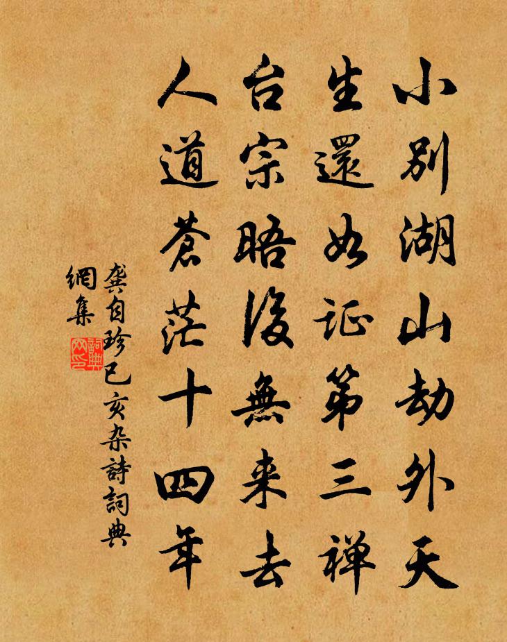 詩詞名句歷史字典書法欣賞書法字典國語詞典說文解字康熙字典古漢語字典標 題 作 者 詩 句 已亥雜詩 151作者:龔自珍 朝代:清代已亥雜詩 151原文小別湖山劫外天,生還如證第三禪。台宗晤後無來去,人道蒼茫十四年。詩詞問答問:已亥雜詩 151的作者是誰?答:龔自珍問:已亥雜詩 151寫於哪個朝代?答:清代問:龔自珍的名句有哪些?答:龔自珍名句大全龔自珍已亥雜詩 151書法欣賞已亥雜詩 151書法作品詩詞推薦惜春傷同幕故人孟郎中兼呈去年看花友李益〔唐代〕畏老身全老,逢春解惜春。今年看花伴,已少去年人。終南山二十韻李洞〔唐代〕關內平田窄,東西截杳冥。雨侵諸縣黑,雲破九門青。暫看猶無暇,長棲信有靈。古苔秋漬斗,積霧夜昏螢。怒恐社鼠曾豐〔宋代〕依附宜靈寢陸梁,乘人切忌肆為殃。不知貓在旁窺伺,才墮其機輒中腸。頌古四十五首釋如珙〔宋代〕塵中辨主問岩頭,心識如何曾得休。鼻孔眼睛都要見,銅沙鑼里滿盛油。蘇武慢 鳴鶴餘音全真馮尊師,本燕趙書生,虞集〔元代〕曲,高潔雄暢,最傳者蘇武慢二十篇。前十篇道遺世之樂,後十篇論修仙之事。曾稽費無隱獨善歌之,聞者有凌雲點絳唇 春雨後小桃王惲〔元代〕端正樓空,一枝春色誰偷得。夜來訊息。暮雨胭脂濕。倚竹佳人,翠袖嬌無力。須相覓。一尊休惜。轉首春狼藉。秋月楊萬里〔宋代〕夜氣涼於水,高齋可當樓。古來除卻月,此外更無秋。寒入蘭心勁,光隨菊腳流。惟愁清不極,清極卻成愁。送入我門來(除夕)胡浩然〔宋代〕荼壘安扉,靈馗掛戶,神儺烈竹轟雷。動念流光,四序式周回。須知今歲今宵盡,似頓覺明年明日催。向今夕,是醉中歌李新〔宋代〕駱夫子,逢惡客,酒食未闌客呼索。燭花銷鑠不肯起,口縱長歌手彈拍。一年所得能幾許,一日散盡何所惜。囊無和人春雪王令〔宋代〕莫嘆年來雪句遲,雪遲詩句更依微。風來海國鹽波涸,春人仙田玉氣肥。雛鶴暖嬌搖羽脫,老龍枯癢退鱗飛。天工徐偃王廟劉克莊〔宋代〕仁暴由來各異施,秦徐至竟孰雄雌。君看驪岫今無墓,得似柯山尚有祠。戲洪丞鄧肅〔宋代〕萬里歸來雲水鄉,逢春得酒且彷徨。好賢誰似雙松吏,使我時終一石狂。忽與高唐來鼠目,卻令朱戶鎖梅妝。先生丙子仲冬紫閣寺聊句蘇舜元〔宋代〕白石太古水,蒼厓六月冰。昏明咫尺變,身世逗留增。橋與飛霞亂,人間獨鳥升。風泉冷相搏,樓閣暮逾澄。反覆滿江紅范成大〔宋代〕山繞西湖,曾同泛、一篙春綠。重會面、未溫往事,先翻新曲。勁柏喬松霜雪後,知心惟有孤生竹。對荒園、猶解山居二首於石〔宋代〕不談當世事,榮辱兩無聞。詩思半山月,生涯一塢雲。硯乾分瀑潤,香斷借蘭熏。有客時相過,呼兒采澗芹。出郭晚回陳杰〔宋代〕昧谷含涼景,環塗進晚程。角聲呼月出,鞭影御風行。雲樹故多思,暗泉偏有情。臨關不得下,回首愧塵纓。水調歌頭曾布〔宋代〕●排遍第一魏豪有憑燕,年少客幽并。擊球鬥雞為戲,遊俠久知名。因避仇、來東郡。元戎留屬中軍。直氣凌貔虎禁林讌會之什蘇易簡〔宋代〕雨晴禁署絕纖塵,讌會名賢四海聞。供職盡居清顯地,崇儒同感聖明君。翩然飛白璇題字,煥若丹青翠琰文。梓澤感皇恩 張子京以春台子瞻椅見許,以詞催之劉敏中〔元代〕公子說春台,其光如水。相對偏宜子瞻椅。老父危坐,不覺耳聞心喜。慨然都見許,情何已。禪榻鬢絲,繩床烏幾舞曲歌辭白紵歌二首王建〔唐代〕天河漫漫北斗粲,花中烏啼知夜半。新縫白紵舞衣成,來遲邀得吳王迎。低鬟轉花掩雙袖,玉釵浮動秋風生。酒多名句推薦借問江潮與海水,何似君情與妾心?白居易《浪淘沙·借問江潮與海水》 首夏猶清和,芳草亦未歇。謝靈運《游赤石進帆海》 芳洲拾翠暮忘歸,秀野踏青來不定。張先《木蘭花·乙卯吳興寒食》 人之事兄,不可同於事父,何怨愛弟不及愛子乎?顏之推《顏氏家訓·兄弟篇》 相思一夜窗前夢,奈個人、水隔天遮。王沂孫《高陽台·和周草窗寄越中諸友韻》 羌笛何須怨楊柳,春風不度玉門關。王之渙《涼州詞二首·其一》 紫塞門孤,金河月冷,恨誰訴?朱彝尊《長亭怨慢·雁》 人之生也柔弱,其死也堅強。草木之生也柔脆,其死也枯槁。故堅強者死之徒,柔弱者生之徒。老子《老子·德經·第七十六章》 旅客三秋至,層城四望開。杜審言《登襄陽城》 鎖離愁,連綿無際,來時陌上初熏。韓縝《鳳簫吟·鎖離愁》