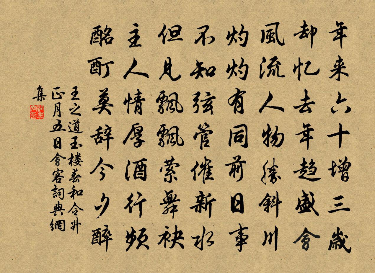 詩詞名句歷史字典書法欣賞書法字典國語詞典說文解字康熙字典古漢語字典標 題 作 者 詩 句 玉樓春(和令升正月五日會客)作者:王之道 朝代:宋代原文年來六十增三歲。卻憶去年趨盛會。風流人物勝斜川,灼灼有同前日事。不知弦管催新水。但見飄飄縈舞袂。主人情厚酒行頻,酩酊莫辭今夕醉。詩詞問答問:《玉樓春(和令升正月五日會客)》的作者是誰?答:王之道問:該詩寫於哪個朝代?答:宋代問:該詩是什麼體裁?答:詞書法欣賞玉樓春(和令升正月五日會客)書法作品詩詞推薦依韻和表臣奎野亭梅堯臣〔宋代〕淮光抱城去,山翠落樽前。魯叟欲浮海,楚人休問天。野雲將拂幔,水鳥不驚船。歷覽誰能賦,今聞太守賢。鐵壁釋普寧〔宋代〕剛然隔斷太虛空,縫罅渾無拶不通。頑鈍碓夫覷不破,倩人書處轉乖宗。無題唐寅〔明代〕領解皇都第一名,猖披歸臥舊茅蘅。立錐莫笑無餘地,萬里江山筆下生。吳中言懷寄南海二同年皮日休〔唐代〕曲水分飛歲已賒,東南為客各天涯。退公只傍蘇勞竹,移宴多隨末利花。銅鼓夜敲溪上月,布帆晴照海邊霞。三年去不返曹鄴〔唐代〕寒女不自知,嫁為公子妻。親情未識面,明日便東西。但得上馬了,一去頭不回。雙輪如鳥飛,影盡東南街。九重聞笛董嗣杲〔宋代〕淒淒吹笛裂寒雲,羈客難禁醒坐聞。聲逐逝波流不斷,月明吹老戌回軍。送壽芳恭三友歸安吉釋行海〔宋代〕此心偏向寂寥難,學至寂寥心自安。楊柳忽驚秋色晚,芭蕉不耐雨聲寒。白雲深處人相別,明月圓時我獨看。極目水調歌頭張元乾〔宋代〕縹緲九仙閣,壯觀在人間。涼飆乍起,四圍晴黛入闌乾。已過中秋時候。便是菊花重九。為壽一尊歡。今古登高意泊釣台毛幵〔宋代〕白鶴千秋去不歸,山川蕭瑟閟光輝。孫郎祖墓今無主,不及先生一釣磯。寄崔先生溫庭筠〔唐代〕往年江海別元卿,家近山陽古郡城。蓮浦香中離席散,柳堤風裡釣船橫。星霜荏苒無音信,煙水微茫變姓名。菰黍秦女行曾季貍〔宋代〕姜家家世居淮海,郎罷聲名傳海內。自從貶死古藤州,門戶凋零三十載。可憐生長深閨里,耳濡目染知文字。亦嘗詠竹袁燮〔宋代〕此君林下靜無塵,苗裔生來便逸群。頭角嶄然圓玉峙,養成直節要凌雲。題天開圖畫白玉蟾〔宋代〕四時風物現安排,醉上高樓肯豁開。雲散遠山元不斷,池成明月自然來。夕陽妝點丹青樹,煙雨和勻水墨梅。此是和子由踏青蘇軾〔宋代〕東風陌上驚微塵,遊人初樂歲華新。人閒正好路傍飲,麥短未怕游車輪。城中居人厭城離,喧闐曉出空四鄰。歌鼓寄秦州田元均歐陽修〔宋代〕由來邊將用儒臣,坐以威名撫漢軍。萬馬不嘶聽號令,諸蕃無事著耕耘。夢回夜帳聞羌笛,詩就高樓對隴雲。莫忘悼靈隱性侍者釋雲岫〔宋代〕三喚聲中負不平,與師百萬欲干城。誰知菡萏峰前路,削木書名有伏兵。諸人頗有和余百梅詩者各賦一首劉克莊〔宋代〕字字追還水部公,篇篇壓倒後村翁。可憐和靖拘香影,更笑花光著色空。自許鐵心堅晚節,渠能粉面向春風。菁華春日田園雜興三首戴東老〔宋代〕飲了椒盤收了燈,翁摧稚子步新晴。茅柴初熟勝胝醖,萊服久半宜晚羹。伏卯難留上春種,出欄牛試吉辰耕。去年和前人觀梅雪有懷見寄辛棄疾〔宋代〕相思幾欲扣停雲,抱疾還嗟老不文。滿眼梅花深雪片,何人野鶴在雞群。詩肩相見高如舊,酒甲而今蘸幾分。且向慧和微以布衫送壽昌可師有偈答之戲成四首釋慧空〔宋代〕一物全無盡力擔,相逢江北又江南。向來貼肉那堪語,更著渠儂一布衫。名句推薦蕭條亭障遠,悽慘風塵多庾信《擬詠懷二十七首·其二十六》 飛流直下三千尺,疑是銀河落九天。李白《望廬山瀑布》 香到酴醾送晚涼,荇風輕約薄羅裳。曲闌憑遍思偏長。葉小鸞《浣溪沙·初夏》 林斷山明竹隱牆。亂蟬衰草小池塘。蘇軾《鷓鴣天·林斷山明竹隱牆》 近來何處有吾愁,何處還知吾樂。辛棄疾《念奴嬌·賦雨岩》 親賢臣,遠小人。諸葛亮《出師表/前出師表》 綠遍山原白滿川,子規聲里雨如煙。翁卷《鄉村四月》 羌管悠悠霜滿地,人不寐,將軍白髮征夫淚。范仲淹《漁家傲·秋思》 執一者至貴也,至貴者無敵。呂不韋《呂氏春秋·覽·離俗覽》 有約不來過夜半,閒敲棋子落燈花。趙師秀《約客》