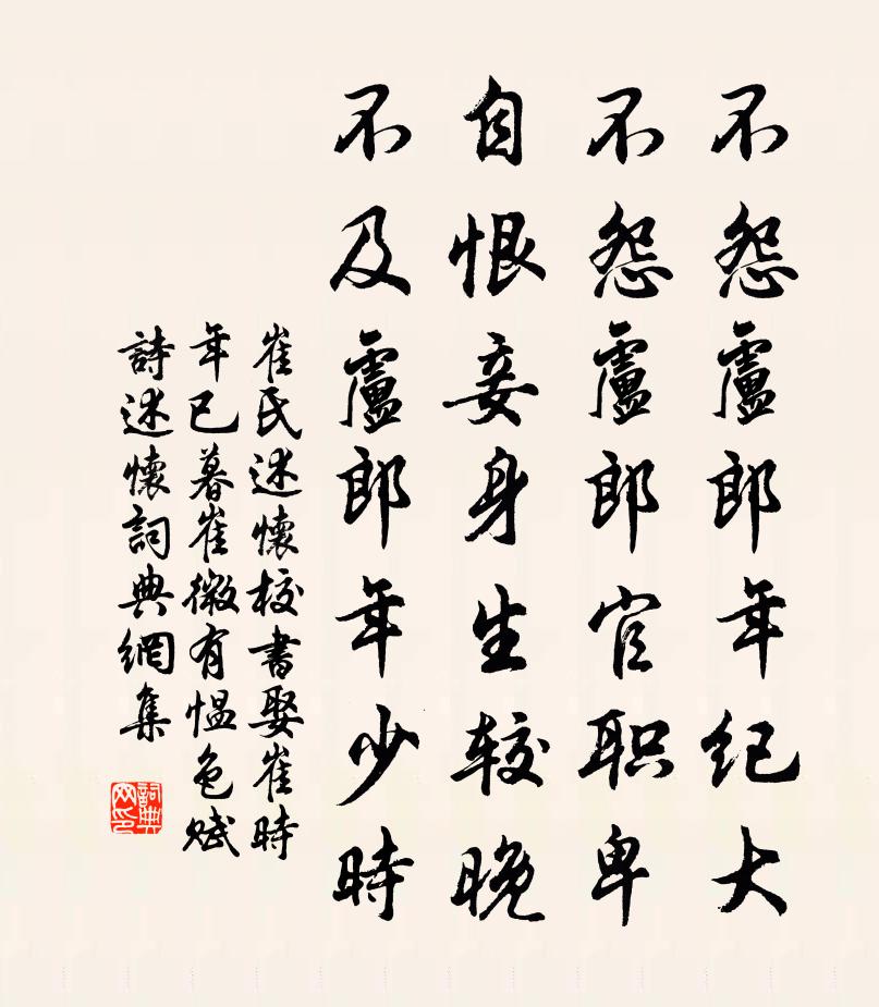 詩詞名句歷史字典書法欣賞書法字典國語詞典說文解字康熙字典古漢語字典標 題 作 者 詩 句 述懷(校書娶崔時年已暮崔微有慍色賦詩述懷)作者:崔氏 朝代:唐代原文不怨盧郎年紀大,不怨盧郎官職卑。自恨妾身生較晚,不及盧郎年少時。詩詞問答問:《述懷(校書娶崔時年已暮崔微有慍色賦詩述懷)》的作者是誰?答:崔氏問:該詩寫於哪個朝代?答:唐代書法欣賞述懷(校書娶崔時年已暮崔微有慍色賦詩述懷)書法作品注釋全唐詩:卷799-29詩詞推薦偈諸葛賡〔宋代〕上天下地極高深,紀化無蹤何處尋。山靜白雲歸洞口,水清明月落波心。虞美人(七夕悼亡)袁去華〔宋代〕娟娟缺月梧桐影。雲度銀潢靜。夜深檐隙下微涼。醒盡酒魂何處、藕花香。鵲橋初會明星上。執手還惆悵。莫嗟相次公滿秩來歸,偶上已、寒食同日,父子小酌楊萬里〔宋代〕又是一年修禊時,何須曲水泛金卮。遍嘗眾酒少亦醉,坐到三更眠未遲。上已巧當寒食日,春風慳放牡丹枝。白頭送浮屠善慧東遊王之道〔宋代〕西去方祈谷,東來適佩萸。淒風梧脫葉,積雨稻生蚨。詩骨寒岩木,禪心古廟爐。莫將明月句,容易謁姑蘇。紀夢曲薛師石〔宋代〕夜夢佳人姱且長,星冠霞帔雲衣裳。雙眉淺淡畫春色,兩耳炫濯垂珠璫。細步逡巡倏相近,世道人情不敢問。斂容和吳中復江瀆泛舟謝景初〔宋代〕雨飛暑館變秋堂,息駕林祠意緒長。筍脫萬苞風韻玉,蓮開百畝水浮香。揪盤力戰棋忘味,筠簟清吟扇遞涼。心惜寄酬楊齊伯少卿陸游〔宋代〕楊卿人材金百鏈,岐公座上初識面。十年萬事不須說,猶喜歸來且強健。題詩想見初削瓜,寄到茆堂已歸燕。辭嚴大風陸游〔宋代〕風大連三夕,衰翁不出門。兒言卷茅屋,奴報徹蘆藩。狼藉鴉擠壑,縱橫葉滿園。乘除有今旦,紅日上車軒。句釋惠崇〔宋代〕湘雲隨雁斷,楚路背人遙。登九里台是樊姬墓張說〔唐代〕楚國所以霸,樊姬有力焉。不懷沈尹祿,誰諳叔敖賢。萬化茫無在,孤墳獨巋然。北分陽台陌,南識郢城阡。漠漠梅花鄭會〔宋代〕江梅谷尋樹槎牙,雪片飄零梅片斜。半有和風到窗紙,不知是雪是梅花。秋訪江上友生所居寇準〔宋代〕苔石半寥落,坐來生遠愁。故人應罷釣,寒葉自驚秋。村隔平沙暝,江和暮靄流。徘徊不能去,此處有扁舟。侯公謹輓詞林季仲〔宋代〕富貴功名等弁髦,何如聲跡翳蓬蒿。倦遊正被微官縛,辭祿方知處士高。華萼向來榮父行,芝蘭重見秀兒曹。寄言句濟州太守〔宋代〕鸚鵡能言爭似鳳。偶賦二首羅公升〔宋代〕巢由善擇富,四海不易牛。古人恥苟得,一粟懷十憂。誰雲黃屋榮,可掩頳面羞。那知井裡蛙,錙銖重山丘。肝腸送梁李二明府陳子昂〔唐代〕負書猶在漢,懷策未聞秦。復此窮秋日,芳樽別故人。黃金裝屢盡,白首契逾新。空羨雙鳧舄,俱飛向玉輪。天津橋白居易〔唐代〕津橋東北斗亭西,到此令人詩思迷。眉月晚生神女浦,臉波春傍窈娘堤。柳絲裊裊風繰出,草縷葺葺雨剪齊。報導吳門行劉翰〔宋代〕吳歌婉婉清如水,西風曉自閶門起。雙橈艇子采菱來,翠荇綠濱香十里。芙蓉影落已知秋,濺濕羅衣眉黛愁。回聲劉無虞尊人輓詩二首張嵲〔宋代〕蓄德竟不耀,坐觀門戶成。生無三事貴,祿有萬鍾榮。色養無違志,陵終若事生。秋風如罔極,蕭瑟在松聲。題越人賀韓司戶令子得舉詩卷葛紹體〔宋代〕一鶚秋風東越初,龍門春浪少躊躇。客來多說新河過,古柳陰中聞讀書。名句推薦西窗下,風搖翠竹,疑是故人來。秦觀《滿庭芳·碧水驚秋》 雲山有意,軒裳無計,被西風吹斷功名淚劉致《山坡羊·燕城述懷》 隨侯之珠,國寶也,然用之彈,曾不如泥丸劉向《說苑·雜言》 寒山轉蒼翠,秋水日潺湲。王維《輞川閒居贈裴秀才迪》 形在江海之上,心存魏闕之下劉勰《文心雕龍·神思》 柳下繫舟猶未穩,能幾日、又中秋。劉過《唐多令·蘆葉滿汀洲》 悲歡離合總無情。一任階前、點滴到天明。蔣捷《虞美人·聽雨》 秋氣堪悲未必然,輕寒正是可人天。楊萬里《秋涼晚步》 明朝寒食了,又是一年春。顧太清《臨江仙·清明前一日種海棠》 兩岸猿聲啼不住,輕舟已過萬重山李白《早發白帝城/白帝下江陵》