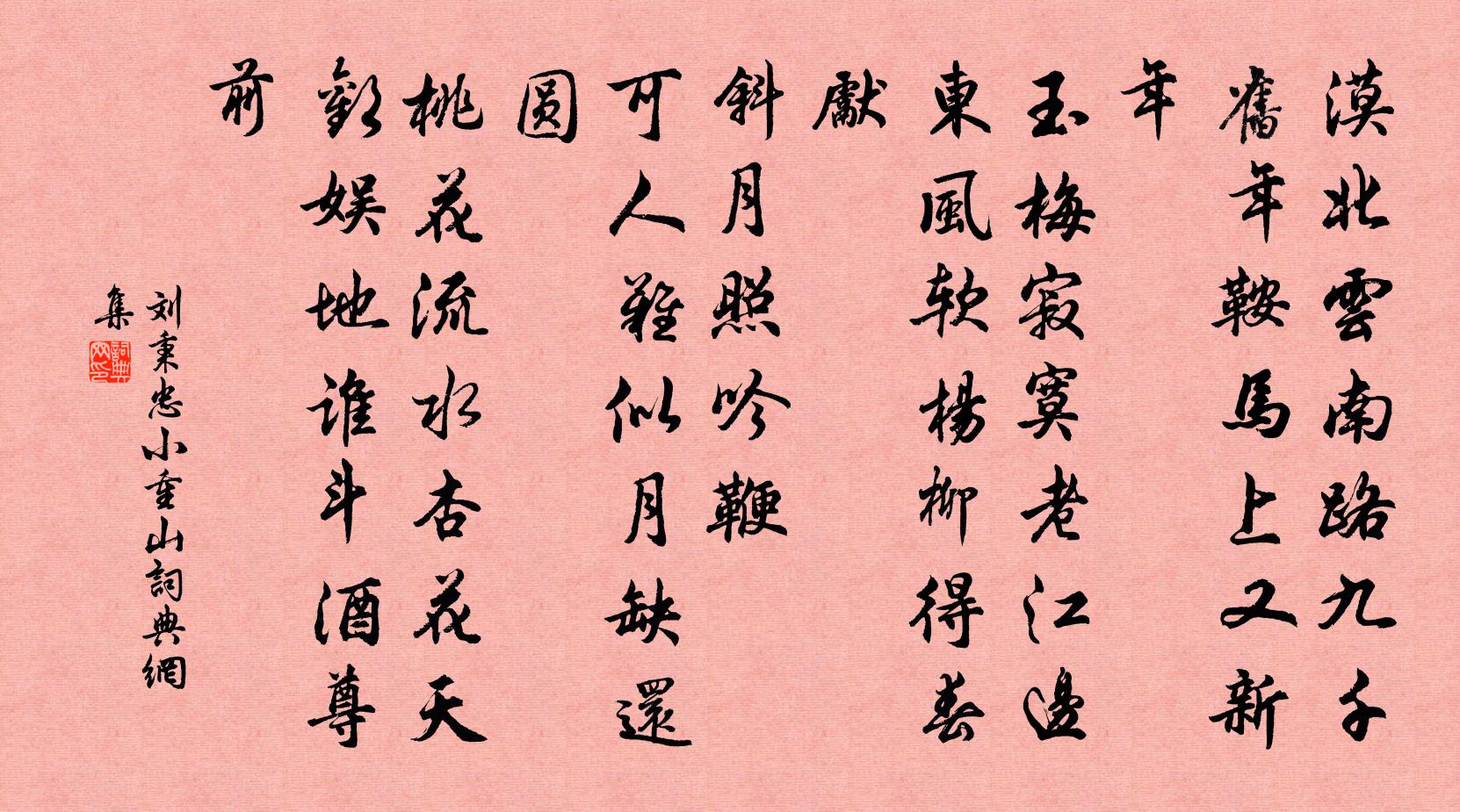 詩詞名句歷史字典書法欣賞書法字典國語詞典說文解字康熙字典古漢語字典標 題 作 者 詩 句 小重山作者:劉秉忠 朝代:元代小重山原文漠北雲南路九千。舊年鞍馬上、又新年。玉梅寂寞老江邊。東風軟,楊柳得春先。斜月照吟鞭。可人難似月、缺還圓。桃花流水杏花天。歡娛地,誰斗酒尊前。詩詞問答問:小重山的作者是誰?答:劉秉忠問:小重山寫於哪個朝代?答:元代問:小重山是什麼體裁?答:詞劉秉忠小重山書法欣賞小重山書法作品詩詞推薦句張載〔宋代〕旭燕羈鴻共斷魂,荻花楓葉泊孤村。句彭奭〔宋代〕六龍極北瞻明主,三鳳河東愧腐儒。端午行葉適〔宋代〕仙門諸水,會流下瓦窰溝。中有吊湘客,西城南北樓。旗翻稻花風,棹澀梅子雨。夜邏無騷音,絳紗蒙首去。品令 清明夜,夢酒間唱田不伐映竹園啼鳥樂元好問〔金代〕西齋向曉。窗影動、人聲悄。夢中行處,數枝臨水,幽花相照。把酒長歌,猶記竹間啼鳥。風流易老。更常被、閒灞東題司馬郊園(一作題張司馬灞東郊園)許渾〔唐代〕楚翁秦塞住,昔事李輕車。白社貧思橘,青門老仰瓜。讀書三徑草,沽酒一籬花。更欲尋芝朮,商山便寄家。游齊山寺蘇元鼎〔宋代〕秋浦齊山寺,峰巒楚楚長。岩根堆雁塔,溪角架虹梁。雨過聞幽磬,雲開見上方。苔侵石磴滑,花擁洞門香。禪客聽琴佚名〔宋代〕六律鏗鏘間宮徵,伶倫寫入梧桐尾。七條瘦玉叩寒星,萬派流泉哭纖指。空山雨腳隨雲起,古木燈青嘯山鬼。田文臨江仙辛棄疾〔宋代〕春色饒君白髮了,不妨倚綠偎紅。翠鬟催喚出房櫳。垂肩金縷窄,蘸甲寶杯濃。睡起鴛鴦飛燕子,門前沙暖泥融。題凝雪水仙圖王冕〔元代〕出門大江橫,銀濤數千頃。仙子御輕飈,環佩搖虛影。中宵月無光,天地冰壺淨。輕盈何所之?飛夢西湖冷。朱字蘭亭方回〔宋代〕傾城國色著胭脂,紅字蘭亭又出奇。比換鵝書更姿媚,一杯卯酒醉西施。壯椿歲(壽趙丞相)佚名〔宋代〕恭審某官間期淑氣,特立高標。仰維岳之生賢,一朝獻頌;賦緇衣而入相,四海同聲。欣逢五百年之期,願上八千太常引 寄酒泉帥張奧子明,子明鄠陽關去酒元好問〔金代〕田園松菊自由身。鞍馬老紅塵。鵝鴨惱比鄰。算未羨、凌煙寫真。花時風雨,長年哀樂,白髮為誰新。休唱渭城春得親老家問楊萬里〔宋代〕節里難為客,家中數有書。慈親問皎否,意緒各何如。強酒那能盡,添愁不更除。舊來貧未仕,父子豈相疏。和禮之喜雪十二韻強至〔宋代〕水官司冬不舉職,天地當凜氣輒溫。頑風伺隙倒天令,掃蕩不使繁雲屯。陰崖邃谷殆窮臘,空有雪意乘朝昏。宿荄道中口占呈能之徐僑〔宋代〕闕然不見懷千慮,特地相過無一言。平日交情如水淡,暫時客里似春溫。酒隨深淺有餘味,事向細微無不論。漫道使次安陸寄友人劉長卿〔唐代〕新年草色遠萋萋,久客將歸失路蹊。暮雨不知溳口處,春風只到穆陵西。孤城盡日空花落,三戶無人自鳥啼。君在蘇武慢虞集〔元代〕憶昔坡仙,夜遊赤壁,孤鶴掠舟西過。英雄消盡,身世茫然,月小水寒星火。何似漁翁,不知今古,醉傍蓼花然火寄題清軒二首劉子翬〔宋代〕中郎言語妙天下,曾向軒中記舊遊。一尺翠珉揮染罷,冰輪夜轉屋山頭。秋閨王同祖〔宋代〕西風昨夜到庭梧,曉看窗前一葉無。秋月照人眠不得,等閒拈弄繡工夫。好事近朱雍〔宋代〕春事為誰來,枝上半留殘雪。恰近小園香徑,對霜林寒月。危闌淒斷笛聲長,吹到偏嗚咽。最好短亭歸路,有行人名句推薦長他人志氣,滅自己威風。張南莊《何典·第十回》 東岩富松竹,歲暮幸同歸。王勃《送盧主簿》 衣懶換,酒難賒。可憐此夕看梅花。吳文英《思佳客·癸卯除夜》 柴門聞犬吠,風雪夜歸人。劉長卿《逢雪宿芙蓉山主人》 少年射虎名豪,等閒赤羽千夫膳元好問《水龍吟·從商帥國器獵於南陽同仲澤鼎玉賦此》 夢回芳草思依依,天遠雁聲稀。李煜《喜遷鶯·曉月墜》 處世不退一步處,如飛蛾投燭、羝羊觸藩,如何安樂?洪應明《菜根譚·概論》 漢將歸來虜塞空,旌旗初下玉關東。戎昱《塞下曲》 坡謂西湖,正如西子,濃抹淡妝臨鏡台。劉過《六州歌頭·寄稼軒承旨》 隨風潛入夜,潤物細無聲。杜甫《春夜喜雨》