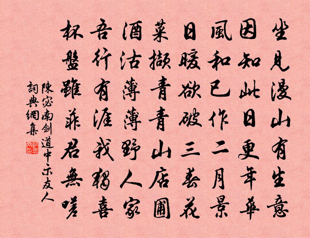詩詞名句歷史字典書法欣賞書法字典國語詞典說文解字康熙字典古漢語字典標 題 作 者 詩 句 南劍道中示友人作者:陳宓 朝代:宋代南劍道中示友人原文坐見漫山有生意,因知此日更年華。風和已作二月景,日暖欲破三春花。菜擷青青山店圃,酒沽薄薄野人家。吾行有涯我獨喜,杯盤雖菲君無嗟。詩詞問答問:南劍道中示友人的作者是誰?答:陳宓問:南劍道中示友人寫於哪個朝代?答:宋代陳宓南劍道中示友人書法欣賞南劍道中示友人書法作品詩詞推薦徵招(和煥甫秋聲。君有遠遊之興,為首行路難以感之)彭元遜〔宋代〕人間無欠秋風處,偏到霜痕月杪。風雨船篷,日夜風波未了。忽潮生海立,又天闊、江清欲曉。孤迥幽深,激揚悲江陵和費察推九蕊瑞蓮韻李曾伯〔宋代〕喜對荊人一笑嫣,吾邦今見此嘉蓮。脂容嫵媚目疑幻,玉貌參差骨是仙。試把萬葩千卉較,曾無一蒂九芳連。分明寄田郎姜夔〔宋代〕楚楚田郎亦大奇,少年風味我曾知。春城寒食誰相伴,夜月犁花有所思。剪燭屢呼金鑒落,倚窗閒品玉參差。含情阿幾張耒〔宋代〕小兒名阿幾,眉目頗疏明。日來書案傍,學我讀書聲。男兒事業多,何必學讀書。自古奇男子,往往羞為儒。阿幾到房山交代招飲四首袁說友〔宋代〕妓圍檐額潤空青,岫幌雲關夜不扃。吏隱風流輸我輩,不須逋客詫山靈。臨江仙(送羅倅·偉卿權新州)洪适〔宋代〕遠駕星屏臨百粵,康沂戶戶歌功。使君五馬去乘驄。賣刀無曠土,贈扇有仁風。莫唱渭城朝雨曲,片帆時暫西東。早發洛中許棠〔唐代〕半夜發清洛,不知過石橋。雲增中嶽大,樹隱上陽遙。塹黑初沉月,河明欲認潮。孤村人尚夢,無處暫停橈。嵩山十志十首金碧潭盧鴻一〔唐代〕水碧色兮石金光,灩熠熠兮濙湟湟。泉葩映兮煙蔦臨,紅灼灼,翠陰陰。翠相鮮兮金碧潭,霜天洞兮煙景涵。有幽棘隱壁三首白玉蟾〔宋代〕幽鳥噪岩谷,寒煙鎖薜蘿。忽遇金蟾蜍,無人自呵呵。初夏閒居陸游〔宋代〕松棚黯黯接虛堂,掃地燒香旋置床。密葉留花供淺酌,斷雲障日作微涼。高城薄暮聞吹角,小市豐年有戲場。白首贈仙居宰陳述古鄭穆〔宋代〕我愛仙居宰,隆時起四方。青衿游戶闥,逢掖在軒堂。自昔風蠻貊,於今邑校庠。賀衙聞勸學,耆耋涕彷徨。納涼王維〔唐代〕喬木萬餘株,清流貫其中。前臨大川口,豁達來長風。漣漪涵白沙,素鮪如游空。偃臥盤石上,翻濤沃微躬。漱流曹叔時見過索餞篇陳深〔宋代〕泄雲蒙朝日,微雨沾庭除。幽人掩財臥,門外無來車。曹子別經歲,枉道過我廬。謂余抱文藝,胡為守鄉閭。余日句錢惟演〔宋代〕綠野桑麻連四水,黃堂歌吹擁千兵。鮑防員外見尋因書情呈贈(曾與系同舉場)秦系〔唐代〕少小為儒不自強,如今懶復見侯王。覽鏡已知身漸老,買山將作計偏長。荒涼鳥獸同三徑,撩亂琴書共一床。猶有減字木蘭花(紀壁間題)辛棄疾〔宋代〕盈盈淚眼。往日青樓天樣遠。秋月春花。輸與尋常姊妹家。水村山驛。日暮行雲無氣力。錦字偷裁。立盡西風雁不詔放雲南子弟還國鄭洪業〔唐代〕德被陪臣子,仁垂聖主恩。雕題辭鳳闕,丹服出金門。有澤沾殊俗,無征及獷犭軍 。銅梁分漢土,玉壘駕鸞軒。過魏文貞公舊庄張舜民〔宋代〕破屋居人少,柴門春草長。兒童不識字,耕稼鄭公莊。送邊上從事周繇〔唐代〕戎裝佩鏌鋣,走馬逐輕車。衰草城邊路,殘陽壟上笳。黃河穿漢界,青冢出胡沙。提筆男兒事,功名立可夸。題金州西園九首松壇姚合〔唐代〕盤盤松上蓋,下覆青石壇。月中零露垂,日出露尚漙。山翁稱絕境,海橋無所觀。名句推薦今日獨來香徑里,更無人跡有苔錢。韓偓《寒食日重遊李氏園亭有懷》 自勝之謂強。韓非及後人《韓非子·喻老》 壽酒還嘗藥,晨餐不薦魚。錢起《送外甥懷素上人歸鄉侍奉》 晚鴉飛去,一枝花影送黃昏夏完淳《婆羅門引·春盡夜》 佳人應怪我,別後寡信輕諾。柳永《尾犯·夜雨滴空階》 美成在久,惡成不及改莊子《莊子·內篇·人間世》 八陣圖名成臥龍,六韜書功在飛熊。查德卿《蟾宮曲·懷古》 野水參差落漲痕,疏林欹倒出霜根。蘇軾《書李世南所畫秋景二首》 俱懷逸興壯思飛,欲上青天攬明月。李白《宣州謝朓樓餞別校書叔雲》 惟上惟己,去表求實,奸者自見矣。來俊臣《羅織經·察奸卷第八》