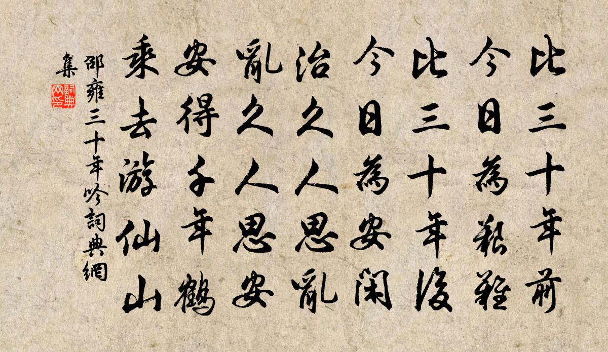 詩詞名句歷史字典書法欣賞書法字典國語詞典說文解字康熙字典古漢語字典標 題 作 者 詩 句 三十年吟作者:邵雍 朝代:宋代三十年吟原文比三十年前,今日為艱難。比三十年後,今日為安閒。治久人思亂,亂久人思安。安得千年鶴,乘去遊仙山。詩詞問答問:三十年吟的作者是誰?答:邵雍問:三十年吟寫於哪個朝代?答:宋代邵雍三十年吟書法欣賞三十年吟書法作品詩詞推薦偈頌七十六首釋師觀〔宋代〕驀然平地一聲雷,驚得蟭螟眼豁開。是聖是凡俱不立,何妨隨處舞三台。懷舊第一百九文天祥〔宋代〕中夜懷友朋,百年見存沒。風吹蒼江樹,寒月照白骨。趣劉聖與寓王甫杜墅劉宰〔宋代〕門外平湖百頃寬,庭前翠竹繞欄乾。鳥啼花笑四時好,幾爭窗明六月寒。賸可琴書供晝永,不妨弦管到更闌。留行玉蝴蝶晁補之〔宋代〕暗憶少年豪氣,爛南國、蓬島風光。醉倚吳王宮殿,不解悲涼。舞猶慵、小腰似柳,歌尚怯、嬌語如簧。好林塘。喜張仲景范與蔡仲見過晁公溯〔宋代〕昔游房相湖,乃適與子逢。迨其景將入,不盡湖所窮。今子聯翩來,二難復相從。散策破莓苔,循池詠芙蓉。子勿次韻陳君實先生二首李彌遜〔宋代〕騎馬長安漫踽涼,幾番桃李艷晨妝。目官厭閱是非海,心地不聞知見香。九轉未能超北陸,一廛終待老南塘。會令蘭亭高翥〔宋代〕老來渾不愛春遊,來對蘭亭爛熳秋。亭下水非當日曲,山前竹似舊時修。二三客子因懷古,八百餘年續勝流。試與落葉釋正勤〔宋代〕蕭索下疏林,翩翩動客心。帶煙浮遠水,和露逐飛禽。近砌凋將盡,前村疊更深。年年見衰謝,看即二毛侵。詠燕子磯朱元璋〔明代〕燕子磯兮一秤砣,長虹作竿又如何。天邊彎月是釣鉤,稱我江山有幾多。偈頌一百零九首釋可湘〔宋代〕道道,非常道。踏不嗔,鬧浩浩。莫管自家知不知,但看大熟秋成早。今日無端入荒草。甲午秋作四壁絕題窗間劉宰〔宋代〕驛使掛來郡吏批,丁寧急急趁符移。兒童駭汗催科急,趣賀元來荷聖慈。偈頌一百零九首釋可湘〔宋代〕春山疊亂青,春水湛虛碧。豁開樓閣門,分身千百憶。一念差,雲羃羃,善財無路尋知識。留題石堂院章師古〔宋代〕何處足清涼,山南古石堂。溪沙留虎跡,水影上僧房。萬景因深僻,無人為發揚。侵苦寫澀句,筆凍不成行。蕭灑桐廬郡十絕范仲淹〔宋代〕蕭灑桐廬郡,全家長道情。不聞歌舞事,繞舍石泉聲。用老竹與子晦韻蒲壽宬〔宋代〕冰清玉潔好風襟,老屋淒涼興味深。身世已非塵外跡,語言猶是竹邊音。且陪此日鶯花樂,休憶當年燈火心。白髮謝朱鶴皋招飲四詩曹彥約〔宋代〕東皇無意染青紅,長養猶資五日風。收拾英華入新句,祥雲藹藹媚春空。飛龍引二首·其二李白〔唐代〕鼎湖流水清且閒,軒轅去時有弓劍,古人傳道留其間。後宮嬋娟多花顏,乘鸞飛煙亦不還,騎龍攀天造天關。造天春暮方岳〔宋代〕桃溪噴火柳拖煙,如豆青梅已半酸。燕子怯春歸未得,一簾風雨杏花寒。病起三首楊公遠〔宋代〕彈指嘆吟身,慳慳滿六旬。維摩寧久病,孺子豈長貧。雖欠詩邊興,還存筆底春。莫言憔悴損,梅瘦越精神。次韻張守與潤守總卿詩四首陳造〔宋代〕向我能忘勢,張侯卻甚真。頻分代舍飯,遣濯客裾塵。長日無知己,因君愛此身。可須砭劑力,振臂起漳濱。名句推薦官之友,民之敵;親之友,仇之敵,敵者無常也。來俊臣《羅織經·瓜蔓卷第十二》 人家見生男女好,不知男女催人老。王建《短歌行》 蜂兒不解知人苦,燕兒不解說人愁。程垓《最高樓·舊時心事》 恐斷紅、尚有相思字,何由見得。周邦彥《六醜·落花》 泛樓船兮濟汾河,橫中流兮揚素波。劉徹《秋風辭》 為上者疑,為下者懼。上下背德,禍必興焉。來俊臣《羅織經·事上卷第二》 一寸相思一寸灰。蘇軾《南鄉子·集句》 兄弟者,分形連氣之人也。顏之推《顏氏家訓·兄弟篇》 東風隨春歸,發我枝上花。李白《落日憶山中》 儉則傷事,侈則傷貨管仲《管子·乘馬》