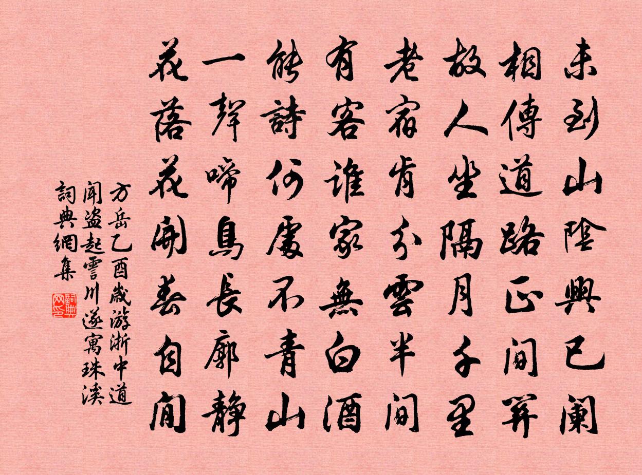 詩詞名句歷史字典書法欣賞書法字典國語詞典說文解字康熙字典古漢語字典標 題 作 者 詩 句 乙酉歲游浙中道聞盜起霅川遂寓珠溪作者:方岳 朝代:宋代原文未到山陰興已闌,相傳道路正間關。故人坐隔月千里,老宿肯分雲半間。有客誰家無白酒,能詩何處不青山。一聲啼鳥長廓靜,花落花開春自閒。詩詞問答問:《乙酉歲游浙中道聞盜起霅川遂寓珠溪》的作者是誰?答:方岳問:該詩寫於哪個朝代?答:宋代書法欣賞乙酉歲游浙中道聞盜起霅川遂寓珠溪書法作品詩詞推薦題李唐松月舒岳祥〔宋代〕明月青松枝,幽人岩下步。勸君早歸來,草頭已多露。嚴從禮求先照軒詩趙蕃〔宋代〕日上照萬物,心明觀一身。為光詎資火,在我不關人。焦山汪元量〔宋代〕焦山寺裏白雲堆,百尺危樓百尺台。持咒聖僧漂海去,尋訪閒客渡江來。雷轟古樹蜈公出,日轉虛檐燕子回。案上瑞鶴仙(友人買妾名雪香)蔣捷〔宋代〕素肌元是雪。向雪裡帶香,更添奇絕。梅花太孤潔。問梨花何似,風標難識。長洲漾楫。料鴛邊、嬌容乍折。對珠有美人兮四章趙友直〔宋代〕有美人兮,在天之北。懷之勿已,我心惻惻。忘歸鄧深〔宋代〕端能來作棲霞侶,從他浮世悲今古。翻憐春色滿天台,劉阮掉頭留不住。謝松野叔贈詩用首句驚舟出瞿塘還有平流安十羅公升〔宋代〕君字若修竹,瀟灑風雨秋。君詩若輕帆,滄海萬斛舟。快讀意自醒,痼疾一劑瘳。細讀殊味益,汲井百丈憂。送廷珍殿丞兄通判閬州、范祖禹〔宋代〕十年京洛弄殘書,喜見西歸別駕車。錦里追游貧莫厭,彩衣榮侍樂何如。詔條安遠民為本,才刃如君地有餘。不日寄題張商弼葵堂堂下元不種葵花但取面勢向陽楊萬里〔宋代〕主人未肯便山林,賞月吟風酒更琴。每一登堂一揩眼,誰知半點向陽心。句徐似道〔宋代〕北風萬籟自宮徵,南日一軒真袴襦。重憶山居六首。泰山石(兗州從事所寄)李德裕〔唐代〕雞鳴日觀望,遠與扶桑對。滄海似熔金,眾山如點黛。遙知碧峰首,獨立煙嵐內。此石依五松,蒼蒼幾千載。吏道高斯得〔宋代〕勞牽迫吏道,僒洪縻拘。九春回塵土,一跡園林無。直此休沐暇,偕我良知娛。殘梅謝眾卉,初柳荑僵株。四運巧長相思郭珏〔元代〕長相思,相思者誰?自從送上馬,夜夜愁空幃。曉窺玉鏡雙蛾眉,怨君卻是憐君時。湖水浸秋藕花白,傷心落日鴛郴江百詠並序寒泉阮閱〔宋代〕春欲為霜夏欲冰,一山寒氣逼人清。應知炎冷難同處,甘與湯泉各自生。鷓鴣天葛長庚〔宋代〕西畔雙松百尺長。當時親自見劉王。山前今日蓮花水,往者將軍洗馬塘。南粵路,漢宮牆。晚風歷歷說興亡。摩挲普賢台陳岩〔宋代〕石台宿草幾年荒,不比維摩獅子床。大士向來曾晏坐,是身如電暗回光。南澗樓王安石〔宋代〕撲撲煙嵐繞四阿,物華終恨未能多。故應陡起三千丈,始奈重山復嶺何。明發瀧頭楊萬里〔宋代〕黑甜偏至五更濃,強起侵星敢小慵。輸與山雲能樣嬾,日高猶宿夜來峰。余既和樂天詩而喜於年及之心猶不能自已又復吳芾〔宋代〕新歲妻孥慶七旬,遍賙鄰里及孤貧。高年滿座有醉客,丐者塞塗無餒人。平日要同人喜樂,此時寧間物疏親。餘生東坡秋意,寄元八白居易〔唐代〕寥落野陂畔,獨行思有餘。秋荷病葉上,白露大如珠。忽憶同賞地,曲江東北隅。秋池少遊客,唯我與君俱。啼蛩名句推薦日照香爐生紫煙,遙看瀑布掛前川。李白《望廬山瀑布》 梅子金黃杏子肥,麥花雪白菜花稀。范成大《四時田園雜興·其二》 玉樓深鎖薄情種。清夜悠悠誰共。秦觀《桃源憶故人·玉樓深鎖薄情種》 順天者存,逆天者亡。孟子《孟子·離婁章句上·第七節》 地白風色寒,雪花大如手。李白《嘲王歷陽不肯飲酒》 恨身翻不作車塵,萬里得隨君。歐陽炯《巫山一段雲·春去秋來也》 江山如有待,花柳自無私。杜甫《後游》 誰料蘇卿老歸國,茂陵松柏雨蕭蕭。李商隱《茂陵》 唯有相思似春色,江南江北送君歸。王維《送沈子歸江東 / 送沈子福之江東》 日出江花紅勝火,春來江水綠如藍。白居易《憶江南·江南好》