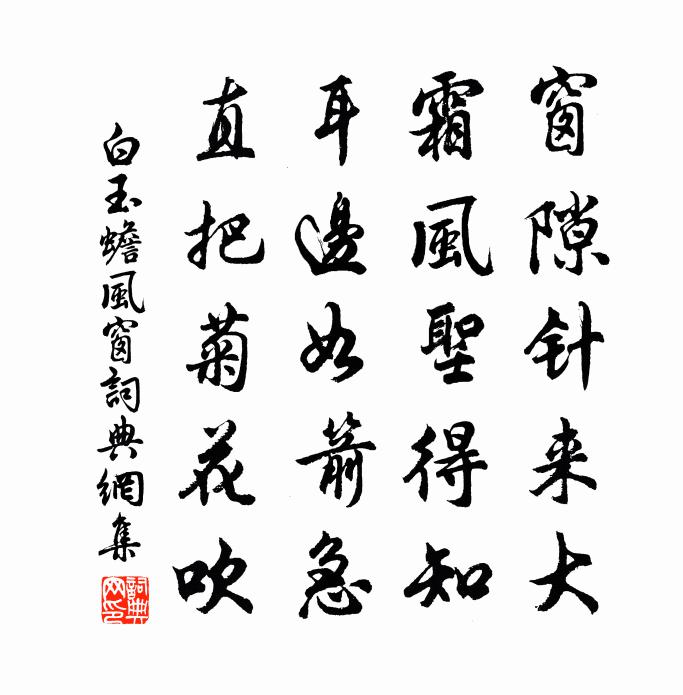 詩詞名句歷史字典書法欣賞書法字典國語詞典說文解字康熙字典古漢語字典標 題 作 者 詩 句 風窗作者:白玉蟾 朝代:宋代風窗原文窗隙針來大,霜風聖得知。耳邊如箭急,直把菊花吹。詩詞問答問:風窗的作者是誰?答:白玉蟾問:風窗寫於哪個朝代?答:宋代問:風窗是什麼體裁?答:五絕白玉蟾風窗書法欣賞風窗書法作品詩詞推薦何氏書堂葉茵〔宋代〕千歲松陰護一亭,風來猶帶讀書聲。雖無芳史摹勳業,自有青山說姓名。客撫豐碑苔剝落,春歸暗徑草生成。幾年浣溪沙王安中〔宋代〕宮纈慳裁翡翠輕。文犀松串水晶明。颭風新樣稱娉婷。帶笑緩搖春筍細,障羞斜映遠山橫。玉肌無汗暗香清。與秦太虛、參寥會於松江,而關彥長、徐安中蘇軾〔宋代〕二子緣詩老更窮,人間無處吐長虹。平生睡足連江雨,盡日舟橫擘岸風。人笑年來三黜慣,天教我輩一樽同。知君頌十玄談一色釋印肅〔宋代〕枯木岩前差路多,不行鳥道轉譊訛。狐狸引入豪豬窟,不久成團被死魔。維摩贊釋心月〔宋代〕呵二乘,彈十地。以強詞,奪正理。問疾人,根到底。語與默,都不是。金粟如來居士身,盡大地人扶不起。禪人並化主寫真求贊釋正覺〔宋代〕眾流吞海,大澤藏山。磨雲月兮蟾蜍膽冷,臥風波兮鷗鳥情閒。九華樓晴望張喬〔唐代〕一夜江潭風雨後,九華晴望倚天秋。重來此地知何日,欲別殷勤更上樓。旅中秋晚釋文珦〔宋代〕秋露洗晴空,秋光處處同。楓霞明野樹,蘆雪覆沙叢。旅況悲寒蛩,歸心寄斷鴻。幾時隨牧豎,吹笛亂山中。對客黃庚〔宋代〕窗不篝燈坐,相看白髮新。共談為客事,同是異鄉人。詩寫梅蓊月,茶煎穀雨春。明朝愁遠別,離思欲沾巾。夢峽蘇泂〔宋代〕未定還家樂,仍思去國情。猿枝樓閣影,龍府佩環聲。水漩欹斜碧,山搖突兀晴。分明昨夜夢,百丈峽中行。句路德延〔唐代〕不是上台知姓字,五花賓館敢從容。南嶽魏監廟曩自請奉祠恬於聲利十餘年來益閉牟巘五〔宋代〕全真閉戶魏不琢,二紀怡然外世榮。留得詩名皮陸集,到君句法有餘清。促妝鍾馬之純〔宋代〕禁鼓城頭報五更,景陽樓上打鐘聲。只疑仿佛天將曉,不省徘徊月尚明。閃閃青燈星戶綴,松松綠鬢霧窗橫。蜂黃又題釋善珍〔宋代〕李耳西遊丘泣麟,戰國十二終一秦。祖龍坑儒儒不死,溺冠復生赤龍子。有孫作帝痴求仙,茂陵松柏荒蒼煙。瞿曇和樂儀同苦熱詩庾信〔南北朝〕火井沉熒散。炎洲高焰通。鞭石未成雨。鳴鳶不起風。思為鸞翼扇。願借明光宮。臨淄迎子禮。中散就安豐。美酒游九鎖楊伯岩〔宋代〕亭前絕壁下飛瀑,天風夜半吹韶鹹。疑是銀河天上不,壯士挽落千丈岩。書翁卷詩集後徐璣〔宋代〕五字極難精,知君合有名。磨礱雙鬢改,收拾一編成。泉落秋岩潔,花開野徑清。漸多來學者,體法似元英。守歲李治〔唐代〕今宵冬律盡,來朝麗景新。花余凝地雪,條含暖吹分。綬吐芽猶嫩,冰□已鏤津。薄紅梅色冷,淺綠柳輕春。送迎梨花陳允平〔宋代〕流鶯偷入未央宮,望斷昭陽信不通。寂寞雨聲寒食夜,一枝香淚泣東風。王鄭州輓詞(克臣)蘇軾〔宋代〕羨君華發起琳宮,右輔初還鼓角雄。千里農桑歌子產,一時冠蓋慕蕭嵩。那知聚散舂糧外,便有悲歡過隙中。京兆名句推薦月傍苑樓燈影暗,風傳閣道馬蹄回。王守仁《元夕二首》 高田如樓梯,平田如棋局。楊慎《出郊》 笑綠鬟鄰女,倚窗猶唱,夕陽西下。蔣捷《女冠子·元夕》 兩水夾明鏡,雙橋落彩虹。李白《秋登宣城謝朓北樓》 語言多矯飾,則人品心術,盡屬可疑。王永彬《圍爐夜話·第四十則》 孤燈不明思欲絕,卷帷望月空長嘆。李白《長相思·其一》 成事不說,遂事不諫,既往不咎。孔子弟子《論語·八佾篇》 世間花葉不相倫,花入金盆葉作塵。李商隱《贈荷花》 十里西疇熟稻香,槿花籬落竹絲長,垂垂山果掛青黃。范成大《浣溪沙·江村道中》 天下稍安,尤須兢慎,若便驕逸,必至喪敗。吳兢《貞觀政要·卷一·論政體》