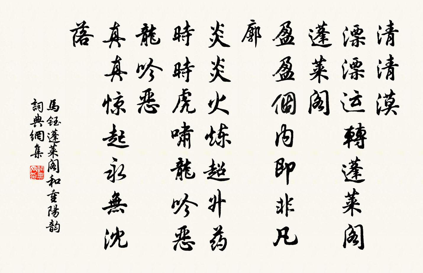 詩詞名句歷史字典書法欣賞書法字典國語詞典說文解字康熙字典古漢語字典標 題 作 者 詩 句 蓬萊閣 和重陽韻作者:馬鈺 朝代:元代蓬萊閣 和重陽韻原文清清漠。漂漂運轉蓬萊閣。蓬萊閣。盈盈個內,即非凡廓。炎炎火煉超升藥。時時虎嘯龍吟惡。龍吟惡。真真驚起,永無沈落。詩詞問答問:蓬萊閣 和重陽韻的作者是誰?答:馬鈺問:蓬萊閣 和重陽韻寫於哪個朝代?答:元代問:蓬萊閣 和重陽韻是什麼體裁?答:詞馬鈺蓬萊閣 和重陽韻書法欣賞蓬萊閣 和重陽韻書法作品詩詞推薦游石洞徐僑〔宋代〕我來叩石洞,嶄絕何從登。天開一間路,崖列兩連屏。有水泠泠來,委蛇貫中行。五丁修磴道,引步若余迎。昏暮送李道士釋心月〔宋代〕細探道德五千字,字字君家說底書。要識玄之又玄旨,淡然清對了無餘。風入松沈禧〔元代〕虬枝撐月倚高寒。瘦影拂琅*。露華冷沁蒼苔潤,更深後、萬籟聲乾。塵慮於時頓息,沖襟此際惟寬。儼然妝飾整王遂安輓詞樓鑰〔宋代〕淮水占王氏,生平熟義方。三珠欣競秀,兩桂蚤聯芳。才大用何嗇,源深流自長。青氈傳令子,一箭取雙鶬。賢者之孝二百四十首王裒林同〔宋代〕悲哉生我句,柰此念親何。墓側有枯樹,詩中無蓼莪。望海樓米芾〔宋代〕雲間鐵瓮近青天,縹緲飛樓百尺連。三峽江聲流筆底,六朝帆影落樽前。幾番畫角催紅日,無事滄洲起白煙。忽憶題端明蘇子瞻書天慶觀乳泉賦後王遂〔宋代〕天一生兮上浮,羽上俟兮丹丘。逆儋耳兮東注,夾崑崙兮倒流。早行楊公遠〔宋代〕黃粱已熟夢初醒,束擔匆匆促去程。手挈仗端和袖裡,氣呵髭上覺冰生。山銜斗柄兩三點,犬吠籬根四五聲。何處漁浦戴栩〔宋代〕久慚竅食侶鵷鴻,尚以詩名玷至公。喜對親慈說田裡,了無事鄙到船蓬。漲流暫急潮差候,陰靄俄銷月在空。夢讀和憶弟妹趙希逢〔宋代〕行行弔影建溪南,舉眼何人共急難。同氣蜂飛緣蜜剖, * 蚋聚為醯酸。荊山那得枝和合,豆泣堪傷肉自剜。杜老信筆方蒙仲〔宋代〕筆床茶灶答蛩吟,搖落秋風萬里心。白髮蕭蕭酒初醒,一龕鐙火四更深。村居陸游〔宋代〕富貴功名不擬論,且浮舴艋寄煙村。生憎快馬隨鞭影,寧作痴人記劍痕。樵牧相諳欲爭席,比鄰漸熟約論婚。晨舂螢楊公遠〔宋代〕飛螢生腐草,熠燿暗中游。貼水燈相照,穿林火獨幽。風前疑燼落,雨里訝星流。映讀除車胤,今人肯效不。嘲解十首王邁〔宋代〕一相當朝總百官,升沉只在笑談間。及門炙手趨炎火,傾國將身靠泰山。子獨何人蜉撼樹,眾皆重足虎當關。仙舟八月十四月食中秋遂無月方岳〔宋代〕妖蟆不為中秋地,老兔先奔昨夜寒。世事相違劇晴雨,人生何苦許悲歡。雲窗自照青藜杖,月戶重修白玉盤。坐想句周啟明〔宋代〕一丸童子藥,五返使臣車。和朱晦翁作陳光〔唐代〕去年渭北望卿頻,今日深山屐齒新。珠樹香沾千澗雨,蓮峰翠滴四時春。漁郎有意休相問,樵子無心可與親。石榻草堂同爨呈稚春林亦之〔宋代〕雲錦堂前花作堆,尋幽養靜屬吾儕。高高下下黃柑樹,曲曲斜斜碧草階。數點遠山如越縣,一條寒水似秦淮。龐公聽雨黃庚〔宋代〕老來已覺此身閒,近日唐詩亦懶看。半榻白雲眠聽雨,一窗簾影隔春寒。訪王官谷休休亭二首仇伯玉〔宋代〕山鴉營巢欲哺兒,晴杏拆早先離披。盤迴一徑穿碧絛,谷口數家耕水湄。名句推薦寒雨連天夜入吳,平明送客楚山孤。王昌齡《芙蓉樓送辛漸二首》 風力雖尚勁,然徒步則汗出浹背。袁宏道《滿井遊記》 待約個梅魂,黃昏月淡,與伊深憐低語。柳如是《金明池·詠寒柳》 相見時難別亦難,東風無力百花殘。李商隱《無題·相見時難別亦難》 聖人之官人,猶匠之用木也,取其所長,棄其所短。司馬光《資治通鑑·周紀一》 驚塞雁,起城烏,畫屏金鷓鴣。溫庭筠《更漏子·柳絲長》 明朝寒食了,又是一年春。顧太清《臨江仙·清明前一日種海棠》 九月寒砧催木葉,十年征戍憶遼陽。沈佺期《古意呈補闕喬知之 / 古意 / 獨不見》 臥聞兒女夸翁健,詩句年光一樣新劉克莊《戊午元日二首》 滿則慮嗛,平則慮險,安則慮危荀子《荀子·仲尼》