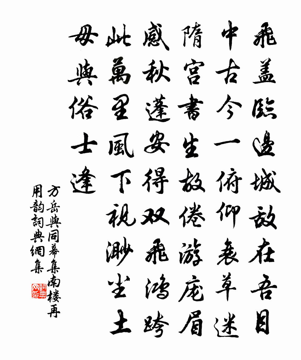 詩詞名句歷史字典書法欣賞書法字典國語詞典說文解字康熙字典古漢語字典標 題 作 者 詩 句 與同幕集南樓再用韻作者:方岳 朝代:宋代與同幕集南樓再用韻原文飛蓋臨邊城,敵在吾目中。古今一俯仰,衰草迷隋宮。書生故倦遊,龐眉感秋蓬。安得雙飛鴻,跨此萬里風。下視渺塵土,毋與俗士逢。詩詞問答問:與同幕集南樓再用韻的作者是誰?答:方岳問:與同幕集南樓再用韻寫於哪個朝代?答:宋代方岳與同幕集南樓再用韻書法欣賞與同幕集南樓再用韻書法作品詩詞推薦老柏圖為張心田賦王冕〔元代〕高堂素壁無纖埃,上有老柏參天來。銅柯旁奮龍爪出,密葉暗擁玄雲堆。江乾水落見白石,小竹無聲弄秋碧。君不聖俞惠詩復以二章為謝司馬光〔宋代〕我得聖俞詩,終身變何有。名字吒文編,佗年知不朽。偈頌一百零一首釋慧性〔宋代〕喝散白雲,穿開碧落。須彌燈王,無處摸索。和雁來紅薛嵎〔宋代〕若將群卉分高下,此種無因到畫欄。寒蝶不知紅是葉,飛來猶作野花看。題安成劉伯深爵瑞里報德堂上白爵圖楊萬里〔宋代〕君不見書台之北爵瑞里,安成令君旌孝子。報德堂前松造天,卜宅浩然老居士。居士元無一物遺,子孫只有牙籤三句薛舜俞〔宋代〕軒窗眼界開。擬樂府子夜四時歌四首崔道融〔唐代〕吳子愛桃李,月色不到地。明朝欲看花,六宮人不睡。涼軒待月生,暗裡螢飛出。低回不稱意,蛙鳴亂清瑟。月色蔡州道中劉奉世〔宋代〕黃河西渡出平沙,汝潁東流千里遐。給餉當年秦令史,封侯不種青門瓜。陌上釋行海〔宋代〕別人楊柳別人花,自對春風感物華。陌上最憐芳草色,王孫多是不還家。玩殘花楊發〔唐代〕十日濃芳一歲程,東風初急眼偏明。低枝似泥幽人醉,莫道無情似有情。訪古仙岩杜法師曾鞏〔宋代〕杜君袖銜丹砂書,一顧訶斥百怪除。聲如翻河落天衢,四方爭迎走高車。方瞳秀貌白須垂,買船東南尋舊居。石岩頌陳瓘〔宋代〕靜坐一川微雨,未辨雷音起處。夜深風作輕寒,清曉月明歸去。頌古一百二十一首釋宗杲〔宋代〕五逆聞雷,曾能顏回。一粒豆子,爆出冷灰。送子南兄參選李洪〔宋代〕我李柯條世有人,如兄器業自超倫。豈容被褐常懷寶,好上煙霄早致身。天氣未佳欲寒食,朝廷有道政青春。觀光滿庭芳 贈盧宣武二首王處一〔元代〕日裡金雞,月中玉兔,變通玄象盈虧。無形斡運,三界現慈悲。長養諸天大地,資三教、天下歸依。真明了,觀天題嚴子陵祠二首(後首一作杜荀鶴詩)方乾〔唐代〕物色旁求至漢庭,一宵同寢見交情。先生不入雲台像,贏得桐江萬古名。蒼翠雲峰開俗眼,泓澄煙水浸塵心。惟將夏侯彥濟武陟主簿梅堯臣〔宋代〕懷縣曾余往,風謠為爾知。寒先太行近,潤接大河卑。賓酒栽公秫,晨羹翦露葵。簿書行正委,何似布衣時。翠碧李復〔宋代〕翠碧曳長啼,翩然上庭樹。花枝搖未定,驚顧卻飛去。豈不愛芳陰,自憐好毛羽。苦為艷妝求,刻鏤點金素。五陵答朱公綽牡丹宋祁〔宋代〕珍卉分清賞,飛郵附翠籠。蹄金點鬢密,璋玉鏤跗紅。香惜持來遠,春應摘後空。玩時仍把酒,恨不與君同。旅懷雍陶〔唐代〕舊里已悲無產業,故山猶戀有煙霞。自從為客歸時少,旅館僧房卻是家。名句推薦落盡梨花春又了。滿地殘陽,翠色和煙老。梅堯臣《蘇幕遮·草》 春雲不變陽關雪,桑葉先知胡地秋。李昂《從軍行》 愁因薄暮起,興是清秋發。孟浩然《秋登蘭山寄張五》 何當金絡腦,快走踏清秋。李賀《馬詩二十三首》 竹葉於人既無分,菊花從此不須開。杜甫《九日五首·其一》 夜雨連明春水生,嬌雲濃暖弄陰晴。蘇舜欽《初晴游滄浪亭》 江上晚來堪畫處,釣魚人一蓑歸去。馬致遠《壽陽曲·江天暮雪》 乘人之車者載人之患,衣人之衣者懷人之憂,食人之食者死人之事。司馬遷《史記·七十列傳·淮陰侯列傳》 人生易老天難老,歲歲重陽。 * 《採桑子·重陽》 鞭撲之子,不從父之教劉向《說苑·雜言》