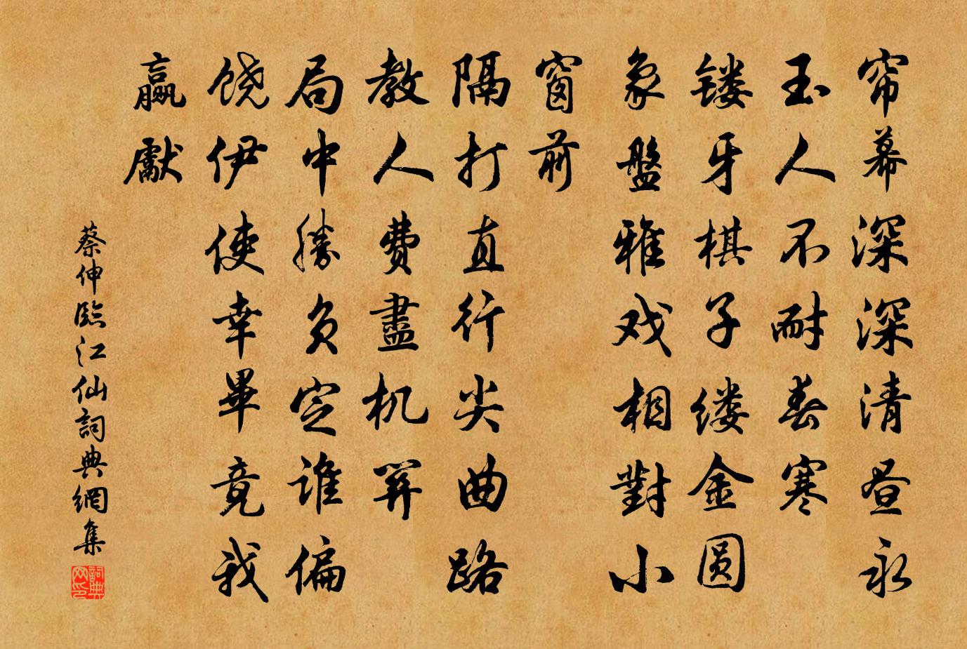 詩詞名句歷史字典書法欣賞書法字典國語詞典說文解字康熙字典古漢語字典標 題 作 者 詩 句 臨江仙作者:蔡伸 朝代:宋代臨江仙原文簾幕深深清晝永,玉人不耐春寒。鏤牙棋子縷金圓。象盤雅戲,相對小窗前。隔打直行尖曲路,教人費盡機關。局中勝負定誰偏。饒伊使幸,畢竟我贏先。詩詞問答問:臨江仙的作者是誰?答:蔡伸問:臨江仙寫於哪個朝代?答:宋代問:臨江仙是什麼體裁?答:詞蔡伸臨江仙書法欣賞臨江仙書法作品詩詞推薦和劉伯益嘲菊韻劉學箕〔宋代〕虛隨斗轉屬中宵,草木凌競菊粲修。錢疊夕陽金偠儁,蕊浮秋露骨玉鐫雕塑。不隨俗子媚時好,長伴幽人避世囂。疏慵葛立方〔宋代〕閒處著疏慵,鮮鮮幽桂叢。讀書聊灶北,避世且牆東。市駿卑蘇代,求徵謝子公。丹心阻閶闔,欲付小心風。縣廨海棠盛開二絕句項安世〔宋代〕梅蕊才開杏又紅,今年春事太匆匆。堂前燕子歸來到,雙海棠花已滿叢。和仲固胡寅〔宋代〕多謝春風吹雨晴,出遨今日計初程。去隨碧澗褵褷上,歸與閒雲澹沱行。順理以觀皆有趣,會心之樂最難名。山間題秋江菸草詩卷易士達〔宋代〕萬里長江浸碧流,煙籠細草滿孤洲。吟懷到此難排遣,獨立斜陽古渡頭。山寺杜甫〔唐代〕野寺殘僧少,山園細路高。麝香眠石竹,鸚鵡啄金桃。亂石通人過,懸崖置屋牢。上方重閣晚,百里見秋毫。徐倅尊人輓詩二首杜范〔宋代〕論子論交事契深,同年同里又同心。登堂未展龐公拜,夢奠俄驚尼父吟。自古陰功天所予,如公遐福世同歆。老成江行有惠梅花者因憶杜少陵雲江上被花惱不徹袁說友〔宋代〕去年短櫂孤山閣,尋得橫斜在籬落。帶花飲酒六七人,醉傍錢塘城下泊。今年江上花惱時,無處告訴狂如痴。一枝送程給事知越州劉奉世〔宋代〕使君遺愛遍南州,五馬新歸瘴海頭。持橐未厭青瑣直,懷章還作鑑湖游。姚餘人物傳吳遠,越絕山川向剡幽。應有宮詞王仲修〔宋代〕宮槐御柳繞池亭,水殿中間暑氣清。珠綱簾深塵不到,靜聞燕子引雛聲。題歸去來圖二首黃庭堅〔宋代〕人間處處猶崔子,豈忍更令三徑荒。誰與老翁同避世,桃花源里捕魚郎。鳳來朝(五日感事)史達祖〔宋代〕暈粉就妝鏡。掩金閨、彩絲未整。趁無人、學指鴛鴦頸。恨誰踏、蘚花徑。一夢蒲香葵冷。墮銀瓶、脆繩掛井。扇麥斜劉克莊〔宋代〕諺比武夷君,來游稱所聞。岩開花似染,洞出氣如雲。屋老殘詩在,崖枯小篆焚。只疑龕室內,猶有艾軒文。寄韓憲仲廷評李行中〔宋代〕野徑荒亭草沒腰,一眠聊以永今朝。放懷不管人間事,破夢時間夜半潮。玉柱劉叉詩未厭,金龜李白酒難招。知君游南塔院陸游〔宋代〕小破文書夢,閒成杖履游。澗幽泉激激,院靜竹修修。病骨涼如洗,歸心浩莫收。船輕不載石,一葉亂沙鷗。頌古釋妙堪〔宋代〕一人客路如天遠,一個歸心似箭輕。彼此征途雖有異,須知同日到天廷。客中月夜蕭澥〔宋代〕茅柴白白兩三杯,客里情懷旋旋開。正喜江頭風月好,卻緣風月又愁來。詠小桃石延年〔宋代〕本分桃花寒食前,小桃長是上春天。二喬二趙俱傾國,女弟嬌強意自先。皇后廟十五首真宗〔宋代〕宗臣率禮,步玉鏘鏘。吉蠲斯獻,百祿是將。和周子充侍郎見寄樂府戲贈之作范成大〔宋代〕釣海風水急,登樓塵霧高。不如岸綸巾,春船攜小橋。芳草含奇薰,光景上東壁。桂林那辦此,辦作安昌客。名句推薦何意百鍊剛,化為繞指柔。劉琨《重贈盧諶》 抽刀斷水水更流,舉杯消愁愁更愁。李白《宣州謝朓樓餞別校書叔雲》 秋空明月懸,光彩露沾濕。孟浩然《秋宵月下有懷》 卻道“天涼好個秋”!辛棄疾《醜奴兒·書博山道中壁》 長相思,摧心肝。李白《長相思三首》 每見寒士將達,必有一段謙光可掬。袁黃《了凡四訓·謙德之效》 海上生明月,天涯共此時。張九齡《望月懷遠》 弓開如秋月行天,箭去似流星落地羅貫中《三國演義·第十六回》 崖崩路絕猿鳥去,惟有喬木攙天長。蘇軾《李思訓畫長江絕島圖》 誰見汀洲上,相思愁白蘋。劉長卿《餞別王十一南遊》
