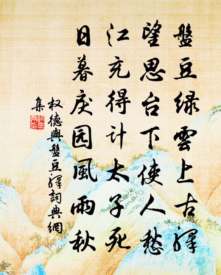 詩詞名句歷史字典書法欣賞書法字典國語詞典說文解字康熙字典古漢語字典標 題 作 者 詩 句 盤豆驛作者:權德輿 朝代:唐代盤豆驛原文盤豆綠雲上古驛,望思台下使人愁。江充得計太子死,日暮戾園風雨秋。詩詞問答問:盤豆驛的作者是誰?答:權德輿問:盤豆驛寫於哪個朝代?答:唐代問:盤豆驛是什麼體裁?答:七絕權德輿盤豆驛書法欣賞盤豆驛書法作品注釋全唐詩:卷325-33詩詞推薦題齋壁陸游〔宋代〕跡是滄浪客,家居罷亞村。秋菰芼羹滑,社酒帶醅渾。勳業知難遂,文章不更論。惟余此身在,分付與乾坤。頌古十六首釋心月〔宋代〕父母非親親是誰,雙眸烱烱帶雙眉。含元殿上不相識,正是岷峨相見時。嘉禾百詠陳賢良隱居張堯同〔宋代〕發策名猶在,回頭事已非。池塘春草綠,空憶謝公歸。避雨漁陽太守廟許及之〔宋代〕拂面秋風雲漠漠,傷心古汴黍離離。不因避雨漁陽廟,爭見元豐大觀碑。醉蓬萊(壽司馬大監生日)趙善括〔宋代〕正百花堂下,山雨樓前,粲然梅柳。和氣回春,灩一尊芳酒。桂子蘭孫,鳳歌鸞舞,介我公眉壽。天上遐齡,人間豫庵三端詩龍竹岳珂〔宋代〕夭矯青池近,騰拿碧漢遙。微風鳴嶰管,輕霧映鮫綃。舞翠槐齊秀,蟠青松後凋。終須還直道,勁節自乾霄。題城侍者剡溪圖陸游〔宋代〕暮境侵尋兩鬢絲,湖邊自葺小茆茨。從今步步俱回棹,不獨山陰興盡時。劉仙石祖無擇〔宋代〕支機莫問君平肆,取履誰收黃石祠。深洞自開人不見,何須惆悵憶當時。題琦公贊光堂晁說之〔宋代〕山川固高深,不掩珠玉光。道人覺物者,明明豈自藏。奈何一世中,瞑醉不我臧。收歛萬古志,風雨一茅堂。問之至日留滯荊渚同鄧氏兄弟飲酒晁公溯〔宋代〕今日當長至,窮年尚遠行。野晴春草細,江晚夕陽明。衰病依僮僕,經過得友生。濁醪來近市,堅坐且徐傾。謝李叔飛惠酒劉黻〔宋代〕清談莫療顛危證,白墮堪澆磊塊胸。今日和生今日福,世間萬事付青松。題石榴洞喻良能〔宋代〕當年雞犬白雲中,屋角榴花帶露濃。洞口只今無處覓,唯餘碧水繞青榕。古柏二首李石〔宋代〕驕榮落盡雪霜浮,偃蹇空貽社櫟羞。濡染東家雖借潤,風煙西爽亦宜秋。皮災已覺神明露,心在猶懷剪伐憂。鐵鏁題王家莊臨水柳亭白居易〔唐代〕弱柳緣堤種,虛亭壓水開。條疑逐風去,波欲上階來。翠羽偷魚入,紅腰學舞回。春愁正無緒,爭不盡殘杯。天華寺亭二首馮時行〔宋代〕老去心如水,眼明猶愛山。偶來出已意,特為破天慳。能便渺茫處,盡歸尋丈間。公餘成踐蹂,心事等雲閒。戲言寄霅溪使君唐司勛鄭獬〔宋代〕水精宮殿從來小,寂寞蓬萊不可游。十萬人家明鏡里,神仙都會是杭州。編聯偶作蘇籀〔宋代〕躭飫神奇致,思研理趣幽。崎嶇由考仿,勉勵似鉏耰。明耀鑒頻拭,醇精酒屢酘。編聯存隻字,解悟失全牛。曷可秋夕張喬〔唐代〕春恨復秋悲,秋悲難到時。每逢明月夜,長起故山思。巷僻行吟遠,蛩多獨臥遲。溪僧與樵客,動別十年期。甲申歲作楊冠卿〔宋代〕渺渺冰雪盡,欣欣花柳蘇。江澄炫初日,沙潤茁新蔞。久客亦勞止,我行猶載驅。乾坤如許大,何處著吾廬。元質偶招客飲為賦此篇李流謙〔宋代〕曉風吹花枝,曉雨濯花色。裁綴為好春,天公不遺力。啼禽強領解,對花語移日。世事豈易料,搔首鬢毛白。名園名句推薦啜苦咽甘,茶也。陸羽《茶經·五之煮》 岱宗夫如何?齊魯青未了。杜甫《望岳》 近淚無乾土,低空有斷雲。杜甫《別房太尉墓》 更落盡梨花,飛盡楊花,春也成憔悴。汪元量《鶯啼序·重過金陵》 驛寄梅花,魚傳尺素。秦觀《踏莎行·郴州旅舍》 至長反短,至短反長,天之道也。呂不韋《呂氏春秋·論·似順論》 飛光飛光,勸爾一杯酒。李賀《苦晝短》 故視強,則目不明;聽甚,則耳不聰;思慮過度,則智識亂。韓非及後人《韓非子·解老》 怯於邑斗,而勇於寇戰。商鞅《商君書·戰法》 夜夜相思更漏殘,傷心明月憑闌乾,想君思我錦衾寒。韋莊《浣溪沙·夜夜相思更漏殘》