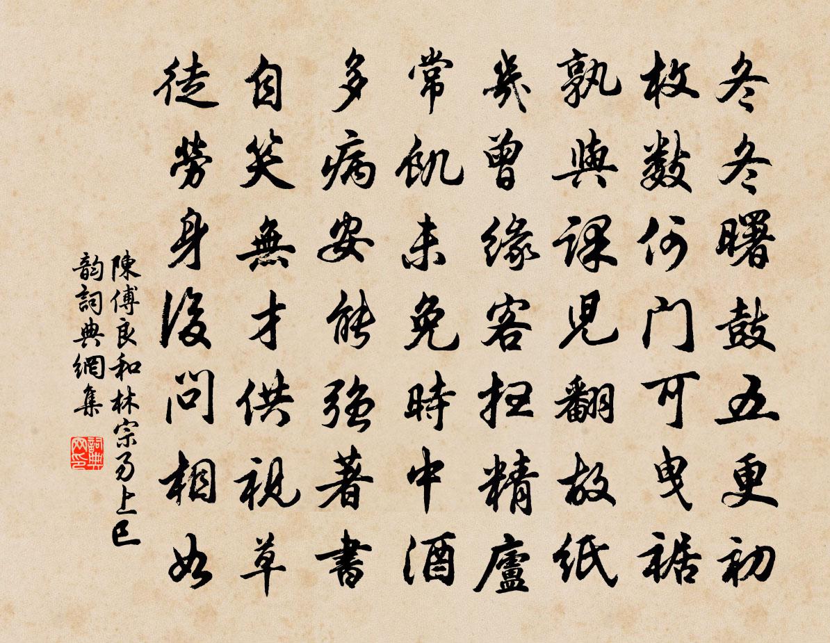 詩詞名句歷史字典書法欣賞書法字典國語詞典說文解字康熙字典古漢語字典標 題 作 者 詩 句 和林宗易上巳韻作者:陳傅良 朝代:宋代和林宗易上巳韻原文冬冬曙鼓五更初,枚數何門可曳裾。孰與課兒翻故紙,幾曾緣客掃精廬。常飢未免時中酒,多病安能強著書。自笑無才供視草,徒勞身後問相如。詩詞問答問:和林宗易上巳韻的作者是誰?答:陳傅良問:和林宗易上巳韻寫於哪個朝代?答:宋代陳傅良和林宗易上巳韻書法欣賞和林宗易上巳韻書法作品詩詞推薦早秋雨夕顧非熊〔唐代〕貧居常寂寞,況復是秋天。黃葉如霜後,清風似水邊。中宵疑有雁,當夕暫無蟬。就枕終難寐,殘燈滅又然。題華陽公主碑陰賀鑄〔宋代〕王姬乘鳳去,春色一朝空。昔怨綺羅月,今無松柏風。千年見白日,狐穴入幽宮。玉鏡古塵滿,落梅誰復容。峨峨郴江百詠並序上仙閣阮閱〔宋代〕曲檻危梯紫翠中,蘇仙宅畔古城東。不須更著登山屐,萬岫千峰一日窮。次韻外舅黃虞卿為愛山園好八首喻良能〔宋代〕為愛山園好,投閒日日來。花時長夜飲,雪後暖寒杯。一逕松篁影,滿畦桑柘栽。未能湖海去,纓興亦悠哉。木蘭花慢 西湖送春 詞品卷六梁曾〔元代〕問花花不語,為誰落,為誰開。算春色三分,半隨流水,半入塵埃。人生能幾歡笑,但相逢、尊酒莫相催。千古幕贈叔嘉叔平劉丈陳藻〔宋代〕木槽壓油三石余,半為燈火半煮蔬。上山伐柴五十束,九分賣錢一燒肉。等閒八月舉場歸,早禾囷畢晚禾稀。道行城南聯句韓愈〔唐代〕竹影金瑣碎, 和鄉守趙計院燈夕韻劉克莊〔宋代〕廚傳終年省餞迎,萬金難買上元晴。首龡豳俗祈年雅,遙和堯民擊壤聲。庭少缿筩知訟息,邊無刁斗喜時增。雌堂溜港灘楊萬里〔宋代〕此去嚴州只半程,一江分作兩江橫。忽驚洲背青山下,卻有帆檣地上行。觀胡人吹笛李白〔唐代〕胡人吹玉笛,一半是秦聲。十月吳山曉,梅花落敬亭。愁聞出塞曲,淚滿逐臣纓。卻望長安道,空懷戀主情。泊頭陀寺蘇泂〔宋代〕世上身名孰是非,維舟日日釣魚磯。長江天闊不知處,夏口青山人夜歸。失調名佚名〔宋代〕敧枕無眠又無寐。續作永昭陵輓詞五首歐陽修〔宋代〕都人擾擾塞康莊,西送靈車過苑牆。金鼎藥成龍已去,人間惟有鼠拖腸。題景溫筠居張嵲〔宋代〕昔游安康道,野竹曉森森。疏籬隱茅茨,置屋何幽深。卜鄰嗟未辦,長夢秋風林。如何嘉公子,得此蕭寺陰。作軒偈頌一百零九首釋可湘〔宋代〕煙樹斫開,曉月掛檐。嘶木馬嶺雲耕罷,春風吹雨。吼泥牛聲前,領會無差。共樂法,喜禪悅,打刀須是邠州鐵。薔薇倪龍輔〔宋代〕洛本空藏畫牡丹,海棠出蜀近應難。莫嫌村巷薔薇野,春晚猶堪取次看。紹興以後祀五方帝六十首佚名〔宋代〕沆碣西顥,功載萬世。乘金宅兌,侑我明祀。嘉觴布蘭,牲玉潔精。神之燕虞,肅用有成。暮春聯句九首許月卿〔宋代〕寸心元有雨,八面更當風。精衛海能涸,杜鵑天可通。君臣知有義,褒貶豈無公。一展霹靂手,九吞雲夢胸。狂瀾和范景仁王景彝殿中雜題三十八首並次韻其十梅堯臣〔宋代〕月向西樓下,天光候日開。殘星明寶監,百舌響宮槐。玉井傳新汲,金爐換宿灰。黃門馳有詔,唱第許卿來。鼓腹無所思朝起暮歸眠湫明詩也以詩定韻為十滕岑〔宋代〕居閒閱往史,掩卷忽長吁。兒聞翁吁聲,取酒滿注盂。悠然盡三酌,雜慮散如驅。乃知此神物,不可一日無。名句推薦休言女子非英物,夜夜龍泉壁上鳴。秋瑾《鷓鴣天·祖國沉淪感不禁》 菩提本無樹,明鏡亦非台。惠能《菩提偈》 不見穿針婦,空懷故國樓。孟浩然《他鄉七夕》 津橋春水浸紅霞,煙柳風絲拂岸斜。雍陶《天津橋望春》 節用儲蓄,以備凶災范曄《後漢書·本紀·肅宗孝章帝紀》 松月生夜涼,風泉滿清聽。孟浩然《宿業師山房期丁大不至 / 宿業師山房待丁大不至》 孤燈不明思欲絕,卷帷望月空長嘆。李白《長相思·其一》 梅似雪,柳如絲。試聽別語慰相思。辛棄疾《鷓鴣天·送歐陽國瑞入吳中》 長幼有序。孟子《孟子·滕文公章句上·第四節》 禍之所由生也,生自纖纖也。荀子《荀子·大略》