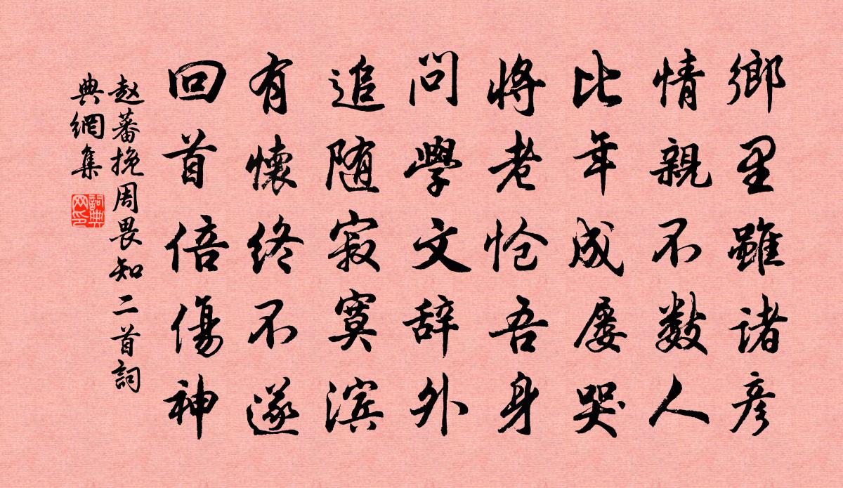 詩詞名句歷史字典書法欣賞書法字典國語詞典說文解字康熙字典古漢語字典標 題 作 者 詩 句 挽周畏知二首作者:趙蕃 朝代:宋代挽周畏知二首原文鄉里雖諸彥,情親不數人。比年成屢哭,將老愴吾身。問學文辭外,追隨寂寞濱。有懷終不遂,回首倍傷神。詩詞問答問:挽周畏知二首的作者是誰?答:趙蕃問:挽周畏知二首寫於哪個朝代?答:宋代趙蕃挽周畏知二首書法欣賞挽周畏知二首書法作品詩詞推薦董逃歌佚名〔魏晉〕承樂世,董逃;游四郭,董逃。蒙天恩,董逃;帶金紫,董逃。行謝恩,董逃;整車騎,董逃。垂欲發,董逃;與暗香(用韻賦雪)吳潛〔宋代〕九垓共色。想洛濱劍客,吹呼長笛。貏豸老松,別樹平欺爛柯折。應是千官鶴舞,騰賀表、誰家椽筆。賜宴也,內寄和邢子屑孫肖之始春見寄王銍〔宋代〕山林老去萬緣休,只有情鍾舊輩流。芳草無窮山四向,斷腸人在最高樓。偈頌一百零四首釋紹曇〔宋代〕薄福住山,百無所取。何以表勤,惟誠為主。祈晴便得晴,祈雨便得雨。東窗司馬光〔宋代〕臨風梳短髮,蕭颯晚涼新。不識市朝客,何如江海人。沉吟憑棐幾,欹側戴紗巾。濁世事無盡,東窗聊放神。郊廟歌辭。享太廟樂章。凱安四章佚名〔唐代〕瑟彼瑤爵,亞惟上公。室如屏氣,門不容躬。禮殷其本,樂執其中。聖皇永慕,天地幽通。禮匝三獻,樂遍九成。偈頌二百零五首釋正覺〔宋代〕家法簡嚴,非二非三。月來明湛水,雲退露寒岩。真機自得妙處,誰參不是文殊。白槌後也應,千古屈瞿曇。木蘭花慢·送翁五峰游江陵吳文英〔宋代〕送秋雲萬里,算舒捲、總何心。嘆路轉羊腸,人營燕壘,霜滿蓬簪。愁侵。庾塵滿袖,便封侯、那羨漢淮陰。一醉冬賽行周弼〔宋代〕大巫舞袍奉酒尊,小巫湔裙進盤彘。野風吹樹龍馬歸,瓦爐柏根香滿地。白衣老須撚向前,叉手大膽不敢言。去年桂隱紀詠霞川張鎡〔宋代〕方舟臥看化,丹霞二三里。窮眼謝玄暉,休言余散綺。呈彥平仲並〔宋代〕詩人老去倍傷秋,我亦秋來尚黑頭。世事可憐催晚景,皇天未許減羇愁。不堪敗菊愁彭澤,又見寒雲餞蓐收。旋解荀秀才送蠟梅十枝奇甚為賦此詩陸游〔宋代〕與梅同譜又同時,我為評香似更奇。痛飲便判千日醉,清狂頓減十年衰。色疑初割蜂脾蜜,影欲平欺鶴膝枝。插向海棠春令(同官約瞻叔兄 飲於郡圃海棠花下,遣酒代勸)魏了翁〔宋代〕東君慣得花無賴。看不盡、冶容嬌態。擬傍小車來,又被輕陰紿。陰晴長與隨人改。且特地、留花相待。榮悴故尋覲後徐鈞〔宋代〕淫奔何暇擇蕕薰,牛馬相傳讖已雲。可怪奸遺牛姓種,也來相繼馬為君。周祀圜丘歌 登歌庾信〔南北朝〕歲之祥。國之陽。蒼靈敬。翠雲長。象為飾。龍為章。乘長日。坯蟄戶。烈雲漢。迎風雨。六呂歌。雲門舞。省滌句張俞〔宋代〕康樂有情遙寄想,青谿句在十三峰。雜詠一百首二衍劉克莊〔宋代〕雖以賓師待,幾於妾婦然。不羞君割地,謾對客談天。題棲鳳亭四首白玉蟾〔宋代〕亭前綠密玉成叢,鳳宿枝頭煙雨空。簫管一聲人未寢,滿林明月浸清風。送周長史李端〔唐代〕青楓樹里宣城郡,獨佐諸侯上板橋。江客亦能傳好信,山僧多解說南朝。雲陰出浦看帆小,草色連天見雁遙。別有孔子世家贊司馬遷〔兩漢〕太史公曰:《詩》有之:“高山仰止,景行行止。”雖不能至,然心鄉往之。余讀孔氏書,想見其為人。適魯,觀名句推薦樹繞村莊,水滿陂塘。秦觀《行香子·樹繞村莊》 無情有恨何人覺?月曉風清欲墮時。陸龜蒙《白蓮》 漁舟逐水愛山春,兩岸桃花夾古津。王維《桃源行》 唯仁者能好人,能惡人。孔子弟子《論語·雍也篇》 去日兒童皆長大,昔年親友半凋零。竇叔向《夏夜宿表兄話舊》 冉冉年華吾自老。水滿汀洲,何處尋芳草。辛棄疾《蝶戀花·月下醉書雨岩石浪》 遙憐故園菊,應傍戰場開。岑參《行軍九日思長安故園》 人珍我棄、人棄我取沈復《浮生六記·浪遊記快》 翻空白鳥時時見,照水紅蕖細細香。蘇軾《鷓鴣天·林斷山明竹隱牆》 一春不識西湖面。翠羞紅倦。許棐《後庭花·一春不識西湖面》