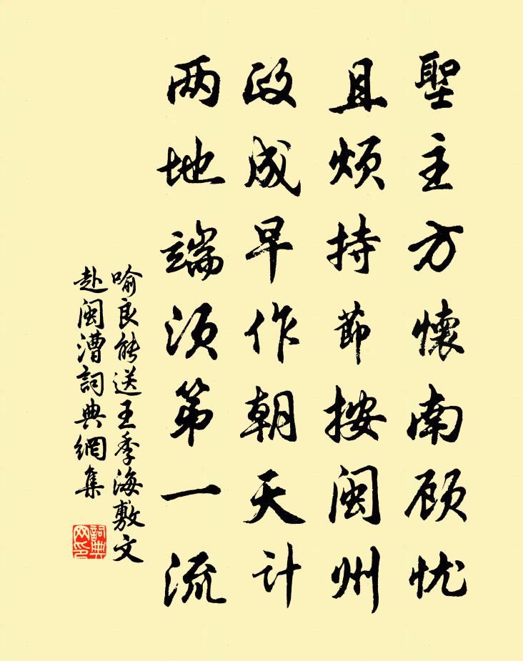 詩詞名句歷史字典書法欣賞書法字典國語詞典說文解字康熙字典古漢語字典標 題 作 者 詩 句 送王季海敷文赴閩漕作者:喻良能 朝代:宋代送王季海敷文赴閩漕原文聖主方懷南顧憂,且煩持節按閩州。政成早作朝天計,兩地端須第一流。詩詞問答問:送王季海敷文赴閩漕的作者是誰?答:喻良能問:送王季海敷文赴閩漕寫於哪個朝代?答:宋代喻良能送王季海敷文赴閩漕書法欣賞送王季海敷文赴閩漕書法作品詩詞推薦王孫圉論楚寶佚名〔先秦〕王孫圉聘於晉,定公饗之。趙簡子鳴玉以相,問於王孫圉曰:“楚之白珩猶在乎?”對曰:“然。”簡子曰:“其殘臘書懷舒邦佐〔宋代〕冰池照日暖初融,準擬迎春更餞冬。杯酒乍疏情少緒,尺緘稽報病多慵。殘年斷送風和雪,晚節相依竹與松。回首麟李嶠〔唐代〕漢祀應祥開,魯郊西狩回。奇音中鍾呂,成角喻英才。畫像臨仙閣,藏書入帝台。若驚能吐浦,為待鳳凰來。矮樹舒岳祥〔宋代〕千年矮桃樹,從昔不教長。靜入仙人室,低樣處女妝。苔枝深漬雨,秋實冷含霜。蜂蝶誰知顧,春風四畔香。送苗郎中出漕江西宋庠〔宋代〕幾夕燒熏歇被綾,東南使部望前旌。武泥給板言如綍,漢庾臨波粟似京。露橘千頭豐歲籍,江鱸百尾飫盤鯖。計籌感興吳龍翰〔宋代〕野興在漁艇,風潮不憚勞。苔生肥石骨,水落瘦溪毛。霜重稻粱熟,天清雁字高。醉餘歌古調,人事析秋毫。桄榔庵賓燕亭陳覺〔宋代〕秋來雨溢足池塘,華屋臨流四面涼。風颭圓荷翻翠蓋,水涵芳蕊艷紅妝。淡煙難掩天真色,薄月常供自在香。詩老太公哀晚遇常建〔唐代〕日出渭流白,文王畋獵時。釣翁在蘆葦,川澤無熊羆。詔書起遺賢,匹馬令(今)致辭。因稱江海人,臣老筋力衰楚竹吟酬盧虔端公見和湘弦怨孟郊〔唐代〕握中有新聲,楚竹人未聞。識音者謂誰,清夜吹贈君。昔為瀟湘引,曾動瀟湘雲。一叫鳳改聽,再驚鶴失群。江花和穎上人南徐十詠其二北固山梅堯臣〔宋代〕山勢自北來,高城倚為固。當時偶登臨,邇者遂淪誤。微雲思作雨,古樹嘗沾露。今非恃險艱,草木藏狐兔。王伯厚以詩招伯渾次韻同往邀之晁公溯〔宋代〕憶昨歸來萬里遙,不能對策未央朝。山林得計成長往,松石為朋是久要。痛飲肯來同榼挈,小詩聊遣當弓招。請君頌古五首釋彥岑〔宋代〕一橈打著這瞎漢,堪笑令猶行一半。竿頭比重線約鯨波,趯浪拿雲猶是鈍。明皇祀圜丘樂章。太和佚名〔唐代〕郊壇齋帝,禮樂祀天。丹青寰宇,宮徵山川。神祇畢降,行止重旋。融融穆穆,納祉洪延。題淡山岩二首黃庭堅〔宋代〕淡山淡姓人安在,徵君避秦亦不歸。石門竹徑幾時有,瓊台瑤室至今疑。回中明潔坐十客,亦可呼樂醉舞衣。閬州孝宗皇帝輓詞二首葉適〔宋代〕倫德加文景,雄才自武宣。道終遺萬乘,喪制盡三年。暫乞狂胡命,常持復漢權。全將一孝字,高謚百王前。飲酒 十一陶淵明〔魏晉〕顏生稱為仁,榮公言有道。屢空不獲年,長飢至於老,雖留身後名,一生亦枯槁,死去何所知,稱心固為好,客養寄趙菊東山長三首熊禾〔宋代〕胡為此不採,卻采泮水芹。聖人望魯念,彼黍車轔轔。餘澤孟孫氏,管商何足論。新畲有陳根,猶是豐芑春。寄題趙侯澄碧軒秦觀〔宋代〕風流公子四難井,更引清漪作小亭。潤及玉階春漲雨,光浮藻井夜涵星。捲簾幾硯成圖書,倚檻須鬟人鍾屏。何日侍宴桃花園詠桃花應制徐彥伯〔唐代〕源水叢花無數開,丹跗紅萼間青梅。從今結子三千歲,預喜仙遊復摘來。寄楊五桂州譚(因州參軍段子之任)杜甫〔唐代〕五嶺皆炎熱,宜人獨桂林。梅花萬里外,雪片一冬深。聞此寬相憶,為邦復好音。江邊送孫楚,遠附白頭吟。名句推薦古台搖落後,秋日望鄉心。劉長卿《秋日登吳公台上寺遠眺》 一番桃李花開盡,惟有青青草色齊。曾鞏《城南·雨過橫塘水滿堤》 寺憶曾游處,橋憐再渡時。杜甫《後游》 又是羊車過也,月明花落黃昏黃升《清平樂·宮怨》 君子能勤小物,故無大患。司馬光《資治通鑑·周紀·周紀一》 保民而王,莫之能御也。孟子《孟子·梁惠王章句上·第七節》 荒煙涼雨助人悲,淚染衣襟不自知。王安石《送和甫至龍安微雨》 平沙芳草渡頭村。綠遍去年痕。洪咨夔《眼兒媚·平沙芳草渡頭村》 山不厭高,海不厭深曹操《短歌行》 不須更上新亭望,大不如前灑淚時。虞集《挽文丞相》