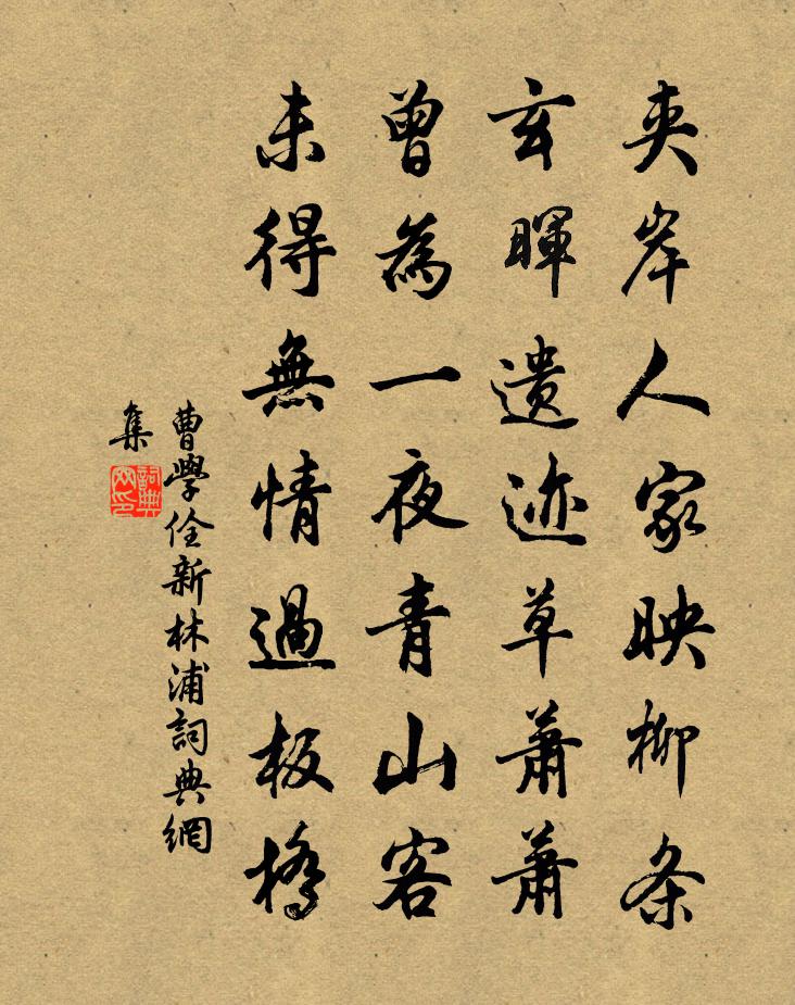 詩詞名句歷史字典書法欣賞書法字典國語詞典說文解字康熙字典古漢語字典標 題 作 者 詩 句 新林浦作者:曹學佺 朝代:明代新林浦原文夾岸人家映柳條,玄暉遺蹟草蕭蕭。曾為一夜青山客,未得無情過板橋。詩詞問答問:新林浦的作者是誰?答:曹學佺問:新林浦寫於哪個朝代?答:明代問:新林浦是什麼體裁?答:七絕曹學佺新林浦書法欣賞新林浦書法作品詩文賞析新林浦:謝朓有《之宣城出新林浦向板橋》詩,李善注云:“酈善長《水經注》曰‘江水以三山,又湘浦出焉。水上南北結浮橋渡水,故曰板橋。浦江又北,以新林浦。’”玄暉:南齊詩人謝朓之字。遺蹟:指新林浦。蕭蕭:搖動貌。青山:指謝朓青山,在安徽當塗縣東南。當塗離南京甚近。曹學佺在南京時,常過此地。詩詞推薦雨後贈斯遠趙蕃〔宋代〕已是霜凝更雨濕,春其漸起但無痕。莫嗟草色有垂死,定有梅花當返魂。小駐要須窮日日,細尋無惜遍村村。揩摩句高似孫〔宋代〕啜樆正自強持酒,眾醉如何敢獨醒。暮春陸游〔宋代〕綠葉枝頭密,青蕪陌上深。江山妨極目,天地入孤吟。身已雙蓬鬢,家惟一素琴世情君莫說。頭痛欲涔涔。錦鏡池釋鑒〔宋代〕一鑒涵虛碧,萬象悉其中。重綠浮輕綠,深紅閒淺紅。送湘陽熊判官孺登府罷歸鍾陵因寄呈江西裴中丞二十三兄劉禹錫〔唐代〕射策志未就,從事歲雲除。篋留馬卿賦,袖有劉弘書。忽見夏木深,悵然憶吾廬。復持州民刺,歸謁專城居。君家踏莎行譚處端〔元代〕一顆玄珠,從來蒙昧。貪嗔痴染難分解。頓修滌盪不交昏,輪迴生死都無礙。急急行持,休生退怠。綿綿鍛鍊須寧句李壁〔宋代〕向來交態雲翻手,靜里無言石點頭。題萬歲寺方信孺〔宋代〕磊磊洞庭石,渺渺蒼梧雲。客行離騷國,長歌酹湘君。湘君不可見,古廟藏江氛。空壇頗亡恙,誰為真將軍。禁林讌會之什錢若水〔宋代〕一夜春風滿帝都,禁林清曉宴簪裾。玉堂乍到驚凡目,金鎖徐開見御書。四字驪龍爭夭矯,兩篇瓊樹斗扶疏。詞臣霧李嶠〔唐代〕曹公迷楚澤,漢帝出平城。涿鹿妖氛靜,丹山霽色明。類煙飛稍重,方雨散還輕。倘入非熊兆,寧思玄豹情。九張機南宋無名〔宋代〕六張機,行行都是耍花兒。花間更有雙蝴蝶,停梭一響,閒窗影里,獨自看多時。廉村薛庭芝訴貧於余余亦貧不能周之贈以是詩薛嵎〔宋代〕兩窮相值愁無計,同是開元補闕孫。百世清風於此在,莫將貧悴對人言。訴衷情盧炳〔宋代〕柴扉人寂草生畦。藤蔓亂縈籬。秋淨楚天如水,雲葉度牆低。同把盞,且伸眉。對殘暉。紅茱笑拈, * 斜簪,戀游王母岡曾躍鱗〔宋代〕岡空雲散淨如銀,石磴層層接九宸。翠竹影搖湘浦夜,碧桃香藹武陵春。但看此日燒丹灶,不見當年駕鶴人。游遍次長蘆張舜民〔宋代〕炎荒往返正三年,重過長蘆古寺前。萬里風波行欲盡,停撓南望一潸然。題清隱堂佚名〔宋代〕涼蟬亂叫朝暮雨,獨鶴不迷前後山。茶葉煮湯勝茗椀,栗花然火稱松關。和黎德升贈別洪咨夔〔宋代〕朱弦無繁聲,大羹有至味。人惟不苟同,終亦不苟異。鹹戒鹹其腓,賁取賁其趾。出處進退間,當思古人齒,嗟予孤鸞(次虛齋先生梅詞韻)張榘〔宋代〕塞鴻來早。正碧瓦霜輕,玉麟寒少。昨夜南枝,一點陽和先到。黃昏半窗淡月,照青青、謝池春草。此際虛齋心事聞圓載上人挾儒書洎釋典歸日本國,更作一絕以送陸龜蒙〔唐代〕九流三藏一時傾,萬軸光凌渤澥聲。從此遺編東去後,卻應荒外有諸生。石壁寺山房即事沈與求〔宋代〕望斷南岡遠水通,客檣來往酒旗風。畫橋依約垂楊外,映帶殘霞一抹紅。名句推薦雲鬢花顏金步搖,芙蓉帳暖度春宵。白居易《長恨歌》 運往無淹物,年逝覺已催。謝靈運《歲暮》 馬行無力皆因瘦,人不風流只為貧。佚名《增廣賢文·上集》 雙星良夜,耕慵織懶,應被群仙相妒。范成大《鵲橋仙·七夕》 秋草六朝寒,花雨空壇。更無人處一憑闌。朱彝尊《賣花聲·雨花台》 停車坐愛楓林晚,霜葉紅於二月花。杜牧《山行》 雲里帝城雙鳳闕,雨中春樹萬人家。王維《奉和聖制從蓬萊向興慶閣道中留春雨中春望之作應制》 秋空明月懸,光彩露沾濕。孟浩然《秋宵月下有懷》 梓匠輪輿,能與人規矩,不能使人巧。孟子《孟子·盡心章句下·第五節》 無邊家國事,併入雙蛾翠。秋瑾《菩薩蠻·寄女伴》