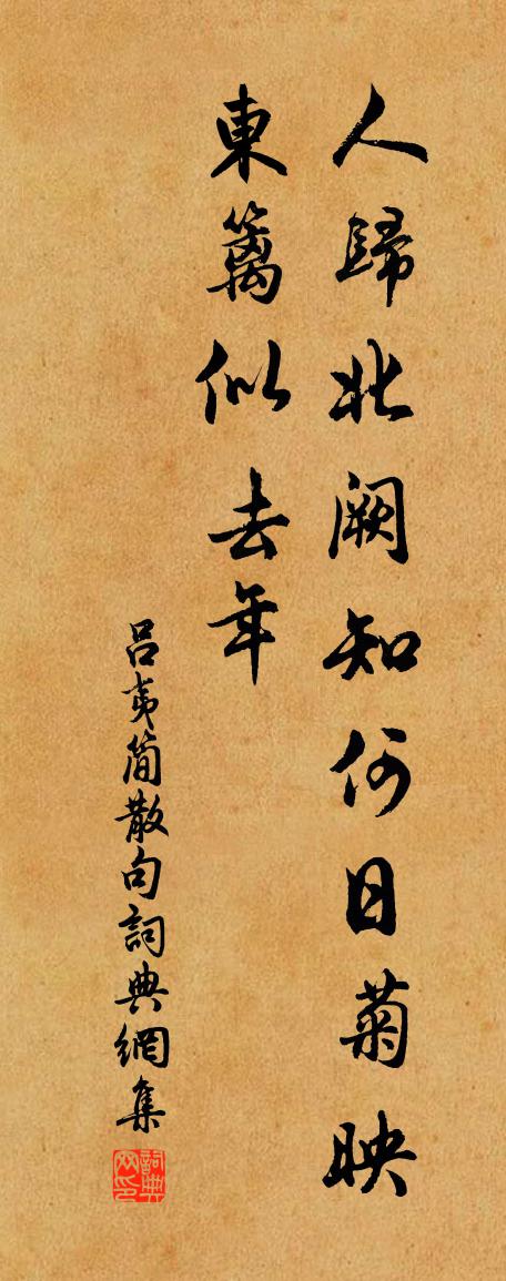 詩詞名句歷史字典書法欣賞書法字典國語詞典說文解字康熙字典古漢語字典標 題 作 者 詩 句 句作者:呂夷簡 朝代:宋代句原文人歸北闕知何日,菊映東籬似去年。詩詞問答問:句的作者是誰?答:呂夷簡問:句寫於哪個朝代?答:宋代呂夷簡句書法欣賞句書法作品詩詞推薦歸後遣書問訊李敷文戴復古〔宋代〕憶作南州客,歸來東海濱。尚懷憂世志,忍說在家貧。老作山林計,夢隨車馬塵。郁孤台上月,無復照詩人。水龍吟(別吳興至松江作)晁補之〔宋代〕水晶宮繞千家,卞山倒影雙溪里。白苹洲渚,詩成春晚,當年此地。行遍瑤台,弄英攜手,月嬋娟際。算多情小杜滬上雜書何紹基〔清代〕新閘才開老閘過,樓台金碧照江波。愁風悶雨人無寐,海國平分鬼氣多。落花釋贊寧〔宋代〕蝶醉蜂狂香正濃,晚來階下墜衰紅。開時費盡陽和力,落處難禁一陣風。梅花喜神譜爛熳二十八枝宋伯仁〔宋代〕赤壁夢醒時,雨灑玄裳濕。聲欲聞於天,故向松梢立。臨江仙(贈送)蘇軾〔宋代〕詩句端來磨我鈍,鈍錐不解生芒。歡顏為我解冰霜。酒闌清夢覺,春草滿地塘。應念雪堂坡下老,昔年共采芸香。谷自亂離之後在西蜀半紀之餘多寓止精舍…四韻以吊之鄭谷〔唐代〕每思聞淨話,雨夜對禪床。未得重相見,秋燈照影堂。孤雲終負約,薄宦轉堪傷。夢繞長松塔,遙焚一炷香。簡鄭景元陳傅良〔宋代〕西風肅萬物,於卦曷為兌。說言就凋蟄,之死矢靡悔。方當春和時,動植出草昧。喧號聒穹蒼,怒長彌大塊。紛紛詠史上賈董陳普〔宋代〕賈董聲名甲漢儒,到頭事業有差殊。五年大傅何飄忽,不告梁王肆夏趨。寄送於去非三首趙蕃〔宋代〕三載尉雖卑,諸公況己知。薦書常沓至,賓幕每牢辭。玉立風神峻,河傾議論馳。他年繼質肅,應有後人祠。寄溫倅江十四晁說之〔宋代〕離別蹉跎歲月深,故人帶未九環金。狂兒易悅笙歌費,志士徒勞涕淚侵。金紫早年唯樂夢,令公老去亦傷心。永嘉偈頌二百零五首釋正覺〔宋代〕朔風拂旦吹秋過,時節薄寒宜就火。拱默威音世外游,放閒枯木堂中坐。塵劫空時卻有空,道環虛處元無我。靈靈偈傾一百三十三首釋法薰〔宋代〕一不成,二不成二。喝水成水,敲骨出髓。眼有瞳人,色斯舉矣。句史堯弼〔宋代〕四歲尚少房玄齡,七步未饒曹子建。洞仙歌楊炎正〔宋代〕芙蓉開了,春未江梅透。小小東風弄晴晝。把萬家和氣,吹入笙歌,爐熏里,都與慈闈做壽。黃堂今日貴,自著萊山居釋崇岳〔宋代〕路嶮人稀到,窮居稱野情。雲開空自闊,月落夜深清。風動數莖草,鳥啼三四聲。箇中無限意,唯我與誰評。句陶弼〔宋代〕避秦荒徑在,招屈古祠空。感遇之卅八陳子昂〔唐代〕仲尼探元化。幽鴻順陽和。大運自盈縮。春秋遞來過。盲飆忽號怒。萬物相紛劘。溟海皆震盪。孤鳳其如何。題石橋寺山井趙湘〔唐代〕何年鑿蘚紋,寒氣觸僧魂。穴在青松底,泉通白石根。汲因嘗茗客,窺有斷腸猿。偶向秋來照,吟髭雪露痕。李和鼎杜牧〔唐代〕鵩鳥飛來庚子直,謫去日蝕辛卯年。由來枉死賢才事,消長相持勢自然。名句推薦窗含西嶺千秋雪,門泊東吳萬里船。杜甫《絕句》 簫鼓喧,人影參差,滿路飄香麝。周邦彥《解語花·上元》 二月江南花滿枝,他鄉寒食遠堪悲。孟雲卿《寒食》 楊花落盡子規啼,聞道龍標過五溪。李白《聞王昌齡左遷龍標遙有此寄》 石壕村里夫妻別,淚比長生殿上多。袁枚《馬嵬》 蓮子已成荷葉老。青露洗、蘋花汀草。李清照《怨王孫·湖上風來波浩渺》 多少淚珠何限恨,倚欄乾李璟《攤破浣溪沙·菡萏香銷翠葉殘》 殷勤昨夜三更雨,又得浮生一日涼。蘇軾《鷓鴣天·林斷山明竹隱牆》 漠漠黃雲,濕透木棉裘。蔣捷《梅花引·荊溪阻雪》 人間有味是清歡。蘇軾《浣溪沙·細雨斜風作曉寒》