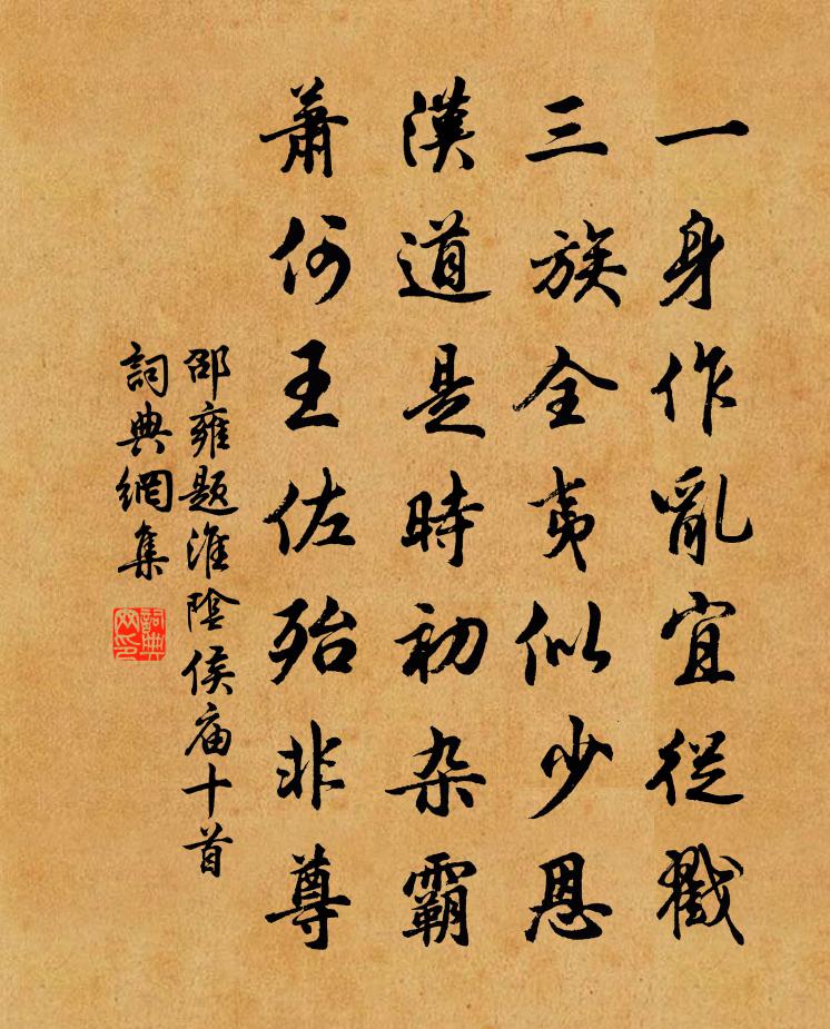 詩詞名句歷史字典書法欣賞書法字典國語詞典說文解字康熙字典古漢語字典標 題 作 者 詩 句 題淮陰侯廟十首作者:邵雍 朝代:宋代題淮陰侯廟十首原文一身作亂宜從戳,三族全夷似少恩。漢道是時初雜霸,蕭何王佐殆非尊。詩詞問答問:題淮陰侯廟十首的作者是誰?答:邵雍問:題淮陰侯廟十首寫於哪個朝代?答:宋代邵雍題淮陰侯廟十首書法欣賞題淮陰侯廟十首書法作品詩詞推薦捕狼陳師道〔宋代〕一狼將四子,二嶺走千羊。意得無前敵,時乖闕後防。寧知射生手,已發弩機張。會使烏鳶飽,空令豺虎傷。次韻子瞻過海蘇轍〔宋代〕我遷海康郡,猶在寰海中。送君渡海南,風帆若張弓。笑揖彼岸人,回首平生空。平生定何有,此去未可窮。惜無次韻聰父見遺二首張元乾〔宋代〕十年遷客北歸時,旁海相逢嘆渺瀰。枝上煙光忙蛺蝶,尊中風味奪酴醿。老來詩思真枯井,別後心情似亂絲。喜故詩狂楊公遠〔宋代〕掬取長江供硯水,借將碧漢作蠻箋。興來拈起如椽筆,大詠高吟欲上天。頌古九十八首釋印肅〔宋代〕一念心開解脫門,倒騎鐵馬繞崑崙。一條脊骨純金打,傳與人間蔭子孫。楞嚴六根無耳能聞釋慧遠〔宋代〕跋難陀龍能聽聞,淨名結舌若為論。行到山窮山盡處,虛空依舊塞乾坤。竹徑步月饒良輔〔宋代〕素月流空天不夜,清輝散入疏林下。下有幽人獨往來,杖藜縹緲誰能畫。謝偃溪惠索淘徐集孫〔宋代〕與客敲詩倚古松,亂蟬聲里夕陽春。幾年飯顆山頭瘦,槐葉今朝得飽供。小遊仙三首曹勛〔宋代〕搖曳空歌上玉清,飛煙冉冉拂仙纓。龍軿已過黃金闕,致肅門郎識姓名。送呂子陽二絕葉適〔宋代〕七峰斜轉斗光寒,千仞飛來雁影寬。生怕被君題寫盡,更留風景後來看。呈李贛州四首趙蕃〔宋代〕憶昔重湖北,逢人問處州。寄書寧盡達,覓使苦無由。風月無離闊,山川自阻修。那知遠遊櫂,又傍昔年洲。朝中措李祁〔宋代〕照江梅詞,寄任蘊明。蘊明嘗許緣檄載侍兒見過,又於漢籍伎有目成者因以為戲郎官湖上探春回。初見照江梅。過大雲池泛舟李群玉〔唐代〕九月蓮花死,萍枯霜水清。船浮天光遠,棹拂翠瀾輕。古木□□□,了無煙靄生。游鱗泳皎潔,洞見逍遙情。漁父槃磵葉茵〔宋代〕盤旋山水間,隱者固所樂。寐寤獨言時,畎畝心猶昨。第七回回前詩曹雪芹〔清代〕十二花容色最新,不知誰是惜花人。相逢若問名何氏,家住江南姓本秦。官冷仇遠〔宋代〕不負平生下澤車,宦遊卜宅亦村墟。家貧累重須乾祿,官冷身閒可讀書。高柳每聞鶯婭奼,破籬時度竹蕭疏。西南沁園春(壽韋軒八十一歲·九月初二)佚名〔宋代〕 * 十翁,似嬰兒戲,漢司馬遷。記渭川垂釣,一年之長,龍山吹帽,七日之前。口角春風,襟期秋月,萬事從來感花崔塗〔唐代〕繡軛香韉夜不歸,少年爭惜最紅枝。東風一陣黃昏雨,又到繁華夢覺時。木蘭花慢呂勝己〔宋代〕朝天門外路,路坦坦、走瑤京。悔年少狂圖,爭名遠宦,為米孤征。星星。半凋鬢髮,事千端、回首隻堪驚。居士二月十日喜雨呈李純教授去非尉曹趙蕃〔宋代〕滄浪一夜起鳴雷,雨陣因之續續來。所病農家成久旱,未論花事有新開。書生狂妄常憂國,新地飄零豈棄才。儒館名句推薦人之事兄,不可同於事父,何怨愛弟不及愛子乎?顏之推《顏氏家訓·兄弟篇》 能近取譬,可謂仁之方也已。孔子弟子《論語·雍也篇》 昨日春如,十三女兒學繡。辛棄疾《粉蝶兒·和趙晉臣敷文賦落花》 滿目山河增感慨,一時風景寄遨遊。姜塘《摘星樓九日登臨》 雲中亂拍祿山舞,風過重巒下笑聲。杜牧《過華清宮絕句三首》 今春看又過,何日是歸年。杜甫《絕句二首》 更可惜,雪中高樹,香篝熏素被。周邦彥《花犯·小石梅花》 夜來雨橫與風狂,斷送西園滿地香。阿魯威《湘妃怨·夜來雨橫與風狂》 昨夜東風入武陽,陌頭楊柳黃金色。李白《早春寄王漢陽》 柳條百尺拂銀塘,且莫深青只淺黃。楊萬里《新柳》