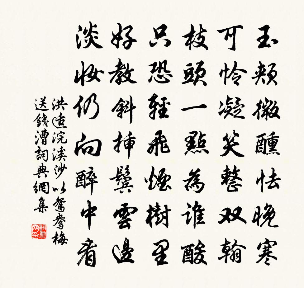 詩詞名句歷史字典書法欣賞書法字典國語詞典說文解字康熙字典古漢語字典標 題 作 者 詩 句 浣溪沙(以鴛鴦梅送錢漕)作者:洪适 朝代:宋代浣溪沙(以鴛鴦梅送錢漕)原文玉頰微醺怯晚寒。可憐凝笑整雙翰。枝頭一點為誰酸。只恐輕飛煙樹里,好教斜插鬢雲邊。淡妝仍向醉中看。詩詞問答問:浣溪沙(以鴛鴦梅送錢漕)的作者是誰?答:洪适問:浣溪沙(以鴛鴦梅送錢漕)寫於哪個朝代?答:宋代問:浣溪沙(以鴛鴦梅送錢漕)是什麼體裁?答:詞洪适浣溪沙(以鴛鴦梅送錢漕)書法欣賞浣溪沙(以鴛鴦梅送錢漕)書法作品詩詞推薦陳推官幽居十詠溪上賦詩王炎〔宋代〕閱遍岸花汀草,捻髭危坐漁磯。一笑冥搜得句,溪山爭吐光輝。詠烏李義府〔唐代〕日裡颺朝彩,琴中伴夜啼。上林如許樹,不借一枝棲。猗覺寮晚飯朱翌〔宋代〕卒律葛答美,鉤輈格磔肥。翁川茶不媚,何氏酒今非。硯水添池淺,棋盤下子稀。姮娥憐我獨,未暮款窗扉。括賀新涼林正大〔宋代〕環滁皆山也。望西南、蔚然深秀,者琅邪也。泉水潺潺峰路轉,上有醉翁亭也。亭、太守自名之也。試問醉翁何所示沙彌釋大觀〔宋代〕維衛芳騰蔓愈滋,花花葉葉轉芬披。鄮峰酷烈較些子,曇萼翻成鐵蒺藜。就謝主簿宿詩江淹〔南北朝〕季月寒氣重。滋蘭錯無芳。北風漂夜色。河凝暠如霜。悵哉心神晚。燭滅此深堂。芰衣如可贈。寧濕岨雲梁。南堂雜興陸游〔宋代〕車馬無聲晝漏長,野人與世已相忘。屏除長物軒楹爽,洗濯塵襟肺腑涼。秋 * 郊鳴鸛鶴,日斜荒徑下牛羊。興來奉酬袁使君送陸灞卻回期道寺院皎然〔唐代〕欲別湖上客,暮期西林還。高歌風音表,放舟月色間。更人莫報夜,禪閣本無關。偈頌一百二十三首釋祖欽〔宋代〕指天指地,點胸點肋。將謂六識未具初生孩兒,元來通身是膽白拈正賊。偈頌一百零二首釋紹曇〔宋代〕佛壟開爐,寒灰死火。撥著星兒,彌天罪過。笑倒嵩山破灶墮。紹興釋奠武成王七首佚名〔宋代〕赫赫尚父,時維鷹揚。神潛韓略,襟抱帝王。談笑致主,竹帛流芳。國有嚴祀,載稽典常。題城侍者峴山圖陸游〔宋代〕漢水沉碑安在哉?千年峴首獨崔嵬。平生不作羊公計,但欲無名死草萊。踏莎行 雨中觀海棠劉辰翁〔宋代〕命薄佳人,情鍾我輩。海棠開後心如碎。斜風細雨不曾晴,倚闌滴盡胭脂淚。恨不能開,開時又背。春寒只了房櫳春日書懷四首姜夔〔宋代〕春雲驛路暗,遊了眇歸程。永懷故山下,風雨悲柏庭。翁仲不解語,綱鳥時時鳴。人家插垂柳,客里又清明。鷓鴣天(次韻寶溪探梅未放)楊冠卿〔宋代〕歲月如馳烏免飛。情懷著酒強支持。經年不見宮妝面,穠碧誰斟悲翠卮。江路晚,夕陽低。奚奴空負錦囊歸。欲憑寄田潤齋道錄顧逢〔宋代〕銳志休官去,皆緣道法靈。一符方落筆,萬怪已潛形。柳下犬迎客,花邊鶴聽經。結交三十載,我醉獨君醒。相見歡·林花謝了春紅李煜〔唐代〕林花謝了春紅,太匆匆。無奈朝來寒雨晚來風。胭脂淚,相留醉,幾時重。自是人生長恨水長東。(相留 一作:同越琅琊山韋應物〔唐代〕石門有雪無行跡,松壑凝煙滿眾香。餘食施庭寒鳥下,破衣掛樹老僧亡。餞潘吳二察院去國五首劉黻〔宋代〕兩豸歸歟一相留,孤山草木亦含羞。忠言不必排閶闔,付與錢塘江自流。和河南鄭尹新歲對雪白居易〔唐代〕白雪吟詩鈴閣開,故情新興兩裴回。昔經勤苦照書卷,今助歡娛飄酒杯。楚客難酬郢中曲,吳公兼占洛陽才。銅街名句推薦流水孤村,荒城古道。陳霆《踏莎行·晚景》 人無千日好,花無百日紅。馮夢龍《醒世恆言·卷一》 青苔滿階砌,白鳥故遲留。杜牧《題揚州禪智寺》 至鷺鷥林,則雪深泥滑,不得前矣。辛棄疾《賀新郎·把酒長亭說》 輕輕飛動,把賣花人搧過橋東王和卿《醉中天·詠大蝴蝶》 執子之手,與子偕老。詩經《擊鼓》 何當一夕金風起,為我掃除天下熱。施耐庵《水滸傳·第十六回》 救寒莫如重裘,止謗莫如自修。司馬光《資治通鑑·魏紀五》 可憐青冢已蕪沒,尚有哀弦留至今。王安石《明妃曲二首》 長江如虹貫,蟠繞其下。宋濂《閱江樓記》