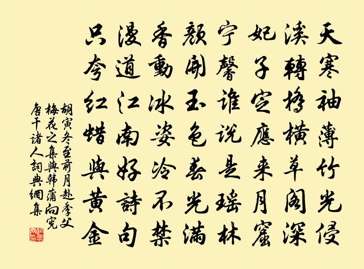 詩詞名句歷史字典書法欣賞書法字典國語詞典說文解字康熙字典古漢語字典標 題 作 者 詩 句 冬至前月赴季父梅花之集與韓蒲向憲唐乾諸人作者:胡寅 朝代:宋代原文天寒袖薄竹光侵,溪轉橋橫草閣深。妃子定應來月窟,寧馨誰說是瑤林。顏開玉色春光滿,香動冰姿冷不禁。漫道江南好詩句,只夸紅蠟與黃金。詩詞問答問:《冬至前月赴季父梅花之集與韓蒲向憲唐乾諸人》的作者是誰?答:胡寅問:該詩寫於哪個朝代?答:宋代書法欣賞冬至前月赴季父梅花之集與韓蒲向憲唐乾諸人書法作品詩文賞析【原題】:冬至前月赴季父梅花之集與韓蒲向憲唐乾諸人唱和十首詩詞推薦自上元後閒作五首張耒〔宋代〕面冷春霜拂瓦乾,曉風吹雨凍闌乾。柳梢黃弱梅苞破,更放東君幾日寒。登鵝湖妙峰亭次韻劉子翬〔宋代〕偶向妙峰亭上望,一襟寒色近春分。晴風吹放天全露,吹盡江南江北雲。千秋歲引(劉左史光祖生日)魏了翁〔宋代〕天生耆德,占斷四時先。春院落,錦山川。萬家燈市明朱紫,一庭花艷傍貂蟬。婦承姑,翁抱息,子差肩。匼匝是閒遊白居易〔唐代〕欲笑隨情酒逐身,此身雖老未辜春。春來點檢閒遊數,猶自多於年少人。次韻宋嗣宗梅花喻良能〔宋代〕野外江頭一樹垂,正當霜後臘前時。清如弘景松臨閣,韻似淵明菊映籬。鐵石廣平曾作賦,風流水部亦喔詩。卻愁扇子詩李石〔宋代〕三秋桂子玉舒花,天上樓台出帝家。只許阿兔操杵臼,不知更有玉蝦蟆。漢陽獻李相公劉長卿〔唐代〕退身高臥楚城幽,獨掩閒門漢水頭。春草雨中行徑沒,暮山江上捲簾愁。幾人猶憶孫弘閣,百口同乘范蠡舟。早晚送和西蕃使杜審言〔唐代〕使出鳳凰池,京師陽春晚。聖朝尚邊策,詔諭兵戈偃。拜手明光殿,搖心上林苑。種落逾青羌,關山度赤坂。疆場送程宗武游岝崿洪咨夔〔宋代〕驟暖揠芳意,薄游烘軟塵。亂山雲氣曉,啼鳥杏花春。人物少催老,物華新換陳。一聲鏗爾瑟,沂水綠鱗鱗。失調名儀珏〔宋代〕鄱江英氣鍾三秀。大雪追和退之辛卯年雪韻喻良能〔宋代〕太昊亦已至,玄冥猶未歸。茫茫天壤間,浪闊銀山圍。玉龍橫梅度,皓鶴漫空飛。白帝有所適,飄飄揚旌旗。從者木蘭花慢(賦雪)盧祖皋〔宋代〕灑窗聲未定,怪襟袖、峭寒欺。漸邑界空明,山河表里,玉幻瓊移。天邊占春最早,萬花中、不遣一塵飛。清想吟送張明甫王安石〔宋代〕觥船一棹百分空,十五年前此會同。南去北來人自老,桃花依舊笑春風。雪後梅邊方岳〔宋代〕與君只隔竹笆籬,踏雪過從自一奇。開口便遭花問當,老夫醜面了無辭。讀杜子美詩韓維〔宋代〕寒燈熠熠宵漏長,顛倒圖史形勞傷。取觀杜詩盡累紙,坐覺神氣來洋洋。高言大義經比重,往往變化安能常。壯哉竹溪惠白雕三絕劉克莊〔宋代〕白雪通身潔,丹砂傅頂紅。贈余有深意,鷳義與閒通。皋橋李紳〔唐代〕伯鸞憔悴甘飄寓,非向囂塵隱姓名。鴻鵠羽毛終有志,素絲琴瑟自諧聲。故橋秋月無家照,古井寒泉見底清。猶有濂溪曾極〔宋代〕逍遙社裡周夫子,太極圖成晝掩關。欲驗箇中真動靜,終朝臨水對廬山。酬藍田崔丞立之詠雪見寄韓愈〔唐代〕京城數尺雪,寒氣倍常年。泯泯都無地,茫茫豈是天。崩奔驚亂射,揮霍訝相纏。不覺侵堂陛,方應折屋椽。出門蠟梅四首楊萬里〔宋代〕江梅珍重雪衣裳。薄相紅梅學杏裝。渠獨小參黃面老,額間艷艷發金光。名句推薦十年花骨東風淚,幾點螺香素壁塵。史達祖《鷓鴣天·搭柳欄乾倚佇頻》 車轔轔,馬蕭蕭,行人弓箭各在腰。杜甫《兵車行》 輪台東門送君去,去時雪滿天山路。岑參《白雪歌送武判官歸京》 季子正年少,匹馬黑貂裘。辛棄疾《水調歌頭·舟次揚州和人韻》 幾日喜春晴,幾夜愁春雨。高觀國《卜運算元·泛西湖坐間寅齋同賦》 樵人歸欲盡,煙鳥栖初定。孟浩然《宿業師山房期丁大不至 / 宿業師山房待丁大不至》 比不應事,未可謂喻;文不稱實,未可謂是也。王充《論衡·卷三·物勢篇》 竹柏皆凍死,況彼無衣民。白居易《村居苦寒》 五更鼓角聲悲壯,三峽星河影動搖。杜甫《閣夜》 夭紅過眼隨榮謝,菊秀蘭香自占春。王汝舟《詠歸堂隱鱗洞》