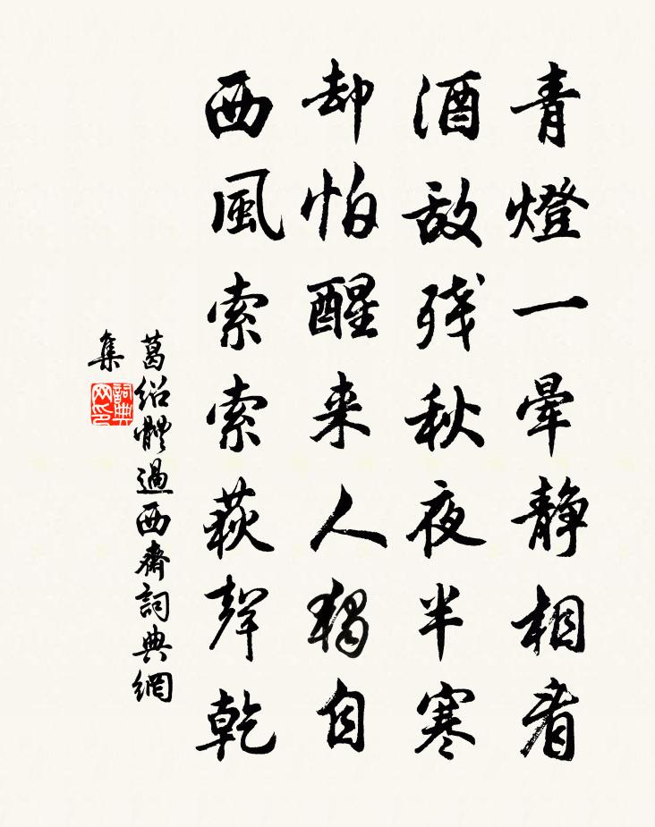 詩詞名句歷史字典書法欣賞書法字典國語詞典說文解字康熙字典古漢語字典標 題 作 者 詩 句 過西齋作者:葛紹體 朝代:宋代過西齋原文青燈一暈靜相看,酒敵殘秋夜半寒。卻怕醒來人獨自,西風索索荻聲乾。詩詞問答問:過西齋的作者是誰?答:葛紹體問:過西齋寫於哪個朝代?答:宋代葛紹體過西齋書法欣賞過西齋書法作品詩詞推薦塞上王建〔唐代〕漫漫復淒淒,黃沙暮漸迷。人當故鄉立,馬過舊營嘶。斷雁逢冰磧,回軍占雪溪。夜來山下哭,應是送降奚。送侯居父葉適〔宋代〕宅古竹陰晚,書殘燈焰稀。深知靜者趣,轉益宦情微。別殿行催甲,體工坐掩扉。御前清切地,重得薦皇闈。清風閣金君卿〔宋代〕勢壓最高峰,四軒橫斷虹。江山形勝外,疆場畫圖中。景物浩無主,塵襟到即空。何須遲炎暑,特地揖清風。呈文潛晁補之〔宋代〕無計河西尋杜家,海棠空詠去年花。煩君為謝郭少尹,欲買纏頭迎犢車。歷代詩西晉楊簡〔宋代〕晉人司馬氏,相魏敢專權。壹師昭不帝,追謚宣景文。武帝受魏禪,惠帝實童昏。劉聰害懷愍,由此失中原。梅花王炎〔宋代〕園林都未覺春風,蓓蕾枝頭茁小紅。要識十分清絕處,暗香疏影月明中。送史純父歸餘杭王銍〔宋代〕霜晴九月交,送子越東門。同舟此水上,再對波清渾。聚散三十載,惟此一意存。邦國有大慶,去承曠盪恩。我老就寢鄭剛中〔宋代〕夜坐蒼顏得酒紅,困來頭重觸屏風。徑趨布衩燈花落,夢在春寒細雨中。漁家傲李光〔宋代〕為恨。今歲寓昌江,二月三日與客游黎氏園,偶見桃花一枝。羊君荊華折以見贈,恍然如逢故人。歸插淨瓶中,累秋日臥病(一作秋日旅中)杜荀鶴〔唐代〕浮世浮名能幾何,致身流落向天涯。少年心壯輕為客,一日病來思在家。山頂老猿啼古木,渡頭新雁下平沙。不堪和汪正夫梅鄭獬〔宋代〕座中豪客洛陽才,醉舞春風拂袖來。明日卻尋歌管地,中庭空有折殘梅。北寺蘇軾〔宋代〕唐初傳有此,亂後不留碑。畏虎關門早,無村得米遲。山泉自入瓮,野桂不勝炊。信美那能久,應先學忍飢。湖上早行王同祖〔宋代〕錢塘門外買湖船,霧氣沖雲水接天。只有蘇堤金線柳,半籠早日半籠煙。宿蒼谿館劉滄〔唐代〕孤館門開對碧岑,竹窗燈下聽猿吟。巴山夜雨別離夢,秦塞舊山迢遞心。滿地莓苔生近水,幾株楊柳自成陰。空思題武夷趙宗吉〔宋代〕天風吹盡蔽空雲,疊嶂層巒勢吐吞。鐵笛聲沉人換世,幔亭宴罷竹生孫。崑閬境界煙霞窟,洙泗源流道義門。分治賦新繁周表權如詔亭陳昂〔明代〕封典寵岩穴,褒言華日星。其誰盡如詔,何暇更名亭。公昔善教子,家傳惟治經。當年雲榜揭,今日璽書形。籍已鷓鴣天晏幾道〔宋代〕綠橘梢頭幾點春。似留香蕊送行人。明朝紫鳳朝天路,十二重城五碧雲。歌漸咽,酒初醺。盡將紅淚濕湘裙。贛江槿花洪咨夔〔宋代〕露徑風籬取次芳,朝榮暮悴付流光。一秋朵朵紅相續,比著人情大段長。送樂平苗明府司空曙〔唐代〕天際山多處,東安古邑深。綠田通竹里,白浪隔楓林。詩有江僧和,門唯越客尋。應將放魚化,一境表吾心。知醉落魄/一斛珠韓元吉〔宋代〕紅蕖漾月。薰風特地生梧葉。一年風月今宵別。隱隱笙鸞,何處有炎熱。鳳凰山下榴花發。一杯香露融春雪。幔亭名句推薦路入南中,桄榔葉暗蓼花紅。歐陽炯《南鄉子·路入南中》 聞賢而不舉,殆;聞善而不索,殆;見能而不使,殆管仲《管子·法法》 巧笑倩兮,美目盼兮。佚名《碩人》 不可同日而語畢沅《續資治通鑑·宋紀·宋紀七十三》 志之難也,不在勝人,在自勝。韓非及後人《韓非子·喻老》 床前明月光,疑是地上霜。李白《靜夜思》 日歸功未建,時往歲載陰。陸機《猛虎行》 我來一長嘆,知是東溪蓮。白居易《京兆府栽蓮》 寄語東陽沽酒市,拼一醉,而今樂事他年淚。朱服《漁家傲·小雨纖纖風細細》 漸紅濕杏泥,愁燕無語。吳文英《掃花游·西湖寒食》