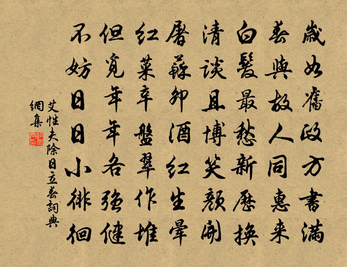 詩詞名句歷史字典書法欣賞書法字典國語詞典說文解字康熙字典古漢語字典標 題 作 者 詩 句 除日立春作者:艾性夫 朝代:宋代除日立春原文歲如舊政方書滿,春與故人同惠來。白髮最愁新曆換,清談且博笑顏開。屠蘇卯酒紅生暈,紅菜辛盤翠作堆。但覓年年各強健,不妨日日小徘徊。詩詞問答問:除日立春的作者是誰?答:艾性夫問:除日立春寫於哪個朝代?答:宋代問:除日立春是什麼體裁?答:七律艾性夫除日立春書法欣賞除日立春書法作品詩詞推薦湖上寓居雜詠 其四姜夔〔宋代〕處處虛堂望眼寬,荷花荷葉過欄乾。遊人去後無歌鼓,白水青山生晚寒。呈公擇二首趙蕃〔宋代〕此地無此客,若人吾故人。論文皆意到,出語見情真。未議作輕別,且當留浹旬。畦蔬飽春雨,小摘未妨頻。鴛鴦湖棹歌 之六十朱彝尊〔清代〕九里橋西落照銜,櫻桃初熟鳥爭鵮。須知美酒烏程到,遙見新塍一片帆。過髦塘渡楊萬里〔宋代〕雪浪無堅岸,金沙有退痕。斷橋猶半板,漱樹欲枯根。為問新來漲,今年第幾番?昨來愁此渡,已濟不堪論。相和歌辭。棲烏曲二首劉方平〔唐代〕蛾眉曼臉傾城國,鳴環動佩新相識。銀漢斜臨白玉堂,芙蓉行障掩燈光。畫舸雙艚錦為纜,芙蓉花發蓮葉暗。門前夏夜陸游〔宋代〕乞骸安晚節,養疾臥空村。月暗梟鳴樹,船歸犬吠門。藜羹加糝美,黍酒帶醅渾。稚子能勤學,燈前與細論。千葉梅楊公遠〔宋代〕千葉梅開一樣清,向人含笑似多情。化工只么寧多巧,碎剪瓊瑤細簇成。松江使君張周卿致泖口蟹四十輩方回〔宋代〕松江太守今賢侯,喜有螃蟹無監州。左手持螯右杯酒,文章政事第一流。吳由今年十分秋,各執稻穗朝厥酋。初生夏日即事張九成〔宋代〕拂袖歸來好,親朋語笑真。山高多爽氣,溪迥只清淪。簾幕深無暑,琴樽靜照人。短衫吳轂細水長流,團扇越羅新陳君美許仲和赴省病不能出餞以二絕句陳造〔宋代〕何人把酒送揚舲,定復從容柳下亭。共說歸時柳陰合,與君衫色鬧青青。小憩二龍爭珠,蓋兩長嶺夾一圜峰故名。自此楊萬里〔宋代〕田路直復縈,肩輿斜還正。如何晴三日,猶自滑一徑。缺岸有危踐,方軫無穩興。不跌先獨驚,稍坦深自慶。肯信大中祥符五嶽加帝號祭告八首佚名〔宋代〕嚴嚴神岳,作鎮中央。肅奉徽冊,尊名孔章。聿降飈駕,載獻蘭觴。熙事允洽,實祚彌昌。情詩其二十六倉央嘉措〔清代〕故園迢迢憶雙親,每對卿卿淚滿襟。千山萬水相追尋,始信卿心勝娘心。梅開次韻答葉教授二首項安世〔宋代〕春風一點暗驚梅,便有千花動地開。卻似德人方寸事,等間流向筆端來。憲使陳習庵先生除司業趙孟堅〔宋代〕連宵對涼月,閒吟祖行篇。攬挹南卉香,入句期清妍。追隨剪吳江,送君翔九天。豈為兒女情,戀戀祈恩憐。茲惟賀謝景芳得第四男王邁〔宋代〕每愛君家玉滿階,仙宮今又見琨台。父兮定得鈴旗夢,母也須懷磬石胎。羯末封胡和有種,復臨泰壯看朋來。林家和六十叔二絕杜范〔宋代〕夕陽有意為人留,斜映寒江著小舟。遠目遙岑無限意,不須蕭瑟賦悲秋。老兒詩五十韻張師錫〔宋代〕鬢髮盡皤然,眉分白雪鮮。週遮延客話,傴僂抱孫憐。無病常供粥,非寒亦衣綿。假溫衾擁背,借力杖搘肩。貌比挽軍器監簿周公子及廖行之〔宋代〕一經同雁塔,再入並鴛行。方喜為寮好,那知夢奠傷。學多應損壽,文富幸流芳。有士奇如此,雲溪奈閟藏。太守趙山甫示和篇次韻為謝周必大〔宋代〕阿嬌金屋聚芳菲,當御銀環序妾妃。龍女墜天頩素頰,鮫人出水織纁衣。袖垂戶外瞻雙引,燕在宮中第一飛。不用名句推薦誰家玉笛暗飛聲,散入春風滿洛城。李白《春夜洛城聞笛 / 春夜洛陽城聞笛》 傷人一語,利如刀割。佚名《增廣賢文·上集》 低花樹映小妝樓,春入眉心兩點愁。白居易《春詞》 曉月墜,宿雲微,無語枕頻欹。李煜《喜遷鶯·曉月墜》 一人飛升,仙及雞犬。蒲松齡《聊齋志異·卷四·促織》 愁里高歌梁父吟,猶如金玉戛商音。鄭思肖《二礪》 惟仁者宜在高位。孟子《孟子·離婁章句上·第一節》 金井梧桐秋葉黃,珠簾不捲夜來霜。王昌齡《長信怨》 紛紛墜葉飄香砌。夜寂靜,寒聲碎。范仲淹《御街行·秋日懷舊》 紫陌紅塵拂面來,無人不道看花回。劉禹錫《元和十年自朗州至京戲贈看花諸君子 / 玄都觀桃花》