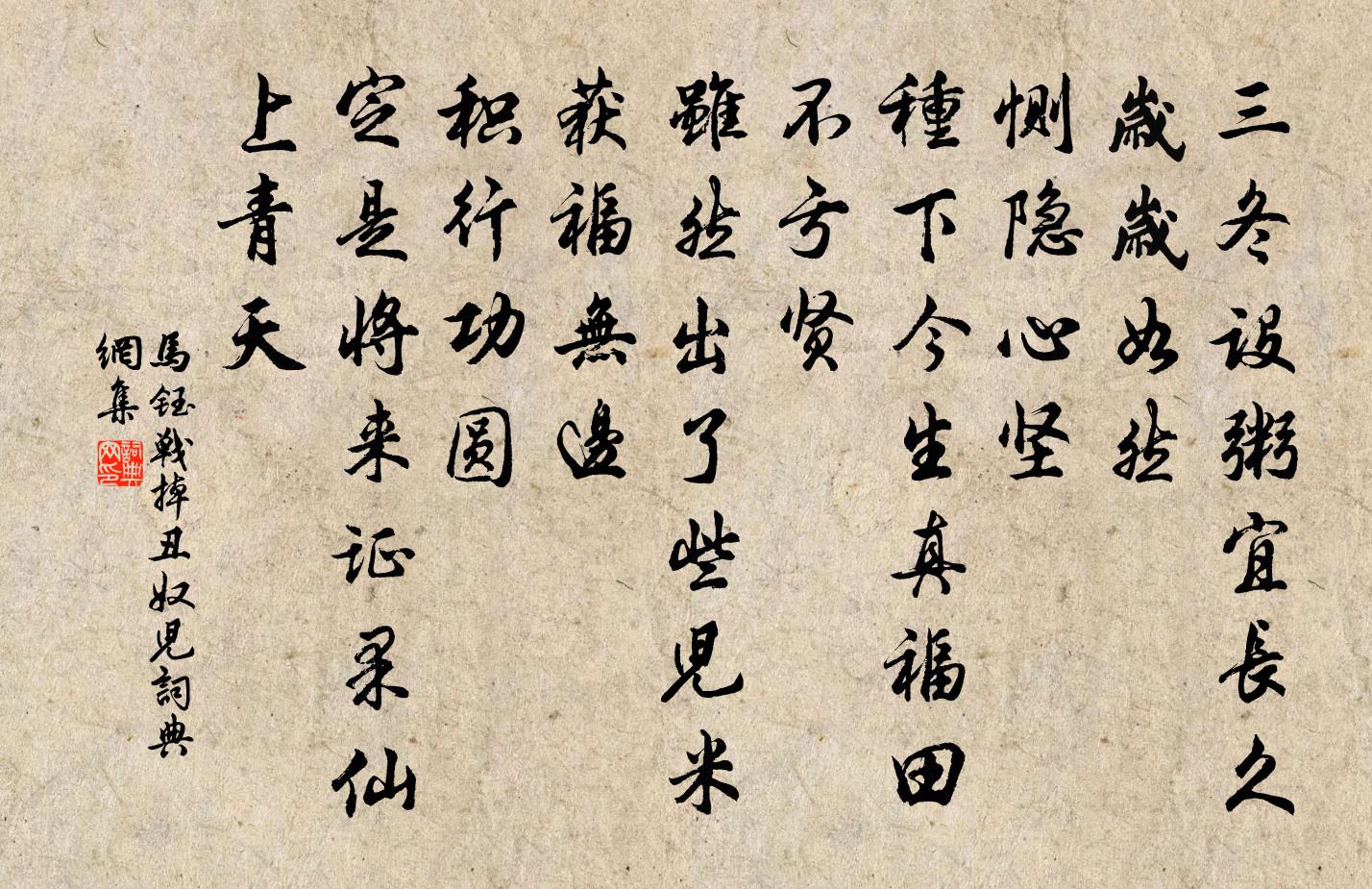 詩詞名句歷史字典書法欣賞書法字典國語詞典說文解字康熙字典古漢語字典標 題 作 者 詩 句 戰掉醜奴兒作者:馬鈺 朝代:元代戰掉醜奴兒原文三冬設粥宜長久,歲歲如然。惻隱心堅。種下今生真福田。不虧賢。雖然出了些兒米,獲福無邊。積行功圓。定是將來證果仙。上青天。詩詞問答問:戰掉醜奴兒的作者是誰?答:馬鈺問:戰掉醜奴兒寫於哪個朝代?答:元代問:戰掉醜奴兒是什麼體裁?答:詞馬鈺戰掉醜奴兒書法欣賞戰掉醜奴兒書法作品詩詞推薦和樓大防韻吳芾〔宋代〕嗟余本何人,累然居海嶠。家世業為農,有田在岩窔。春到耦妻耕,寒來從母漂。屋角日誅茅,杖頭時荷蓧。迨冠祭方丘樂章順和褚亮〔唐代〕萬物資以化,交泰屬昇平。易從業惟簡,得一道斯寧。具儀光玉帛,送舞變鹹英。黍稷良非貴,明德信惟馨。漁家傲佚名〔宋代〕好。說聰明也,孔仲尼安可齊肩;論道德也,李伯陽故應縮首。絕倫武略,獨戰退八萬四千魔兵;蓋世良才,復論歌舞李商隱〔唐代〕遏雲歌響清,回雪舞腰輕。只要君流眄,君傾國自傾。感事李石〔宋代〕踏碓村舂急,繰車並舍忙。雀桃紅綴吻,鶯粟碧成囊。歸燕詞李建勛〔唐代〕羽翼勢雖微,雲霄亦可期。飛翻自有路,鴻鵠莫相嗤。待侶臨書幌,尋泥傍藻池。沖人穿柳徑,捕蝶繞花枝。廣廈採蓮曲吳浚〔宋代〕見蓮知菂實,尋藉□絲長。六月天邊路,何時結得霜。酹江月(詠梅)葛長庚〔宋代〕孤村籬落,玉亭亭、為問何其清瘦。欲語還愁誰索笑,臨水嫣然自照。甘受淒涼,不求識賞,風致何高妙。松挨竹偈頌三十首釋印肅〔宋代〕佛是西天之梵語,此土將覺義以同名。心邊不覺屬眾生,心轉覺時一切佛。佛開口處為言教,化導迷心轉覺心。眾蔡峰似徐鱗卿陳著〔宋代〕老去襟懷得喪齊,東風吹暖送行藜。群山捧谷雲居下,一嶺分疆水向西。有路不來多事馬,滿村交唱太平雞。主人緱山置酒元好問〔金代〕靈宮肅清曉,細柏含古春。人言王子喬,鶴馭此上賓。白雲山蒼蒼,平田木欣欣。登高覽元化,浩蕩融心神。西望臘日驪山渡逢故人徐璣〔宋代〕天寒多木葉,愁思滿溪濱。惆悵往來渡,經行多少人。時情獨重臘,歲事每占春。與爾他鄉旅,誰當懷抱新。過襄陽李復〔宋代〕表里山川舊楚畿,築關乘險事皆非。槎頭魚盡無新語,峴首人亡失隱扉。雲外煮茶僧室靜,江邊酤酒客帆歸。我來秋晚陸游〔宋代〕春粳入甑香炊玉,壓酒鳴槽滴碎珠。甲第朱門漫豪侈,山家風味定應無。福先寺雪中餞劉蘇州白居易〔唐代〕送君何處展離筵,大梵王宮大雪天。庾嶺梅花落歌管,謝家柳絮撲金田。亂從紈袖交加舞,醉入籃輿取次眠。卻笑漢宮春(壬午開爐日戲作)劉辰翁〔宋代〕雨入輕寒,但新篘未試,荒了東籬。朝來暗驚翠袖,重倚屏幃。明窗麗閣,為何人、冷落多時。催重頓,妝檯側畔金陵道陸龜蒙〔唐代〕北雁行行直,東流澹澹春。當時六朝客,還道帝鄉人。烏衣巷任希夷〔宋代〕關車暇日勞揮塵,玉樹春風自滿庭。欲問烏衣舊時事,靜無秋燕有秋螢。謝侃老送苦筍袁說友〔宋代〕籜老泯黃千仞種,箇中風味亦佳哉。誤人政為甘言誘,愛我從渠苦口來。次韻吳可權題餘干縣白雲亭黃庭堅〔宋代〕曩誰築孤亭,勝日有感遇。永懷劉隨州,因榜白雲句。遺老不能談,歲月忽成屢。綠陰斤斧盡,華屋風雨仆。吳侯名句推薦鳥雀呼晴,侵曉窺檐語。周邦彥《蘇幕遮·燎沉香》 只恐雙溪舴艋舟,載不動許多愁。李清照《武陵春·春晚》 明妃留在兩眉愁,萬古春山顰不盡元好問《玉樓春·驚沙獵獵風成陣》 柳柔搖不定,草短綠應難。張惠言《風流子·出關見桃花》 王者以民為天,而民以食為天。班固《漢書·傳·酈陸朱劉叔孫傳》 報答春光知有處,應須美酒送生涯。杜甫《江畔獨步尋花七絕句》 鴛鴦俱是白頭時,江南渭北三千里。賀鑄《惜余春·急雨收春》 足不強則跡不遠,鋒不銛,則割不深。王充《論衡·卷十三·超奇篇》 天時不如地利,地利不如人和。孟子《孟子·公孫丑章句下·第一節》 譬道之在天下,猶川谷之於江海。老子《老子·道經·第三十二章》