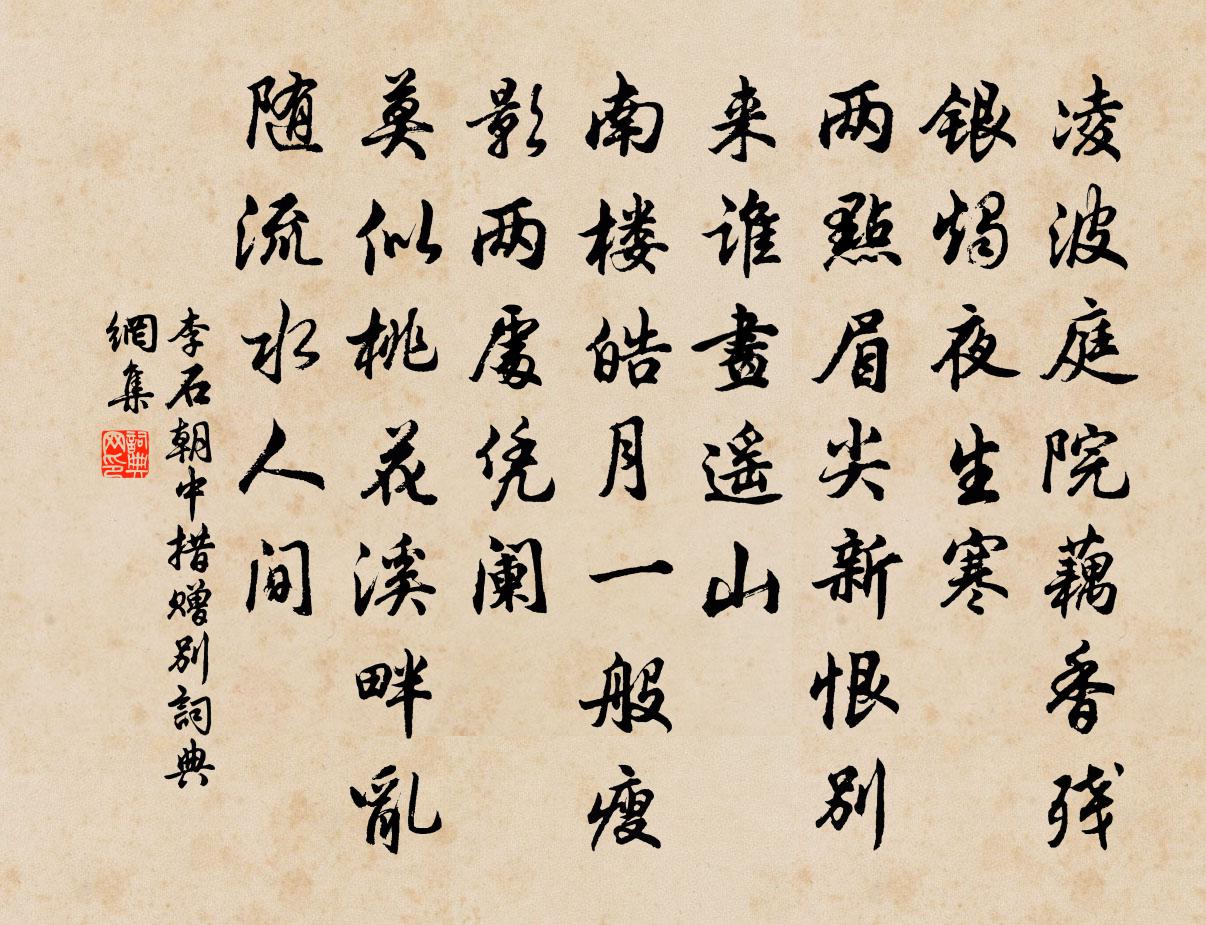 詩詞名句歷史字典書法欣賞書法字典國語詞典說文解字康熙字典古漢語字典標 題 作 者 詩 句 朝中措(贈別)作者:李石 朝代:宋代朝中措(贈別)原文凌波庭院藕香殘。銀燭夜生寒。兩點眉尖新恨,別來誰畫遙山。南樓皓月,一般瘦影,兩處憑闌。莫似桃花溪畔,亂隨流水人間。詩詞問答問:朝中措(贈別)的作者是誰?答:李石問:朝中措(贈別)寫於哪個朝代?答:宋代問:朝中措(贈別)是什麼體裁?答:詞李石朝中措(贈別)書法欣賞朝中措(贈別)書法作品詩詞推薦芙蓉蘇軾〔宋代〕清飆已拂林,積水漸收潦。溪邊野芙蓉,花水相媚好。坐看池蓮盡,獨伴霜菊槁。幽姿強一笑,暮景迫摧倒。淒涼西湖雜詠·夏薛昂夫〔元代〕晴雲輕漾,薰風無浪,開樽避暑爭相向。映湖光,逞新妝。 笙歌鼎沸南湖盪,今夜且休回畫舫。風,滿座涼;蓮書林十景詩謝枋得〔宋代〕長虹跨陸登雲衢,會同海宇皆車書。日斜市潰夜喧息,月來雲靜天無疵。水劫金蟇形不術,常生玉兔藥常搗。可憐湖州李使君聞予游廬山寄書云為我一謝清絕陳舜俞〔宋代〕道微本一致,喧靜偶殊轍。眷言朝廷士,何必山水悅。李侯稟靈氣,家園鄰大別。廬峰五千仞,曾上捫日月。一隨舟中晚酌二首楊萬里〔宋代〕竹陵春酒絕清嚴,解割詩腸快似鎌。雪藕逢暄偏覺爽,鵝梨欲爛不勝甜。偈頌一百三十六首釋惟一〔宋代〕瞿曇未解這一著,雪嶺六年空卜度。不知眼病見空花,認作明星一何錯。自累猶可,更累兒孫。珊瑚枕上兩行淚,和答北山劉克莊〔宋代〕北山當代文章祖,孔思周情幸未泯。弟子力疲心尚在,先生齒宿意逾新。今無斬鼻成風手,古有埋腰立雪人。不向山塞司馬光〔宋代〕邊草荒無路,星河秋夜明。卷旗遮虜塞,歇馬受降城。霜重征衣薄,風高戰鼓鳴。將軍功示厭,士卒不鬚生。贈韓郎中愈孟郊〔唐代〕何以定交契,贈君高山石。何以保貞堅,贈君青松色。貧居過此外,無可相彩飾。聞君碩鼠詩,吟之淚空滴。碩鼠舟中夕望陸游〔宋代〕船掠湖堤不入城,葛巾羽扇試春行。女牆迤邐橫輕靄,佛閣崢嶸倚晚晴。樹冒藤花堆故繡,風吹鶯語送新聲。細思白鹿洞方岳〔宋代〕茲山信雄深,鍾梵上雲雨。微吾紫陽翁,幾何不豪取。有來青牛車,肯作白鹿主。詩書夜披之,一變至鄒魯。唐虞馬華父母葉氏輓詞王柏〔宋代〕苕溪猩鬼兮呼嘯幽篁,繡衣一出兮血膏斧鋩。笳鼓歸來兮拜舞北堂,潢池夷靖兮母訓是將。慈顏開喜兮家國之祥,偶作貫休〔唐代〕君子稱一善,馨香遍九垓。小人妒一善,處處生嫌猜。口如暴死人,鐵尺拗不開。稂莠蝕田髓,積陰成冬雷。因知送長沙陳太守其二李白〔唐代〕七郡長沙國。南連湘水濱。定王垂舞袖。地窄不回身。莫小二千石。當安遠俗人。洞庭鄉路遠。遙羨錦衣春。周路分輓詞樓鑰〔宋代〕台嶺論交契,天街惜別離。飛書能幾到,埋璧遽成悲。舊識歸樵句,愁看結局詩。紫髯無復夢,空有淚交頤。又和梅堯臣〔宋代〕康莊咫尺有千山,欲問紫姑應已還。人似常娥來陌上,燈如明月在雲間。車頭小女雙垂髻,簾里新妝一破顏。卻下贈萬年胡主簿釋懷古〔宋代〕廉可繼懸魚,官清術有餘。民田侵廢苑,公署似間居。草長通囹圄,花飛落簿書。見君松操直,經考只如初。次韻胡梅瀧許月卿六〔宋代〕對梅花每恨匆匆,竟日望斷胡梅瀧。欲往從之秋水隔,參橫月落夢渠儂。金陵周師成〔宋代〕故國已雲久,地餘風流情。山花不斷市,江鷗長入城。青溪泓玉水,紅樓調春聲。斟酌飛仙過,枉轡一來行。於主簿廳看花王建〔唐代〕小葉稠枝粉壓摧,暖風吹動鶴翎開。若無別事為留滯,應便拋家宿看來。名句推薦日日深杯酒滿,朝朝小圃花開。朱敦儒《西江月·日日深杯酒滿》 借問漢宮誰得似,可憐飛燕倚新妝。李白《清平調·其二》 卷旗夜劫單于帳,亂斫胡兒缺寶刀。馬戴《出塞詞》 誰人背後無人說,哪個人前不說人?佚名《增廣賢文·上集》 醉里且貪歡笑,要愁那得工夫。辛棄疾《西江月·遣興》 去年寄書報陽台,今年寄書重相催。李白《久別離》 風回小院庭蕪綠,柳眼春相續。李煜《虞美人·風回小院庭蕪綠》 東風力,快將雲雁高送。吳文英《宴清都·送馬林屋赴南宮分韻得動字》 輕陰池館水平橋,一番弄雨花梢。陳子龍《畫堂春·雨中杏花》 閉門家裡坐,禍從天上來。馮夢龍《醒世恆言·卷十六》