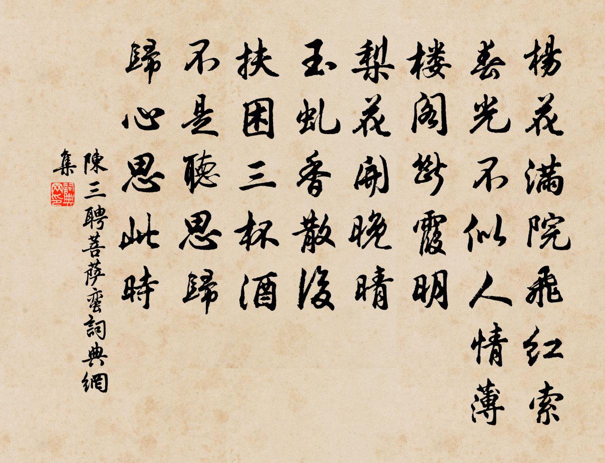 詩詞名句歷史字典書法欣賞書法字典國語詞典說文解字康熙字典古漢語字典標 題 作 者 詩 句 菩薩蠻作者:陳三聘 朝代:宋代菩薩蠻原文楊花滿院飛紅索。春光不似人情薄。樓閣斷霞明。梨花開晚晴。玉虬香散後。扶困三杯酒。不是聽思歸。歸心思此時。詩詞問答問:菩薩蠻的作者是誰?答:陳三聘問:菩薩蠻寫於哪個朝代?答:宋代問:菩薩蠻是什麼體裁?答:詞陳三聘菩薩蠻書法欣賞菩薩蠻書法作品詩詞推薦送別李毅高宣教葉適〔宋代〕堪嘆媧皇六葉孫,直將豪武蓋諸昆。黃金散盡身如寄,閒管春風白下門。歲暮感懷以餘年諒無幾休日愴已迫為韻陸游〔宋代〕昨暮送客歸,短棹過魯墟。故廬有遺趾,青山遶牆隅。桑竹雖郁然,舊植已無餘;瓦礫不可求,而況屋壁書。繫舟楊秀才書屋有墨竹一枝為其添補數葉五絕胡寅〔宋代〕掃盡鵝溪匹練霜,未知三尺映茅堂。此君不是塵中物,何必區區較色香。晝錦堂(荷花)蔣捷〔宋代〕染柳煙消,敲菰雨斷,歷歷猶寄斜陽。掩冉玉妃芳袂,擁出靈場。倩他鴛鴦來寄語,駐君舴艋亦何妨。漁榔靜,獨米元章壯觀後帖贊岳珂〔宋代〕四期之不到,雪與日杲。停舟不棹,無嫌乎沖冒。出此詩畫,摹寫天巧。觀之壯,思之老,詩乎可考。再和前韻蛾眉亭王奕〔宋代〕天經地緯脫籠羈,團拓乾坤作彈泥。採石青山知己少,渝州明月為誰題。令公望重恩尤重,杜老名齊命亦齊。擬和蝶戀花·欲減羅衣寒未晏幾道〔宋代〕欲減羅衣寒未去,不捲珠簾,人在深深處。殘杏枝頭花幾許,紅恨清明雨。盡日沉香菸一縷,宿酒醒遲,惱破春情葉少蘊生朝張元乾〔宋代〕先生早貴當天升,文章爾雅傳六經。腹包萬卷書縱橫,玉堂草制群公驚。繡韉綠髮趨承明,意氣已向沙堤行。出入頌古十一首釋鹹傑〔宋代〕出得何如未出時,瞎驢成隊喪全機。而今四海平如砥,蘆管迎風撩亂吹。菩薩蠻程垓〔宋代〕和風暖日西郊路。遊人又踏青山去。何處碧雲衫。映溪才兩三。疏鬆分翠黛。故作羞春態。回首杏煙消。月明歸渡太碩人潘氏輓詞樓鑰〔宋代〕玉映清心著壺彜,閨房賓敬到齊眉。豈惟山水協高趣,更為國家生好兒。萬口共推諸福備,八旬猶負一年期。伯仁哭孔戡白居易〔唐代〕洛陽誰不死?戡死聞長安。我是知戡者,聞之涕泫然。戡佐山東軍,非義不可乾。拂衣向西來,其道直如弦。從事看弄潮高翥〔宋代〕弄罷江潮晚入城,紅旗颭颭白旗輕。不因會吃翻頭浪,爭得天街鼓樂迎。偈頌二百零五首釋正覺〔宋代〕不可得一,不可得異,我如是也彼如是。兩莖眉現燄光身,百草頭揚祖師意。歸雲誰使就青山,落華自得隨流水。便縣懷古阮閱〔宋代〕兔葵燕麥撼春風,廢址頹垣古縣封。聚落已遷江上去,隔林已舊雨三峰。南湖書齋張鎡〔宋代〕雨深愁入樹花飄,盡際翻晴現帝霄。目力壯時蒼岫長,心情閒處戲魚跳。秋雲總是詩家物,夜市今連里陌橋。船子三峰寺真山民〔宋代〕寂寞煙林噪亂鴉,青鞋步入野僧家。雲深不礙鐘聲郵,日轉還移塔影斜。廊下蝸黏沿砌蘚,佛前蜂戀插瓶花。竹床歲除李洪〔宋代〕客里光陰又一年,人情真復似憐蚿。家貧尚有春名酒,才拙安能雪命篇。弱柳經霜半凋落,修篁沐雨更便娟。親交生查子·關山魂夢長晏幾道〔宋代〕關山魂夢長,魚雁音塵少。兩鬢可憐青,只為相思老。歸夢碧紗窗,說與人人道。真箇別離難,不似相逢好。投宿清福寺趙蕃〔宋代〕落日迷墟落,林霏隔樹林。入門疑寺近,出谷聽鍾深。墐戶覓安寢,隔籬謀濁斟。不眠還耿耿,百眠攪予心。名句推薦悠悠卷旆旌,飲馬出長城。李世民《飲馬長城窟行》 肉腐出蟲,魚枯生蠹。荀子《荀子·勸學》 滿載一船秋色,平鋪十里湖光。張孝祥《西江月·阻風山峰下》 晚妝初了明肌雪,春殿嬪娥魚貫列。李煜《木蘭花·晚妝初了明肌雪》 紫菊氣,飄庭戶,晚煙籠細雨。李煜《謝新恩·冉冉秋光留不住》 倚闌凝望,獨立漁翁滿江雪。李綱《六么令·次韻和賀方回金陵懷古鄱陽席上作》 鳥向平蕪遠近,人隨流水東西。劉長卿《謫仙怨·晴川落日初低》 思君如滿月,夜夜減清輝。張九齡《賦得自君之出矣》 仲夏苦夜短,開軒納微涼。杜甫《夏夜嘆》 聖人不期修古,不法常可,論世之事,因為之備。韓非及後人《韓非子·五蠹》