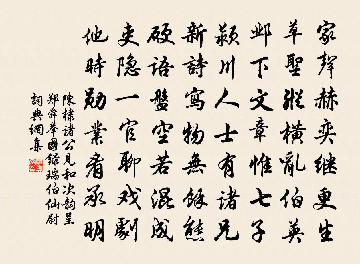 詩詞名句歷史字典書法欣賞書法字典國語詞典說文解字康熙字典古漢語字典標 題 作 者 詩 句 諸公見和次韻呈鄭舜舉國錄瑞伯仙尉作者:陳棣 朝代:宋代原文家聲赫奕繼更生,草聖縱橫亂伯英。鄴下文章惟七子,潁川人士有諸兄。新詩寫物無餘態,硬語盤空若混成。吏隱一官聊戲劇,他時勳業看承明。詩詞問答問:《諸公見和次韻呈鄭舜舉國錄瑞伯仙尉》的作者是誰?答:陳棣問:該詩寫於哪個朝代?答:宋代書法欣賞諸公見和次韻呈鄭舜舉國錄瑞伯仙尉書法作品詩詞推薦青玉案吳潛〔宋代〕黃昏先自無情緒。更幾陣、風和雨。閒把樓頭更點數。挑殘燈燼,裝成香縷。此際憑誰訴。新詞舊曲歌還住。欲說夜坐次林海山韻黃庚〔宋代〕人倚幽窗夜未闌,竹爐灰冷篆煙殘。一天露氣星辰濕,萬壑風聲草木寒。老去客懷多感慨,年來世事轉艱難。何時過景陵李商隱〔唐代〕武皇精魄久仙升,帳殿淒涼煙霧凝。俱是蒼生留不得,鼎湖何異魏西陵。保福萃長老寫師像求贊釋正覺〔宋代〕少食棗而齒黃,老飽鹽而癭亡。兔分月魄入犀角,蜂採華滋歸蜜房。源深流長,體明用光。巍巍堂堂,煒煒煌煌。題新竹示韋德卿趙蕃〔宋代〕戢戢初成茁,駸駸漸可竿。朝幽粉淚漬,午靜籜聲乾。枝且勝棲羽,陰仍合翠寒。書齋有餘暇,可以過予看。羅敷歌(採桑子·五之四)賀鑄〔宋代〕自憐楚客悲秋思,難寫絲桐。目斷書鴻。平淡江山落照中。誰家水調聲聲怨,黃葉西風。罨畫橋東。十二玉樓空更重陽高適〔唐代〕節物驚心兩鬢華,東籬空繞未開花。百年將半仕三已,五畝就荒天一涯。豈有白衣來剝啄,一從烏帽自欹斜。真成種藥苗二首其一種甖粟蘇轍〔宋代〕甖小如甖,粟細如粟。與麥皆種,與穄皆熟。苗堪春菜,實比秋谷。研作牛乳,烹為佛粥。過劉全美所居王安石〔宋代〕西崦晴天得強扶,出林知有故人居。數能過我論奇字,當復令公見異書。贈龜山慧海長老敖陶孫〔宋代〕向來縛虎正死急,今日看牛無可鞭。我提審定之兩印,十年勘盡諸方禪。浙東西山好僧相,頭目靜如秋水蓮。試令春夜竹亭贈錢少府歸藍田王維〔唐代〕夜靜群動息。時聞隔林犬。卻憶山中時。人家澗西遠。羨君明發去。采蕨輕軒冕。寄懷趙南紀二首趙蕃〔宋代〕自別匡廬去,名山不再逢。圖看白鹿洞,詩詠紫霄峰。泉石難名狀,煙雲幾許重。巾車君儻命,襆被我斯從。翫庭柳詩沈約〔南北朝〕輕陰拂建章。夾道連未央。因風結復解。沾露柔且長。楚妃思欲絕。班女淚成行。遊人未應去。為此還故鄉。塞翁吟周邦彥〔宋代〕暗葉啼風雨,窗外曉色瓏。散水麝,小池東。亂一岸芙蓉。蘄州簟展雙紋浪,輕帳翠縷如空。夢念遠別、淚痕重鶯啼序(感懷)劉辰翁〔宋代〕匆匆何須驚覺,喚草廬人起。算成敗利鈍,非臣逆睹,至死後已。又何似、採桑八百,看蠶夜織小窗里。漫二升自和劉逸老題羅漢壁間韻李處權〔宋代〕僧房元寂寂,客意遂陶陶。詩筆翻雲錦,茶甌捲露濤。鴉歸寒日下,雪盡遠峰高。尚喜王喬近,吹笙坐碧桃。薛端明挽章三首曹彥約〔宋代〕客本何為者,逢公幕府開。兵間雖有志,度外本非才。流不音何在,高風首屢回。只今岩石望,寧忍泰山頹。秋思陸游〔宋代〕烏柏微丹菊漸開,天高風送雁聲哀。詩情也似並刀快,翦得秋光入捲來。送王庾宋祁〔宋代〕土甑殘炊黍,津航促扣舷。雲迷孝王苑,星認太丘躔。破瑟弦鵾舞,吟囊錦獸鮮。晚淮他夜月,離思共娟娟。莫折花文同〔宋代〕莫折花,花好亦自喜。勿謂花無言,請以君心酌花意。君容待花轉豐艷,花枝因君愈憔悴。莫折花,任花飛落地。名句推薦人生大病,只是一傲字。王陽明《傳習錄·卷下·門人黃以方錄》 少年射虎名豪,等閒赤羽千夫膳元好問《水龍吟·從商帥國器獵於南陽同仲澤鼎玉賦此》 生生死死,非物非我,皆命也,智之所無柰何。列子及其弟子《列子·力命》 銅壺漏報天將曉,惆悵佳期又一年。羅隱《七夕》 醉別江樓橘柚香,江風引雨入舟涼。王昌齡《送魏二》 風緊雁行高,無邊落木蕭蕭。納蘭性德《河瀆神·風緊雁行高》 醉後莫思家,借取師師宿。晏幾道《生查子·落梅庭榭香》 聞君有兩意,故來相決絕。卓文君《白頭吟》 晚春盤馬踏青苔,曾傍綠陰深駐。晏幾道《御街行·街南綠樹春饒絮》 雲中亂拍祿山舞,風過重巒下笑聲。杜牧《過華清宮絕句三首》