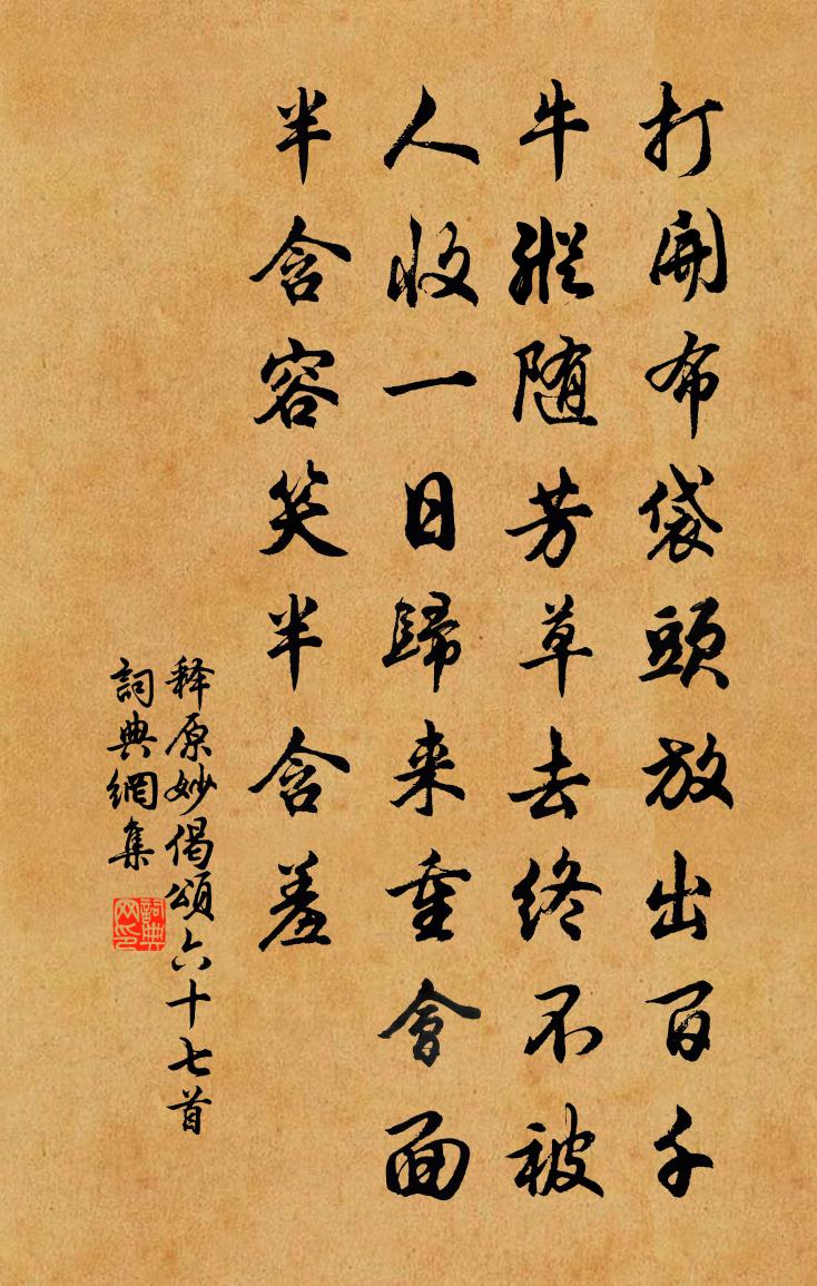 詩詞名句歷史字典書法欣賞書法字典國語詞典說文解字康熙字典古漢語字典標 題 作 者 詩 句 偈頌六十七首作者:釋原妙 朝代:宋代偈頌六十七首原文打開布袋頭,放出百千牛。縱隨芳草去,終不被人收。一日歸來重會面,半含容笑半含羞。詩詞問答問:偈頌六十七首的作者是誰?答:釋原妙問:偈頌六十七首寫於哪個朝代?答:宋代釋原妙偈頌六十七首書法欣賞偈頌六十七首書法作品詩詞推薦霜天曉角趙師俠〔宋代〕雨餘風勁。霧重千山暝。茅舍寒林相映。分明是、圖畫景。去程何日定。天遠長安近。喚起新愁無盡。全沒個、故疇依王柏〔宋代〕湯聘莘尹,五進就桀。天命人歸,鳴條自葛。以義制事,以禮制心。日新厥德,鑒此盤銘。西州直示同員詩何遜〔南北朝〕日長禁戶倦。即事思短晨。漏盡唱聲急。此理復傷人。矛盾交為論。光璧帶成珍。誓將收飲啄。得得任心神。頌古九首釋普信〔宋代〕寥寥風月臥煙霞,百鳥從茲不獻花。人義盡從貧處斷,世情偏向有錢家。次韻嵇仲春日二首李彌遜〔宋代〕欲挽餘芳近酒卮,丁寧紅紫莫相違。縱無風雨飄零去,已是愁蜂燕子歸。見兒侄唱酬次韻五首蘇轍〔宋代〕宇宙非不寬,閉門自為阻。心知外塵惡,且忍閒居苦。跏趺默非睡,龕燈翳復吐。道士為我言,嬰兒出歌舞。太常引 武昌別墅許有壬〔元代〕胭脂山下老農家。看雪樹、翠交加。香透小窗紗。是昨夜、幽蘭放花。引泉澆樹,破苔移菊,更種故侯瓜。一笑有北樓宋祁〔宋代〕危樓孤堞共巑岏,怒激號風結暝寒。校尉登臨非廣武,王孫回望即長安。來麰蔽隴蹊牛下,密綱橫山獵騎攢。梁霰臨江仙 送光州曾使君周紫芝〔宋代〕記得武陵相見日,六年往事堪驚。回頭雙鬢已星星。誰知江上酒,還與故人傾。鐵馬紅旗寒日暮,使君猶寄邊城。答宣闐司理梅堯臣〔宋代〕風賦義趣深,傳訓或得失。後人語雖淺,辨識猶百一。歐陽最我知,初時且尚窒。比以為橄欖,回甘始稱述。老於皇帝上平上皇帝壽樂曲公卿入門用禮安之曲崔敦詩〔宋代〕端闈肅啟,金奏和聲。有來濟濟,燁其華纓。度中規矩,步協英莖。一人達孝,百辟丕承。四字令韓奕〔元代〕茶蘼送香。枇杷映黃。園池偷換春光。正人間晝長。鳩鳴在桑。鶯啼近窗。行人遠去他鄉。正離愁斷腸。偈二首釋南雅〔宋代〕紫蕨伸拳筍破梢,楊花飛盡綠陰交。分明西祖單傳句,黃栗留嚕燕語巢。題陳待制湖樓徐照〔宋代〕天游觀妙化,人世事皆輕。沆瀣藏仙境,津涯截海城。一身潛汗漫,品類仰高明。有道行藏小,無心視聽精。上疑菩薩蠻佚名〔宋代〕宮樣迎春髻。玉步金蓮細。初度是今朝。嫦娥降九宵。蘭玉行榮貴。德備共姜義。夏半月團圓。稱觴祝壽筵。胡楚賓謠佚名〔唐代〕胡楚賓,李翰林。詞同三峽水,字值雙南金。當欲游南山行曹植〔魏晉〕東海廣且深。由卑下百川。五嶽雖高大。不逆垢與塵。良木不十圍。洪條無所因。長者能博愛。天下寄其身。大匠一雨二十日陸游〔宋代〕一雨二十日,雨意殊未闌。我廬大澤中,四顧煙水寬。東家有小舟,借我不作難。鸕鶿與鵁鶄,自是平生歡。更作步東坡白居易〔唐代〕朝上東坡步,夕上東坡步。東坡何所愛?愛此新成樹。種植當歲初,滋榮及春暮。信意取次栽,無行亦無數。綠陰驀山溪毛滂〔宋代〕梅花初謝,雪後寒微峭。誰送一城春,綺羅香、風光窈窕。插花走馬,天近寶鞭寒,金波上,玉輪邊,不是紅塵道名句推薦南陵水面漫悠悠,風緊雲輕欲變秋。杜牧《南陵道中 / 寄遠》 青箬笠,綠蓑衣,斜風細雨不須歸。張志和《漁歌子·西塞山前白鷺飛》 黃河水繞漢宮牆,河上秋風雁幾行。李夢陽《秋望》 一番桃李花開盡,惟有青青草色齊。曾鞏《城南·雨過橫塘水滿堤》 論德而定次,量能而授官。荀子《荀子·君道》 春風疑不到天涯,二月山城未見花。歐陽修《戲答元珍》 十年生死兩茫茫,不思量,自難忘。蘇軾《江城子·乙卯正月二十日夜記夢》 漠漠帆來重,冥冥鳥去遲。韋應物《賦得暮雨送李胄 / 賦得暮雨送李曹》 弟子入則孝,出則弟,謹而信,泛愛眾,而親仁,行有餘力,則以學文。孔子弟子《論語·學而篇》 葉落風不起,山空花自紅。陳師道《妾薄命·為曾南豐作》