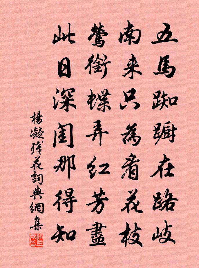 詩詞名句歷史字典書法欣賞書法字典國語詞典說文解字康熙字典古漢語字典標 題 作 者 詩 句 殘花作者:楊凝 朝代:唐代殘花原文五馬踟躕在路岐,南來只為看花枝。鶯銜蝶弄紅芳盡,此日深閨那得知。詩詞問答問:殘花的作者是誰?答:楊凝問:殘花寫於哪個朝代?答:唐代問:殘花是什麼體裁?答:七絕楊凝殘花書法欣賞殘花書法作品注釋全唐詩:卷290_28詩詞推薦紅樓夢十二曲——樂中悲曹雪芹〔清代〕襁褓中,父母嘆雙亡。縱居那綺羅叢中誰知嬌養?幸生來英豪闊大寬宏量,從未將兒女私情,略縈心上。好一似霽寧宗朝享三十五首真宗〔宋代〕玉瓚黃流,有飶其香。來假來享,降福穰穰。我應受之,湯孫之將。有百斯男,福祿無疆。均慶寺季鹹〔宋代〕一方靈跡兩峰間,左右芒山與碭山。勝地昔曾鐘王氣,高僧誰此掩禪關。翬飛巍殿煙瓴碧,翠削層崖苔蘚斑。千古用馮深居韻題莆陽章氏環翠樓胡仲參〔宋代〕百尺危梯眇海寰,欄乾十二盡青山。煙光濃淡藏多景,野水周遭匝四環。勝地只宜騷客在,老天未放主人閒。憑誰和張簿寧國山門六題山門梅堯臣〔宋代〕青山中穴為大門,下通軌轍高莫論。飛雲出納不計限,雙峙平削無刀痕。入門復見田園美,田外峰巒回抱尊。棲靈枕上和圓機絕句梅花十有四首晁說之〔宋代〕孤芳寒艷絕難依,鄴下關中不賦詩。未必江南有才子,也應先是七三辭。句蔡任〔宋代〕我與斯民同一性,誰言此邑號三陽。寄驥禪人釋慧遠〔宋代〕姑蘇台畔惡相從,海涌峰前事亦同。故國夢回春已走,水雲相望一帆風。四犯令侯置〔宋代〕月破輕雲淡注。夜悄花無語。莫聽陽關牽離緒。拚酩酊、花深處。明日江郊芳草路。春逐行人去。不似酴醿開獨步過胡駱坑二首楊萬里〔宋代〕說盡山寒未識寒,此間寒不是人間。岩崖泉凍琉璃澗,冰雪雲封翡翠山。一檐衣裳都著盡,兩邊窗子更深關。聳肩曲肱詩二十首白玉蟾〔宋代〕我不生嗔怨玉皇,翠娥無復舞霓裳。如何天上神仙女,染污清都一散郎。題尤延之右司遂初堂二首楊萬里〔宋代〕詩瘦山如瘦,人遐室更遐。荒林庾信宅,古木謝敷家。醫國君臣藥,逃名子母瓜。只愁歸未得,綠卻白鷗沙。贈程舍人近侍入閩楊時〔宋代〕路公溪上鶴髮翁,眼光照日顏如意。厖眉垂鬢有仙骨,駢集五福天所鍾。螭頭暫輟三長手,杖節扶輿入閩嶠。弧南塞翁吟(黃園感事)趙文〔宋代〕又海棠開後,樓上倍覺春寒。綠葉潤,雨初乾。愛遠樹團團。當時剩買名花種,那信付與誰看。十載事,土花漫。復作耳鳴范成大〔宋代〕至音豈寂透希夷,珍重幽田為發揮。妙用何關新卷葉,圓通自有倒聞機。夢中鼓響生千偈,覺後舂聲失百非。寄語望南雲慢(木芙蓉)沈唐〔宋代〕木葉輕飛,乍雨歇亭皋,簾卷秋光。欄隈砌角,綻拒霜幾處,蓓深淺紅芳。應恨開時晚,伴翠菊、風前並香。曉來送陸澧還吳中(一作李嘉祐詩)劉長卿〔唐代〕瓜步寒潮送客,楊柳暮雨沾衣。故山南望何處,秋草連天獨歸。七歌效杜陵體丘葵〔宋代〕十家九室廚無煙,兒夫仆後妻僵前。米珠薪桂內如玉,野無青草飛烏鳶。手持空券向何許,官司有印儂無錢。嗚呼答蓮花妓陳陶〔唐代〕近來詩思清於水,老去風情薄似雲。已向升天得門戶,錦衾深愧卓文君。偈頌一百零二首釋紹曇〔宋代〕不紹金輪尊貴位,被人打落當門齒。難嚲梁王掘地埋,脫身留得得空棺履。死款供成,臨文不諱。乳竇今朝報不平名句推薦落盡梨花春又了。滿地殘陽,翠色和煙老。梅堯臣《蘇幕遮·草》 佇立傷神。無奈輕寒著摸人。朱淑真《減字木蘭花·春怨》 有約不來過夜半,閒敲棋子落燈花。趙師秀《約客》 鴻雁來時,無限思量。晏殊《訴衷情·芙蓉金菊斗馨香》 故國三千里,深宮二十年。張祜《宮詞·故國三千里》 未知鹿死誰手房玄齡《晉書·載記·第五章》 檐流未滴梅花凍,一種清孤不等閒。鄭燮《山中雪後》 空門寂寞汝思家,禮別雲房下九華。金地藏《送童子下山》 博厚,所以載物也。高明,所以覆物也。悠久,所以成物也。子思《中庸·第二十六章》 轅門菊酒生豪興,雁塞風雲愜壯遊。王瓊《九日登花馬池城》