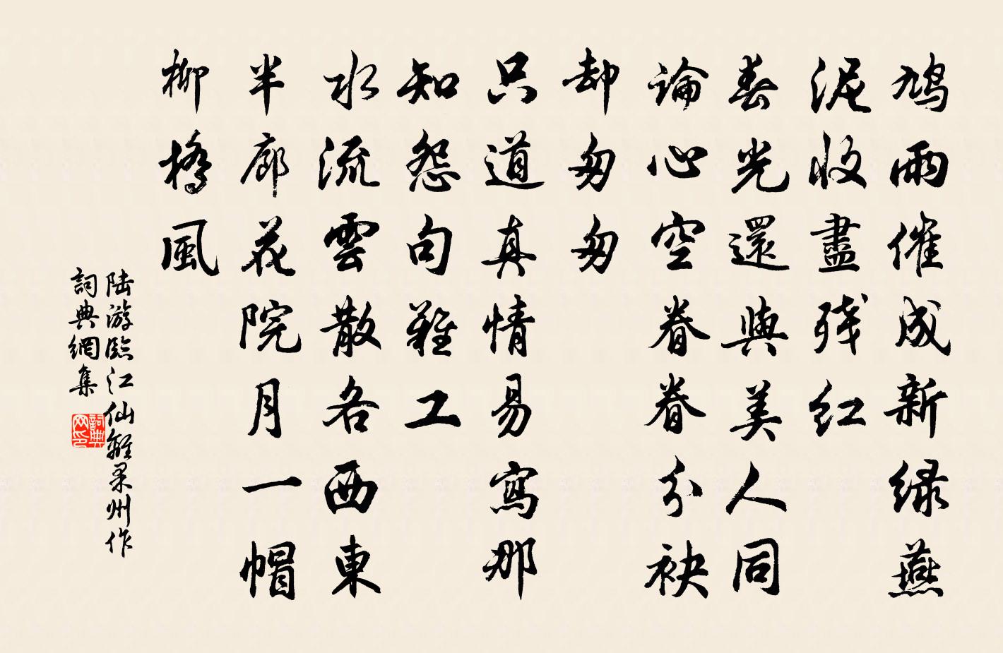 陸游到果州 ,已是“ 池館鶯花春漸老”(《果州驛 》)的時刻。陸游在其間已寫了兩首詩,最後句寫到:花殘呼馬去,聊將俠氣壓春風。”樊亭為園館名,亦在果州。故這首詞的開頭二句亦云 :“鳩雨催成新綠,燕泥收盡殘紅。”雖正值二月 ,但已有晚春的景色 。“鳩雨”詞有其淵源陸游《秋陰》詩 :“雨來鳩有語”;又三國吳時陸璣《毛詩草木鳥獸蟲魚疏》卷下載鳩鳥 :“陰則屏逐其匹,晴則呼之。語曰‘天將雨,鳩逐婦’是也。陸游祖父陸佃所作的《埤雅》亦引之。鳩雨一詞,即指此。鳩鳥呼喚聲中的雨水,把芳草、樹林,催成一片新綠;燕子在雨後,把滿地落英的殘紅花瓣和泥都銜盡了。綠肥紅褪,正是作者離果州時所見的實景;這兩句組成對偶,意象結集豐富,顏色對照鮮明,基調自然,對仗工整,是上片詞形象濃縮的焦點,與王維《田園樂》詩的“桃紅復含宿雨,柳綠更帶春煙”,著色用對 ,有異曲同工之妙。接下來的三句 ,都從這二句生髮。“春光還與美人同:論心空眷眷,分袂卻匆匆”把春光說成與美人一樣,在相聚的時候,彼此間無限眷戀,但說到分手就這樣依依不捨地分手了。這個比喻極為精當,深摯地體現出作者戀春又惜春的真摯感情。“空眷眷”的“空”,是惜別時追嘆之語,正是在“分袂卻匆匆”的時刻感覺前些時的“眷眷”已如夢幻成空。這裡說春光,說美人 ,言外之意,還可能包括果州時相與宴遊的朋友,以美人喻君子在詩詞中是很常見的。這三句由寫景轉為抒情,化濃密為清疏;疏而不薄,因有開頭二句為基礎,從而能夠取得濃淡相濟的效果。有濃麗句,但很少一味濃麗到底;是抒情,但情中又往往帶著議論:這正是陸游詞的特點。上片即可看出陸詞的這種特點。