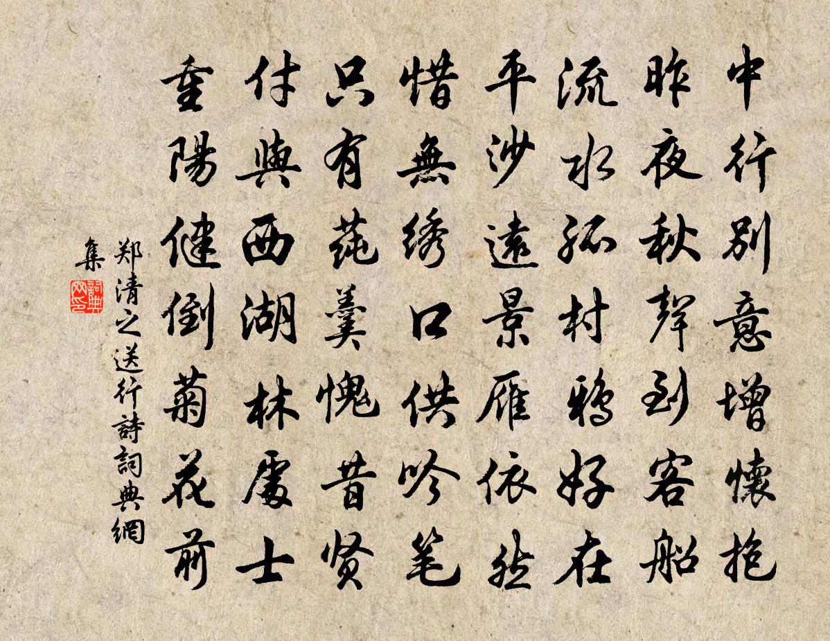 詩詞名句歷史字典書法欣賞書法字典國語詞典說文解字康熙字典古漢語字典標 題 作 者 詩 句 送行詩作者:鄭清之 朝代:宋代送行詩原文中行別意增懷抱,昨夜秋聲到客船。流水孤村鴉好在,平沙遠景雁依然。惜無繡口供吟筆,只有蓴羹愧昔賢。付與西湖林處士,重陽健倒菊花前。詩詞問答問:送行詩的作者是誰?答:鄭清之問:送行詩寫於哪個朝代?答:宋代鄭清之送行詩書法欣賞送行詩書法作品詩詞推薦句莫蒙〔宋代〕諸天互魔擾,救護世尊忙。贈張繪秘教九題詩牌林逋〔宋代〕矗方標勝概,讀處即忘歸。靜壁懸虛白,危樓釘翠微。清銜時亦有,絕唱世還稀。一片題誰作,吾廬水石圍。點絳唇元好問〔金代〕十六芳年,錦兒嬌小瓊兒秀。海棠紅皺。恰到愁時候。天上歌聲,未省人間有。休回首。渭城煙柳。腸斷離亭酒。偈頌七十六首釋子益〔宋代〕法身充塞太虛空,出沒何曾有定蹤。獨許波旬知此意,半 * 喜半搥胸。登快哉亭陳師道〔宋代〕城與清江曲,泉流亂石間。夕陽初隱地,暮靄已依山。度鳥欲何向,奔雲亦自閒。登臨興不盡,稚子故須還。春日耕者蘇轍〔宋代〕陽氣先從土脈知,老農夜起飼牛飢。雨深一尺春耕利,日出三竿曉餉遲。婦子同來相嫵媚,鳥鳶飛下巧追隨。紛紜鄴都引張說〔唐代〕君不見魏武草創爭天祿,群雄睚眥相馳逐。晝攜壯士破堅陣,夜接詞人賦華屋。都呈繚繞西山陽,桑榆汗漫漳河曲微雨陸游〔宋代〕晡後氣殊濁,黃昏月尚明。忽吹微雨過,便覺小寒生。樹杪雀初定,草根蟲已鳴。呼童取半臂,吾欲傍階行。聽烏檻角有感送衍上人歸鄉釋紹曇〔宋代〕黃牛背上烏檻角,聲聲吹作村田樂。低入重淵高入雲,擬別宮商都是錯。斷煙明滅枯崗西,這嗚咿喚那嗚咿。天地祀事張蘊〔宋代〕誤被雞催起,隃聽漏鼓稀。書檠風展卷,香碗火生衣。困嗅茶猶病,吟餐菊可肥。月明天路靚,親到帝旁歸。見放翁退蘇泂〔宋代〕住所真容膝,談間便解熙。胡能萬事足,直作一生痴。密雨驚荷葉,微風吹竹枝。回舟吾自慊,應賦此翁詩。以人參遺段成式周繇〔唐代〕人形上品傳方誌,我得真英自紫團。慚非叔子空持藥,更請伯言審細看。永遇樂(初夏獨坐西山釣台新亭)李彌遜〔宋代〕曲徑通幽,小亭依翠,春事才過。看筍成竿,等花著果,永晝供閒坐。蒼蒼晚色,臨淵小立,引首暮鷗飛墮。悄無萱草陳師道〔宋代〕喚作忘憂草,相看萬事休。若教花有語,郤解使人愁。楊柳枝盧肇〔唐代〕青鳥泉邊草木春,黃雲塞上是征人。歸來若得長條贈,不憚風霜與苦辛。廣陵道中許渾〔唐代〕城勢已坡陀,城邊東逝波。綠桑非苑樹,青草是宮莎。山暝牛羊少,水寒鳧雁多。因高一回首,還詠黍離歌。以勸分出伏龍因謁武侯廟李曾伯〔宋代〕廬存龍去跡成非,草木空山聖得知。成敗論人陳壽史,功名余恨少陵詩。初心何只三分漢,偉略徒夸十倍丕。半夜葵花董嗣杲〔宋代〕纏粉花心吐膩英,根柔葉縐簇娉娗。錦窠繡窟攢風日,絳節華旌列戶庭。五色種遺吳地秀,獨醒人耀楚江靈。年年清穆鄉農戶董嗣杲〔宋代〕山峭回峰緊,場空得雨忙。赤楓溪觜立,白草渡頭荒。寒市虛聲隘,秋疇喜氣揚。野舂連屋響,瑞入雪匙香。王叔武示忠州張使君德遠近詩次韻三首曾協〔宋代〕安心今得法,問道舊名庵。雅致追龐老,高風數泐潭。遠公容入社,彌勒本風龕。寄語邦人道,叢林始罷參。名句推薦君子立身,雖雲百行,唯誠與孝最為其首。魏徵《隋書·帝紀·卷二》 不忍登高臨遠,望故鄉渺邈,歸思難收。柳永《八聲甘州·對瀟瀟暮雨灑江天》 言無二貴,法不兩適。韓非及後人《韓非子·問辯》 閒雲潭影日悠悠,物換星移幾度秋。王勃《滕王閣序》 湖闊兼雲霧,樓孤屬晚晴。杜甫《陪裴使君登岳陽樓》 撩亂邊愁聽不盡,高高秋月照長城。王昌齡《從軍行七首》 鴻雁在雲魚在水。惆悵此情難寄。晏殊《清平樂·紅箋小字》 寂寞深閨,柔腸一寸愁千縷。李清照《點絳唇·閨思》 君若清路塵,妾若濁水泥;曹植《明月上高樓》 去歲江南見雪時,月底梅花發。張孝祥《卜運算元·雪月最相宜》
