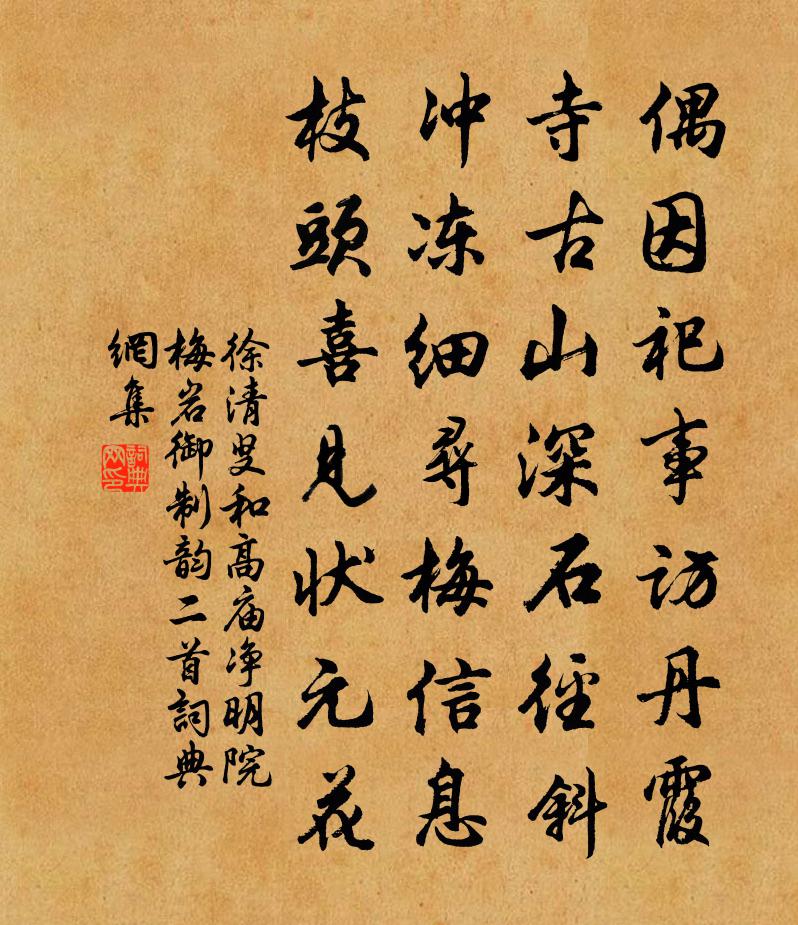 詩詞名句歷史字典書法欣賞書法字典國語詞典說文解字康熙字典古漢語字典標 題 作 者 詩 句 和高廟淨明院梅岩御製韻二首作者:徐清叟 朝代:宋代原文偶因祀事訪丹霞,寺古山深石徑斜。沖凍細尋梅信息,枝頭喜見狀元花。詩詞問答問:《和高廟淨明院梅岩御製韻二首》的作者是誰?答:徐清叟問:該詩寫於哪個朝代?答:宋代書法欣賞和高廟淨明院梅岩御製韻二首書法作品詩詞推薦和權載之離合詩(時為國子司業)武少儀〔唐代〕少年慕時彥,小悟文多變。木鐸比群英,八方流德聲。雷陳美交契,雨雪音塵繼。恩顧各飛翔,因詩睹瑰麗。傅野流杯亭宋庠〔宋代〕昔記神皇駐六龍,橫波簫鼓沸天中。誰知一代繁華意,吹作菰蒲落日風。途中閱曾運使所況文清集得四絕句寄之趙蕃〔宋代〕兩賢堂下千竿竹,蕭散風流政昔時。何妨乞我一灑掃,不用文移只付詩。依韻和子瞻游孤山文同〔宋代〕跨明越,壓蘇湖,錢塘風物天下無。玉峰孱顏石穿漏,雪海浩蕩潮喧呼。舊嘗持之詫吾孥,會挈爾去相與娛。宦遊梨花李新〔宋代〕太真欲泣君王羞,一枝帶雨春梢頭。年來樂府不栽種,淡月青煙無處求。和孫偉卿雜言十章陳傅良〔宋代〕好酒來誰家,明月得我心。把酒弄明月,醉臥盜不侵。秦望山林景熙〔宋代〕鐫石奇功席捲來,眼中滄海一瓊杯。神山只有靈鰲背,徐福樓船不見回。天竺送僧之昌邑釋智愚〔宋代〕肅然凝目引秋光,帆過東溟白鳥行。不好不離雖自肯,海山誰為說經王。山中醮後一日雪仍留山中霧雨溟濛混然如一氣程公許〔宋代〕香霧迴翔八景輿,帝觴邀我適華胥。戲將餘瀝作零雨,旋有六花飛太虛。意恐混淪凝祖氣,心疑圓嶠沒歸墟。題詩香寂圃曾幾〔宋代〕陂陀茶山西,草樹無空空。呼兒鋤其荒,花木亂栽種。葩華以時折,薌澤得風送。真成摩詰病,幻出天女供。遊人梅花翅二首賈似道〔宋代〕翅似梅花口似刀,番來覆去咬千交。總然贏得他每者,只好看盆無二遭。張冠卿以前詩懷哉各努力人物古來少句為十詩陳傅良〔宋代〕子歌我三嘆,我和子一笑。方期俗耳合,勿與知音道。頗聞古韶卷,不落人間調。悲歌泣鬼神,妙語無餘少。次韻瀹留避地有憶欲歸因用前韻示之陳著〔宋代〕離亂身命危,煩惱頭髮折。我兒在山南,百書饒苦舌。誰知我憶兒,如火煅心鐵。人生恩愛海,各自憐骨血。初謂念奴嬌姚述堯〔宋代〕山城秋早,聽畫角吟風,曉來聲咽。夢斷華胥人乍起,冷浸一天霜月。灝氣參橫,塵埃洗盡,玉管濡冰雪。興來吟玉壺昨起白玉蟾〔宋代〕白雲深處學陳摶,一枕清風天地寬。月色似催人起早,泉聲不放客眠安。甫能蝴蝶登天去,又被杜鵑驚夢殘。開眼紫宸殿退朝口號杜甫〔唐代〕戶外昭容紫袖垂,雙瞻御座引朝儀。香飄合殿春風轉,花覆千官淑景移。晝漏希聞高閣報,天顏有喜近臣知。宮中深上人見訪憶李端司空曙〔唐代〕雁稀秋色盡,落日對寒山。避事多稱疾,留僧獨閉關。心歸塵俗外,道勝有無間。仍憶東林友,相期久不還。姜山後岩洞陳曦〔宋代〕春山多少雨,染出碧雲堆。岩冷溜常滴,人閒洞自開。摘花香入袖,題石筆黏苔。茅屋在何處,桃花流水來。題和伯僑吳松雪霽圖三首羅椅〔宋代〕暖來日曬冰滑,恨極天寒竹修。雲開梵鐸相訴,水活漁船自流。移五瘟出市心釋印肅〔宋代〕助佛揚名化俗徒,遣邪歸正沃心枯,國風雅泰民歡樂,只這和瘟大丈夫。名句推薦日暮酒醒人已遠,滿天風雨下西樓。許渾《謝亭送別》 欲安時興化,不先富而教之,其道無由。房玄齡《晉書·列傳·第三章》 美女渭橋東,春還事蠶作。李白《陌上桑》 問汝平生功業,黃州惠州儋州。蘇軾《自題金山畫像》 西園何限相思樹,辛苦梅花候海棠。元好問《鷓鴣天·候館燈昏雨送涼》 奸巧語,穢污詞。市井氣,切戒之。李毓秀《弟子規·信》 柳梢聽得黃鸝語,此是春來第一聲。楊載《到京師》 青青子衿,悠悠我心。佚名《子衿》 靜女其孌,貽我彤管。佚名《靜女》 背若泰山,翼若垂天之雲。莊周《逍遙遊(節選)》