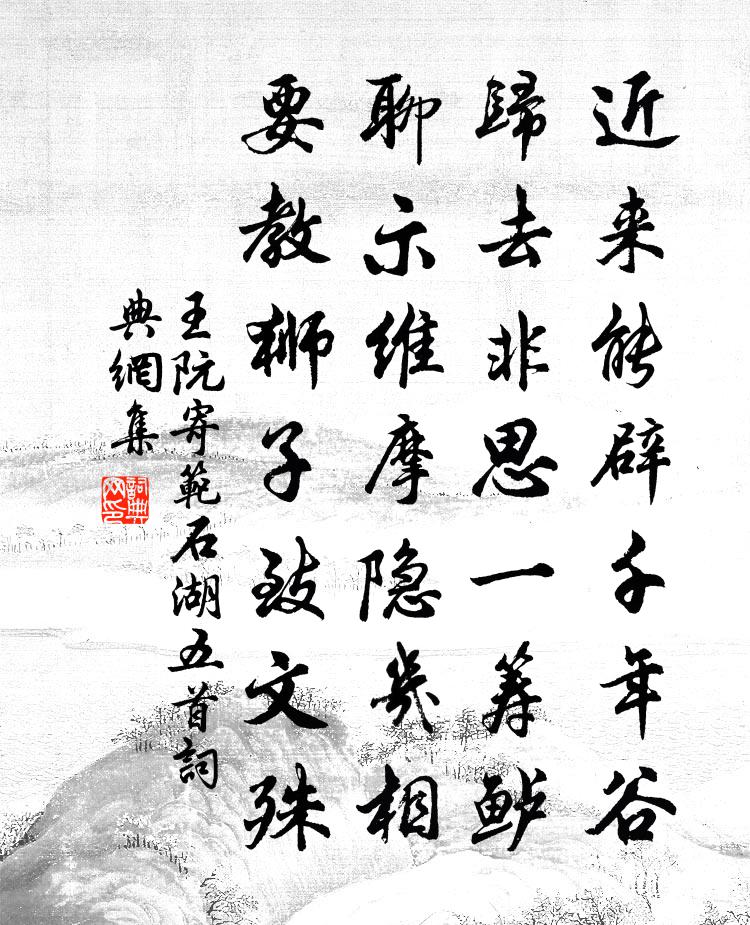 詩詞名句歷史字典書法欣賞書法字典國語詞典說文解字康熙字典古漢語字典標 題 作 者 詩 句 寄范石湖五首作者:王阮 朝代:宋代寄范石湖五首原文近來能辟千年谷,歸去非思一籌鱸。聊示維摩隱几相,要教獅子致文殊。詩詞問答問:寄范石湖五首的作者是誰?答:王阮問:寄范石湖五首寫於哪個朝代?答:宋代王阮寄范石湖五首書法欣賞寄范石湖五首書法作品詩詞推薦偈頌一百二十三首釋普度〔宋代〕當初已是錯投胎,鬼面神頭相賺來。裂破虛空無罅縫,龜毛拂子舞三台。曉望海山陸游〔宋代〕暮山青尚淺,曉山如黛染。開窗望海山,天清霧方歛。向來六月中,黑雲齊如截,蒼龍下曳尾,卷雨灑炎熱。造物吳正仲遺新茶梅堯臣〔宋代〕十片建溪春,乾雲碾作塵。天王初受貢,楚客已烹新。漏泄關山吏,悲哀草土臣。捧之何敢啜,聊跪北堂親。總領戶部楊公輓詩曹彥約〔宋代〕二昆同唱第,短世不堪言。生晚欣親炙,謙撝過撫存。里門重擁篲,秀野祗空園。零落西歸藁,誰能作九原。次韻全君玉元日二首方回〔宋代〕五更皆早起,惟我是閒人。展鏡須仍雪,添杯臉暫春。有終還復始,無舊不成新。萬古燒痕意,陳根豈盡陳。失調名龔大明〔宋代〕山居好。山居好。斫月鋤雲種瑤草。泠泠碧澗響寒泉,簌簌落花風自掃。劉村渡二首楊萬里〔宋代〕曠野風從腳底生,遠峰頂與額般平。何人知道誠齋叟?獨著駝裘破雨行。謁金門佚名〔宋代〕山銜日。灑酒西風獨立。一葉扁舟流水急。轉頭無處覓。去則而今已去,憶則如何不憶。明日到家應記得。寄書回江漲杜甫〔唐代〕江漲柴門外,兒童報急流。下床高數尺,倚杖沒中洲。細動迎風燕,輕搖逐浪鷗。漁人縈小楫,容易拔船頭。太常樂章三十首其十五南郊降神奏高安之曲楊億〔宋代〕爰卜吉土,在國之陽。肆類於帝,錫羨無疆。備物致享,嘉生阜昌。純嘏昭答,長發其祥。小重山 喻牛子王哲〔元代〕堪嘆犢兒不喚牛。性如湍水急,碧波流。只知甘乳做膏油。長隨母,擺尾囗搖頭。漸漸騁無休。賓士山谷路,入溪山僧雨中送牡丹王禹偁〔宋代〕數枝香帶雨霏霏,雨里攜來叩竹扉。擬戴卻休成悵望,御園曾插滿頭歸。依韻和孫都官河上寫望梅堯臣〔宋代〕河上風煙愛此邦,吳艘越舸不相降。魚腥矗矗橋邊市,花暗深深竹里窗。蹴踘漸知寒食近,鞦韆將立小鬟雙。年光劉行簡前日帖贊岳珂〔宋代〕情葉事之宜,筆力亦稱之。雖得於歙水之湄,然望而識其為苕溪也。和范倅十首曹勛〔宋代〕岩壑未銷連夜雪,松篁深映一川梅。忍寒故作遲遲去,只為清香特特來。和三司晏尚書漫成宋祁〔宋代〕日烈花休樹結陰,紅牙貪調萬黃金。伯松不學陳遵飲,為識鴟夷是酒箴。吳秘監每有美酒,獨酌獨醉,但蒙詩報,不以白居易〔唐代〕蓬山酒仙客下菸酒霄,對酒唯吟酒獨酌謠。酒不怕道狂揮玉爵,亦曾乘興解金貂。[記云:飲玉爵者弗揮。吳監前送知久禪者釋重顯〔宋代〕霜竹凝寒攜九節,銅瓶浪鎖千溪月。天上人間不自知,行行誰共分清絕。登沃州山耿湋〔唐代〕沃州初望海,攜手盡時髦。小暑開鵬翼,新蓂長鷺濤。月如芳草遠,身比夕陽高。羊祜傷風景,誰雲異我曹。隋堤柳曹勛〔宋代〕隋堤花柳,千里花夾隋堤。堤中有平道,百尺隱金鎚。柳色間花李,行客迷芳菲。牙檣從西來,雲表開龍旗。一舟名句推薦問訊湖邊春色,重來又是三年。張孝祥《西江月·問訊湖邊春色》 君子以言有物而行有恆。佚名《易傳·象傳下·家人》 移舟水濺差差綠,倚檻風擺柄柄香鄭谷《蓮葉》 寢興目存形,遺音猶在耳。潘安《悼亡詩三首》 橫笛驚征雁,嬌歌落塞雲。岑參《奉陪封大夫九日登高》 孤之有孔明,猶魚之有水也。陳壽《隆中對》 燕山雪花大如席,片片吹落軒轅台。李白《北風行》 天將暮,雪亂舞,半梅花半飄柳絮。馬致遠《壽陽曲·江天暮雪》 深林人不知,明月來相照。王維《竹里館》 逆其根則伐其本,壞其真矣。佚名《黃帝內經·四氣調神大論》