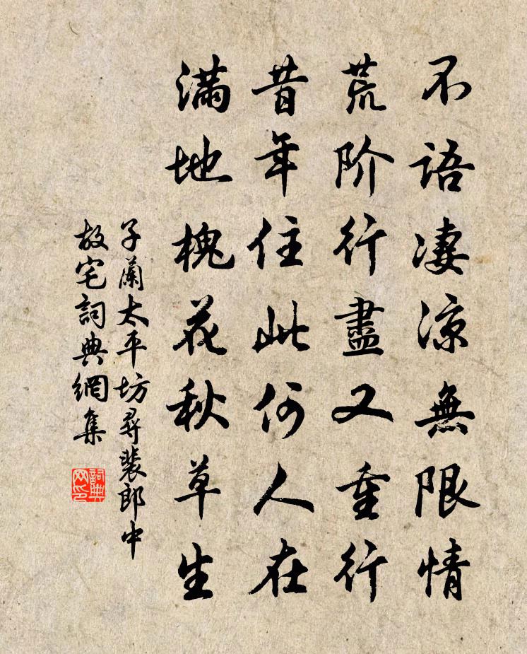 詩詞名句歷史字典書法欣賞書法字典國語詞典說文解字康熙字典古漢語字典標 題 作 者 詩 句 太平坊尋裴郎中故宅作者:子蘭 朝代:唐代太平坊尋裴郎中故宅原文不語淒涼無限情,荒階行盡又重行。昔年住此何人在,滿地槐花秋草生。詩詞問答問:太平坊尋裴郎中故宅的作者是誰?答:子蘭問:太平坊尋裴郎中故宅寫於哪個朝代?答:唐代問:太平坊尋裴郎中故宅是什麼體裁?答:七絕子蘭太平坊尋裴郎中故宅書法欣賞太平坊尋裴郎中故宅書法作品注釋全唐詩:卷824-14詩詞推薦碧瀾堂袁說友〔宋代〕照影瀾飛碧,臨深雨過涼。夜橫千櫂月,冷浸一溪堂。魚躍翻寒藻,鷗閒戲夕陽。百年數行客,幾度落危檣。頌石頭和尚草庵歌釋印肅〔宋代〕玉殿瓊樓未為對,引慈眾生增渴愛。放出溈山水牯牛,熒熒露地難遮蓋。戲作切語竹詩蘇軾〔宋代〕隱約安幽奧,蕭騷雪藪西。交加工結構,茂密渺冥迷。引葉油雲遠,攢叢聚族齊。奔鞭迸壁背,脫籜吐天梯。煙筱題臨川李子經文稿楊萬里〔宋代〕聖經賢傅緊關津,騷客詩家妙斧斤。摠被先生漏訊息,不令後輩隔知聞。都城一日紙增價,天下幾人貧似君。不要宿江西竇主簿廳(與此公亡兄聯官)崔峒〔唐代〕廣庭方緩步,星漢話中移。月滿關山道,烏啼霜樹枝。時艱難會合,年長重親知。前事成金石,悽然淚欲垂。閘柱袁說友〔宋代〕三丈圍寬兩木靈,千年閘骨狀如城。揚帆欲過心先動,擊柱才聞念已驚。東越梅梁猶逞異,南城老樹也為精。昔聞譏王黼宣和民謠〔宋代〕三百貫,且通判;五百索,直秘閣。夔州歌簡晁子西王從道〔宋代〕白帝夔州萬古城,全蜀東門下祖控。瞿唐灩澦勢嶄絕,赤甲白鹽光澒洞。峽雨關雲朝莫征,菸葉水花洲渚共。少陵水茶磨釋普濟〔宋代〕機輪轉處水潺潺,機若停時水自閒。末上一遭知落處,十分春色滿人間。呈富相風箏邵雍〔宋代〕秋風一擊入雲端,合國人皆仰面觀。好向丹霄休索線,等閒勢斷卻收難。和晏相公觸事成詠四首韓維〔宋代〕誅茅結園屋,日夕所游造。雀來啄其茨,蚓出穴其穾。中虛尚可托,外此非吾保。蘄州別友柴望〔宋代〕客中逢客上夷陵,輾轉淒涼睡不成。無酒送君之遠道,有誰吹角向江城。白髮亂生人漸老,青燈相對雨無情。詰朝感皇恩 張侯壽席此州樂府垂楊一曲方盛元好問〔金代〕天外想春來,春來天上。樂府垂楊動新唱。扁舟西子,並與雲帆無恙。五湖將底用,黃金像。水閣清深,晴樓蕭爽秋日村行梅堯臣〔宋代〕溪霧晝又收,山村夜初晦。飢禽來往飛,遠樹青紅碎。原上楚牛童,屋頭吳婦碓。雞肥酒已熟,野老邀同輩。江郎山白居易〔唐代〕林慮雙童長不食,江郎三子夢還家。安得此身生羽翼,與君來往共煙霞。 尹公湖晚歸李新〔宋代〕箇中適意即吾廬,可是秋來杖屨疏。碧樹野煙連廣莫,暮池斜照落函虛。天高雁迥字明滅,林杳笛寒聲有無。喜見檥舟郭印〔宋代〕裊裊垂楊岸,無人獨檥舟。風波嘗險阻,身世任沉浮。邃徑中間接,寒溪左右流。冥心來宴坐,浩蕩得天游。酹江月/念奴嬌王易簡〔宋代〕暗簾吹雨,怪西風梧井,淒涼何早。一寸柔情千萬縷,臨鏡霜痕驚老。雁影關山,蛩聲院宇,做就新懷抱。湘皋遺疊翠亭王安石〔宋代〕煙籠遠浦迷芳草,日照澄湖浸碧峰。幸有清樽堪酩酊,忍陪良友不從容。河傳韋莊〔唐代〕何處,煙雨,隋堤春暮。柳色蔥蘢,畫橈金縷,翠旗高颭香風,水光融。青娥殿腳春妝媚,輕雲里,綽約司花妓。名句推薦刑稱罪,則治;不稱罪,則亂。荀子《荀子·正論》 里仁為美,擇不處仁,焉得知?孔子弟子《論語·里仁篇》 誰向若耶溪上,倩美人西去,麋鹿姑蘇。辛棄疾《漢宮春·會稽蓬萊閣懷古》 天寒水鳥自相依,十百為群戲落暉。秦觀《還自廣陵》 愁與西風應有約,年年同赴清秋。史達祖《臨江仙·閨思》 傷情處,高城望斷,燈火已黃昏。秦觀《滿庭芳·山抹微雲》 秋菊堪餐,春蘭可佩,留待先生手自栽。辛棄疾《沁園春·帶湖新居將成》 秋陰不散霜飛晚,留得枯荷聽雨聲。李商隱《宿駱氏亭寄懷崔雍崔袞》 門外垂楊岸側,畫橋誰系蘭舟。万俟詠《木蘭花慢·恨鶯花漸老》 蓬生麻中,不扶而直;白沙在涅,與之俱黑。荀子《荀子·勸學》