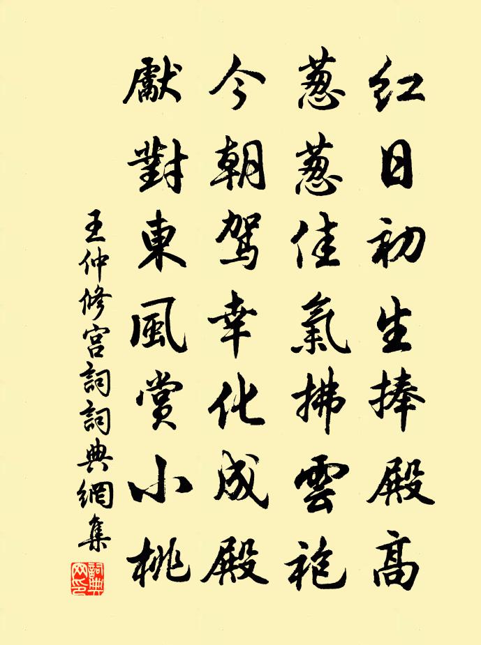 詩詞名句歷史字典書法欣賞書法字典國語詞典說文解字康熙字典古漢語字典標 題 作 者 詩 句 宮詞作者:王仲修 朝代:宋代宮詞原文紅日初生捧殿高,蔥蔥佳氣拂雲袍。今朝駕幸化成殿,先對東風賞小桃。詩詞問答問:宮詞的作者是誰?答:王仲修問:宮詞寫於哪個朝代?答:宋代王仲修宮詞書法欣賞宮詞書法作品詩詞推薦次韻張濟川二首李若水〔宋代〕父老霑襟訟不平,千岩鬼哭亂泉聲。烏鳶誤飽忠義肉,點檢戰功誰眼明。初至崖口宋之問〔唐代〕崖口眾山斷,嶔崟聳天壁。氣沖落日紅,影入春潭碧。錦繢織苔蘚,丹青畫松石。水禽泛容與,岩花飛的礫。微路角招 次黃伯陽苕溪夭中韻邵亨貞〔元代〕暮雲起。苕溪上,畫橈蕩漾春水。道人煙浪里。信筆賦詩,千古無此。吳頭楚尾。問舊日、陶朱鄰里。擷得江蘺寄和次山贈別胡寅〔宋代〕牧養改聞政失中,茇棠深愧召南風。卻歸舊隱三家市,回望耆儒一畝宮。惠帳我今尋怨鶴,苹洲君復送驚鴻。別懷偈頌一百一十七首釋紹曇〔宋代〕簸弄乾坤,靈蛇在掌。露刃含霜,阿誰近傍。殲厥渠魁未得時,蟄龍護匣牢收抗。還他道地,劍州與太阿無兩樣。和穎仲山行即事李彌遜〔宋代〕平蕪新綠占封圻,橫路遊絲網落暉。同徑人 * 窈窕,禪扉春盡老芳菲。緩行照水知魚樂,隨意穿花見蝶飛。二了犬鳶白居易〔唐代〕晚來天氣好,散步中門前。門前何所有,偶睹犬與鳶。鳶飽凌風飛,犬暖向日眠。腹舒穩貼地,翅凝高摩天。上無偶成黃大受〔宋代〕蕨薇生山巔,長不逾蓬蒿。松柏生澗底,歲久還乾霄。稟質自不同,託身奚必高。初移琪樹羊士諤〔唐代〕愛此丘中物,煙霜盡日看。無窮碧雲意,更助綠窗寒。與似表弟游石門懷蹈元時中用高字韻李彌遜〔宋代〕逼人塵事等牛毛,袖手端須著眼高。策蹇倦追千里馬,荷鋤安用百金刀。病來避酒連三月,春半尋山第一遭。不見水龍吟(己亥壽史督相)李曾伯〔宋代〕明堂一柱擎天,眼看黃閣空諸老。平生方寸、班班四字,誠心公道。玉帳雲旗,金城露布,尚勤征討。向淮頭蜀口雙雁兒楊無咎〔宋代〕休驚明日歲華新。且喜得,又逢春。北堂歌舞奉慈親。願遐齡,等大椿。□□□□□□□。□□□,□□□。□□秋興陸游〔宋代〕蓬蒿門巷絕經過,清夜何人與晤歌?蟋蟀獨知秋令早,芭蕉正得雨聲多。傳家產業遺書富,玩世神通醉臉酡。如許辭楊侍郎杜荀鶴〔唐代〕春在門闌秋未離,不因人薦只因詩。半年賓館成前事,一日侯門失舊知。霜島樹凋猿叫夜,湖田谷熟雁來時。西風賀新郎魏了翁〔宋代〕霞下天垂宇。倚闌乾、月華都在,大明生處。扶木元高三千丈,不分閒雲無數。謾轉卻、人間朝暮。萬古興亡心一李得善賦絕句疑為鹿按廣韻注鹿雲麞屬注麞雲周必大〔宋代〕麞頭安得比麋茸,紋點胎斑更異同。爾雅昔嘗窺郭璞,方言今試問楊雄。樂府鳥衣怨元好問〔金代〕繡佛長齋,半生枉伴 * 過。酒壚橫臥。一蹴虛空破。頗笑張顛,自謂無人和。還知么。醉鄉天大。少個神仙我。偈公六十五首釋鹹傑〔宋代〕少室單傳,衲僧巴鼻。碓觜生花,驢鳴狗吠。廁坑籌子念摩訶,驚起法身無處避。無處避,若為論,我行荒草里,病中上錢尚父羅隱〔唐代〕左腳方行右臂攣,每慚名跡污賓筵。縱饒吳土容衰病,爭奈燕台費料錢。藜杖已乾難更把,竹輿雖在不堪懸。深恩山居二首陳與義〔宋代〕宅圖不必煩丘令,已卜坡東澗水邊。更與我為燒藥灶,只愁君要買山錢。名句推薦終日昏昏醉夢間,忽聞春盡強登山。李涉《題鶴林寺僧舍》 聞道黃龍戍,頻年不解兵。沈佺期《雜詩三首·其三》 重岡已隔紅塵斷,村落更年豐。元好問《人月圓·重岡已隔紅塵斷》 夫志,氣之帥也;氣,體之充也。孟子《孟子·公孫丑章句上·第二節》 隔戶楊柳弱裊裊,恰似十五女兒腰。杜甫《絕句漫興九首·其一》 摘青梅薦酒,甚殘寒,猶怯薴蘿衣。湯恢《八聲甘州·摘青梅薦酒》 孝有三:大孝尊親,其次弗辱,其下能養。戴聖《禮記·祭義》 此時相望不相聞,願逐月華流照君。張若虛《春江花月夜》 君不見,高堂明鏡悲白髮,朝如青絲暮成雪。李白《將進酒》 山高必有怪,嶺峻卻生精。吳承恩《西遊記·第二十七回》