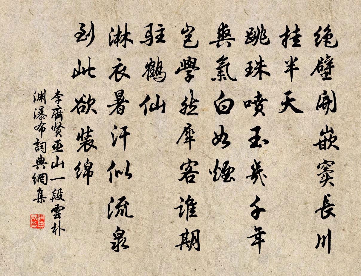 詩詞名句歷史字典書法欣賞書法字典國語詞典說文解字康熙字典古漢語字典標 題 作 者 詩 句 巫山一段雲 朴淵瀑布作者:李齊賢 朝代:元代巫山一段雲 朴淵瀑布原文絕壁開嵌竇,長川掛半天。跳珠噴玉幾千年。爽氣白如煙。豈學然犀客,誰期駐鶴仙。淋衣暑汗似流泉。到此欲裝綿。詩詞問答問:巫山一段雲 朴淵瀑布的作者是誰?答:李齊賢問:巫山一段雲 朴淵瀑布寫於哪個朝代?答:元代問:巫山一段雲 朴淵瀑布是什麼體裁?答:詞李齊賢巫山一段雲 朴淵瀑布書法欣賞巫山一段雲 朴淵瀑布書法作品詩詞推薦卜運算元佚名〔宋代〕借問隴頭梅,春信還知否。龍隱岩李師中〔宋代〕軒冕儻來仍假借,功名難立更因循。非才不系蒼生望,收取林泉自在身。雨花台周弼〔宋代〕細蘚柔莎瑣舊堆,昔年曾見異僧回。如何天上飛靈雨,不為人間洗劫灰。江接潮頭諸脈應,地連崗勢一支來。只今曝背釋文珦〔宋代〕老知身是患,萬事不關心。曝背茅檐下,孤猨時一吟。白雲同去住,青壁共幽深。小嶺尤堪隱,難尋支道林。仙跡岩題詩二十三首璇璣殿佚名〔宋代〕眾聖環拱位中天,統濟乾坤妙轉旋。高覆崑崙朝帝闕,注生回死福增延。圓覺會釋慧開〔宋代〕十二呆郎欲決疑,瞿曇嚼飯餵嬰兒。若教知有衲僧事,終不人前鼓口皮。壽凝院呈山主志師葛密〔宋代〕一徑直岩隈,亭軒四面開。濤頭轉山急,雨腳滿江來。怪石生雲氣,修篁待風材。他年白蓮社,應許繼宗雷。鬼谷子引古語先秦無名〔先秦〕女愛不蔽席。男歡不盡輪。丁未歲歸王官谷司空圖〔唐代〕家山牢落戰塵西,匹馬偷歸路已迷。冢上卷旗人簇立,花邊移寨鳥驚啼。本來薄俗輕文字,卻致中原動鼓鼙。將取醉歌汪元量〔宋代〕亂點連聲殺六更,熒熒庭燎待天明。侍臣已寫歸降表,臣妾僉名謝道清。次韻杜安行嘉陵春日書事十首郭印〔宋代〕聖處沉潛久,心華始發明。絕知人事繆,頓覺世緣輕。俗薄天難定,時危道不行。折腰甘五斗,無意問弓旌。溪上謠林希逸〔宋代〕溪上行吟山里應,山邊閒步溪間影。每應人語識山聲,卻向溪光見人性。溪流自漱溪不喧,山鳥相呼山愈靜。野雞壽先生丁正持〔宋代〕明善堂前香矗雲,諸生再拜祝莊椿。芹香藻綠涵和氣,楓老梅疏健小春。有道可為明主佐,無氈休歡廣文貧。烹羔出石門駱賓王〔唐代〕層岩遠接天,絕嶺上棲煙。松低輕蓋偃,藤細弱絲懸。石明如掛鏡,苔分似列錢。暫策為龍杖,何處得神仙。次韻仲平病間齋祠葛立方〔宋代〕病間百念屏,寒窗無與皆。吾公那窟室,學士且高齋。今日明粢徹,詰朝閶闔排。猶尋淡生洗,泚筆當俳諧。經由天台劉阮洞以雨作不及游顧士龍〔宋代〕松形夭矯學悄鸞。怪石蒼岩蘚暈團。地僻不容人跡到,雲深更覺客衣單。春歸不見桃乾樹,月冷空餘水一灘。欲問送衢州孔明達官郡學得代送行次韻陳著〔宋代〕三載分氈正學規,初心元不為窮飢。官身恰似僧游錫,歸面無慚婦織機。霄漢故交為有後,山林遺老辱相知。前程句狄煥〔唐代〕數點當秋霽,不知何處峰。更無聲接續,空有影相隨。少年行四首令狐楚〔唐代〕少小邊州慣放狂,驏騎蕃馬射黃羊。如今年老無筋力,猶倚營門數雁行。家本清河住五城,須憑弓箭得功名。等閒水調歌頭·壽趙漕介庵辛棄疾〔宋代〕千里渥窪種,名動帝王家。金鑾當日奏草,落筆萬龍蛇。帶得無邊春下,等待江山都老,教看鬢方鴉。莫管錢流地名句推薦漁舟逐水愛山春,兩岸桃花夾古津。王維《桃源行》 夫妻者,非有骨肉之恩也。愛則親,不愛則疏。韓非及後人《韓非子·備內》 病骨支離紗帽寬,孤臣萬里客江乾。陸游《病起書懷》 何處可為別,長安青綺門。李白《送裴十八圖南歸嵩山二首》 綠萼添妝融寶炬,縞仙扶醉跨殘虹曹雪芹《詠紅梅花得“紅”字》 悠悠卷旆旌,飲馬出長城。李世民《飲馬長城窟行》 白髮漁樵江渚上,慣看秋月春風。楊慎《臨江仙·滾滾長江東逝水》 盡人事以聽天命。李汝珍《鏡花緣·第六回》 青山相待,白雲相愛,夢不到紫羅袍共黃金帶宋方壺《山坡羊·道情》 親所好,力為具。親所惡,謹為去。李毓秀《弟子規·入則孝》