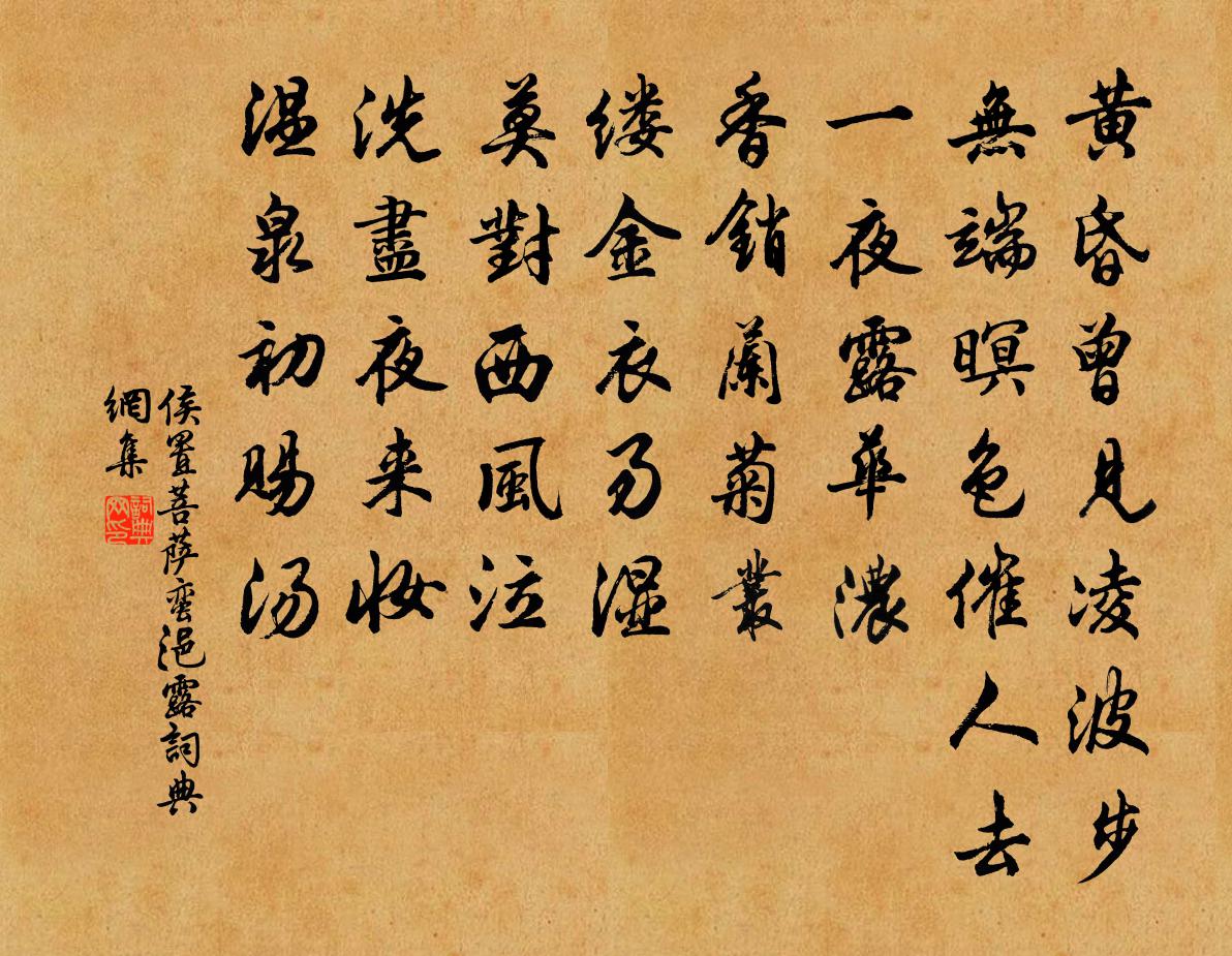 詩詞名句歷史字典書法欣賞書法字典國語詞典說文解字康熙字典古漢語字典標 題 作 者 詩 句 菩薩蠻(浥露)作者:侯置 朝代:宋代菩薩蠻(浥露)原文黃昏曾見凌波步。無端暝色催人去。一夜露華濃。香銷蘭菊叢。縷金衣易濕。莫對西風泣。洗盡夜來妝。溫泉初賜湯。詩詞問答問:菩薩蠻(浥露)的作者是誰?答:侯置問:菩薩蠻(浥露)寫於哪個朝代?答:宋代問:菩薩蠻(浥露)是什麼體裁?答:詞侯置菩薩蠻(浥露)書法欣賞菩薩蠻(浥露)書法作品詩詞推薦鄭侍郎送蠟梅次韻三首曾幾〔宋代〕折來梅與句爭清,強和餘音本不能。欲向都官論一字,略無佳處似詩僧。暮上瞿唐峽項斯〔唐代〕自古艱難地,孤舟旦暮程。獨愁空託命,省已是輕生。有樹皆相倚,無岩不倒傾。蛟螭波數怒,鬼怪火潛明。履道【中呂】滿庭芳_春暮韶光幾張可久〔元代〕春暮韶光幾分,紅飄恨雨,綠染愁雲。粉痕吹上何郎鬢,買不住東村。梨花下香風玉樽,松株外落日金盆。消磨盡剔銀燈杜安世〔宋代〕好事爭如不遇。可惜許、多情相誤。月下風前,偷期竊會,共把衷腸分付。尤雲殢雨。正繾綣、朝朝暮暮。無奈別次韻酬龔深甫二首王安石〔宋代〕恩容楚老護松楸,復得一龔從我游。講肄劇談兼祖謝,舞雩高蹈異求由。北尋五作故未憖,東挽三楊仍有樛。陟巘何桂林文同〔宋代〕十萬餘工造羽儀,夾堤浮浪去參差。堂堂送入江都去,渾忘當年攬頸時。遣興陳棣〔宋代〕早願風雲會,那知歲月侵。未應忘故步,已覺負初心。蕙帳聊跧伏,天閽隔遽深。且憑詩遣興,往事任瓶沉。野外王令〔宋代〕綠野愛平寬,偶來或永嘆。村兒駭車馬,野犬吠衣冠。亂草無閒地,斜陽有去鞍。良田半蹊徑,始信直行難。富池江上蕩舟游望二首董嗣杲〔宋代〕江風吹得烏帽偏,江水驚秋狂拍船。此身客遠積鄉夢,何日丹靈朝洞仙。將軍廟無老鴉異,羅漢院有古柏堅。盪槳念奴嬌(和王聖俞)侯置〔宋代〕滄浪萬頃,厭塵纓、手掬清流頻洗。落日孤雲煙渚淨,鷗沒澄波心裡。一舸橫秋,兩橈開浪,霜竹醒煩耳。蕭蕭風田家 其三華岳〔宋代〕老農鋤水子收禾,老婦攀機女擲梭。苗絹已成空對喜,納官還主外無多。金陵懷古四首王安石〔宋代〕地勢東回萬里江,雲間天闕古來雙。兵纏四海英雄得,聖出中原次第降。山水寂寥埋王氣,風煙蕭颯滿僧窗。廢陵訪僧歸雲庵陶崇〔宋代〕閒過選佛場,歸雲翠如潑。入門偶有言,啟頰師便喝。掩耳煨芋爐,但把火深撥。呼童酌玉虹,注之旃檀缽。噓灰曲江值歐陽伯起舟行至封川二首曾豐〔宋代〕華發吾衰矣,妙齡君浩然。追隨多計日,笑語兩忘年。功業無它遜,文章收自專。浯溪崖石上,準擬效拳拳。答客問杭州白居易〔唐代〕為我踟躕停酒盞,與君約略說杭州。山名天竺堆青黛,湖號錢唐瀉綠油。大屋檐多裝雁齒,小航船亦畫龍頭。所嗟八關僧房遇雨陳與義〔宋代〕脫履坐明窗,偶至晴更適。池上風忽來,斜雨滿高壁。深松含歲暮,幽鳥立晝寂。世故方未闌,焚香破今夕。夜坐讀書聞瓶梅之香口占五絕趙蕃〔宋代〕一從叢桂落秋風,佳處長孤阿堵中。及至梅花又冰雪,一枝雖少與多同。簡僧求奏望山拄杖陸游〔宋代〕老病龍鍾不自持,飽知藤杖可扶衰。明朝欲入天台去,試就高人乞一枝。訪楊雲卿淮上別墅釋惠崇〔宋代〕地近得頻到,相攜向野亭。河分岡勢斷,春入燒痕青。望久人收釣,吟餘鶴振翎。不愁歸路晚,明月上前汀。夙興出謁陸游〔宋代〕嗜酒狂無敵,居家嬾有餘。苦寒愁手版,美睡付肩輿。覓句吟喔慣,逢人省識疏。亦知歸去好,無地著蝸廬。名句推薦修己而不責人,則免於難。左丘明《左傳·閔公·閔公二年》 別離在今晨,見爾當何秋。韋應物《送楊氏女》 歡言得所憩,美酒聊共揮。李白《下終南山過斛斯山人宿置酒》 長江春水綠堪染,蓮葉出水大如錢。張籍《春別曲》 遙知湖上一樽酒,能憶天涯萬里人。歐陽修《春日西湖寄謝法曹歌》 千金縱買相如賦,脈脈此情誰訴。辛棄疾《摸魚兒·更能消幾番風雨》 莫辭秉燭通霄坐,明日相思隔隴煙。王守仁《諸門人送至龍里道中二首》 道同方獲其利,道異惟受其害。來俊臣《羅織經·察奸卷第八》 馬驕泥軟錦連乾,香袖半籠鞭。薛昭蘊《喜遷鶯·清明節》 其人雖已沒,千載有餘情。陶淵明《詠荊軻》