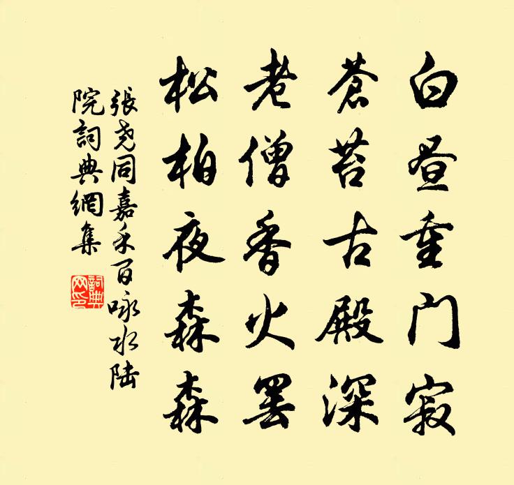 詩詞名句歷史字典書法欣賞書法字典國語詞典說文解字康熙字典古漢語字典標 題 作 者 詩 句 嘉禾百詠水陸院作者:張堯同 朝代:宋代嘉禾百詠水陸院原文白晝重門寂,蒼苔古殿深。老僧香火罷,松柏夜森森。詩詞問答問:嘉禾百詠水陸院的作者是誰?答:張堯同問:嘉禾百詠水陸院寫於哪個朝代?答:宋代張堯同嘉禾百詠水陸院書法欣賞嘉禾百詠水陸院書法作品詩詞推薦雙溪亭彭德遠〔宋代〕雨過畫橋跨蝃蝀,月明玉塔臥晴瀾。景全堪作吾鄉冠,還有沈碑客未看。句張表臣〔宋代〕雲移鳥滅沒,風霽蝶飛翻。句張鎡〔宋代〕已信此心安此命。春日釋文珦〔宋代〕春泉青似澱,春嶂碧於螺。遠近隨吾意,芒鞋幽興多。人生行樂爾,富貴復如何。難與時人道,風前獨放歌。長安道江總〔隋代〕翠蓋承輕霧。金覊照落暉。五侯新拜罷。七貴早朝歸。轟轟紫陌上。藹藹紅塵飛。日暮延平客。風花拂舞衣。和晏尚書夏日偶至郊亭歐陽修〔宋代〕關關啼鳥樹交陰,雨過西城野色侵。避暑誰能陪劇飲,清歌自可滌煩襟。稻花欲秀蟬初嘒,菱蔓初長水正深。知有次韻和答斯遠入城見迎詩趙蕃〔宋代〕往辱攜詩送,今勞入郭迎。交情如許厚,俗眼亦增明。冬仲溪宜涸,灘長路失平。要歸歸已近,物物系吾情。句李世民〔唐代〕雪恥酬百王,除凶報千古。昔乘匹馬去,今驅萬乘來。近日毛雖暖,聞弦心已驚。第二卷七字謝紹興帥丘宗卿惠楊梅二首楊萬里〔宋代〕梅出稽山世少雙,情知風味勝他楊。玉肌半醉紅生粟,墨暈微深染紫裳。火齊堆盤珠徑寸,醴泉繞齒柘為漿。故人和顏長官百詠貧女朱繼芳〔宋代〕春風有分到兒家,也插花枝表歲華。但得作嬪君子室,隨宜妝遣不須奢。贈別山友張蠙〔唐代〕從容無限意,不獨為離群。年長驚黃葉,時清厭白雲。舊山回馬見,寒瀑別家聞。相與存吾道,窮通各自分。滿江紅 次韻張元善周權〔元代〕縞兔黔烏,送不了、人間昏曉。問底事、紅塵野馬,浮生擾擾。萬古未來千古往,人生得失知多少。嘆榮華過眼只陪杜侍御游湘西兩寺獨宿有題一首,因獻楊常侍韓愈〔唐代〕長沙千里平,勝地猶在險。況當江闊處,鬥起勢匪漸。深林高玲瓏,青山上琬琰。路窮台殿辟,佛事煥且儼。剖竹冬初法雲陸游〔宋代〕曉日曈曨露未乾,東中十月始微寒。牛閒處處農功畢,米賤家家酒盞寬。煙浦白鷗迎鼓枻,漁村紅樹入憑闌。歸舟彭澤道中懷嚴陵方回〔宋代〕人生千萬事,都不似歸來。是澤魚堪釣,何田稻不栽。客行元亭邑,家寄子陵台。緬想二賢跡,吾顏亦靦哉。六月寓章法寺丘葵〔宋代〕暝色入招提,昏鴉已不啼。諸僧空院出,老子獨山棲。堂面無人北,天形盡日西。寂寥應不恨,吾道與時睽。寄郭仲微宋祁〔宋代〕自君入佐張蒼計,直室深扃老氏關。顧我偶陪螭陛立,無人並駕鹿車還。紅牙幹利資良畫,縹帙勞功積厚顏。幾日山村戴復古〔宋代〕野水開冰出,山雲帶雨行。白鷗乘曉泛,黃犢試春耕。地僻民風古,年豐米價平。村居自蕭灑,況有讀書聲。浣溪沙 暮春集興邵亨貞〔元代〕竹檻雲*古畫圖。煙堤花*小蓬壺。畫長人靜鳥相呼。玄璧光浮銅雀研,紫綿香冷博山爐。半欹高枕當人扶。涇川送族弟錞李白〔唐代〕涇川三百里,若耶羞見之。錦石照碧山,兩邊白鷺鷥。佳境千萬曲,客行無歇時。上有琴高水,下有陵陽祠。仙人名句推薦逃生不避路,到處便為家。施耐庵《水滸傳·第三回》 睢睢而盱盱,而誰與居?大白若辱,盛德若不足。列子及其弟子《列子·黃帝》 兩岸人家微雨後,收紅豆,樹底纖纖抬素手。歐陽炯《南鄉子·路入南中》 先生醉也,童子扶者。曹德《三棒鼓聲頻·題淵明醉歸圖》 飛雪帶春風,裴回亂繞空。劉方平《春雪》 雨過月華生,冷徹鴛鴦浦。柳永《甘草子·秋暮》 九日明朝酒香,一年好景橙黃。張可久《滿庭芳·客中九日》 君行逾十年,孤妾常獨棲。曹植《明月上高樓》 秀樾橫塘十里香,水花晚色靜年芳。蔡松年《鷓鴣天·賞荷》 蘭葉春葳蕤,桂華秋皎潔。張九齡《感遇十二首·其一》
