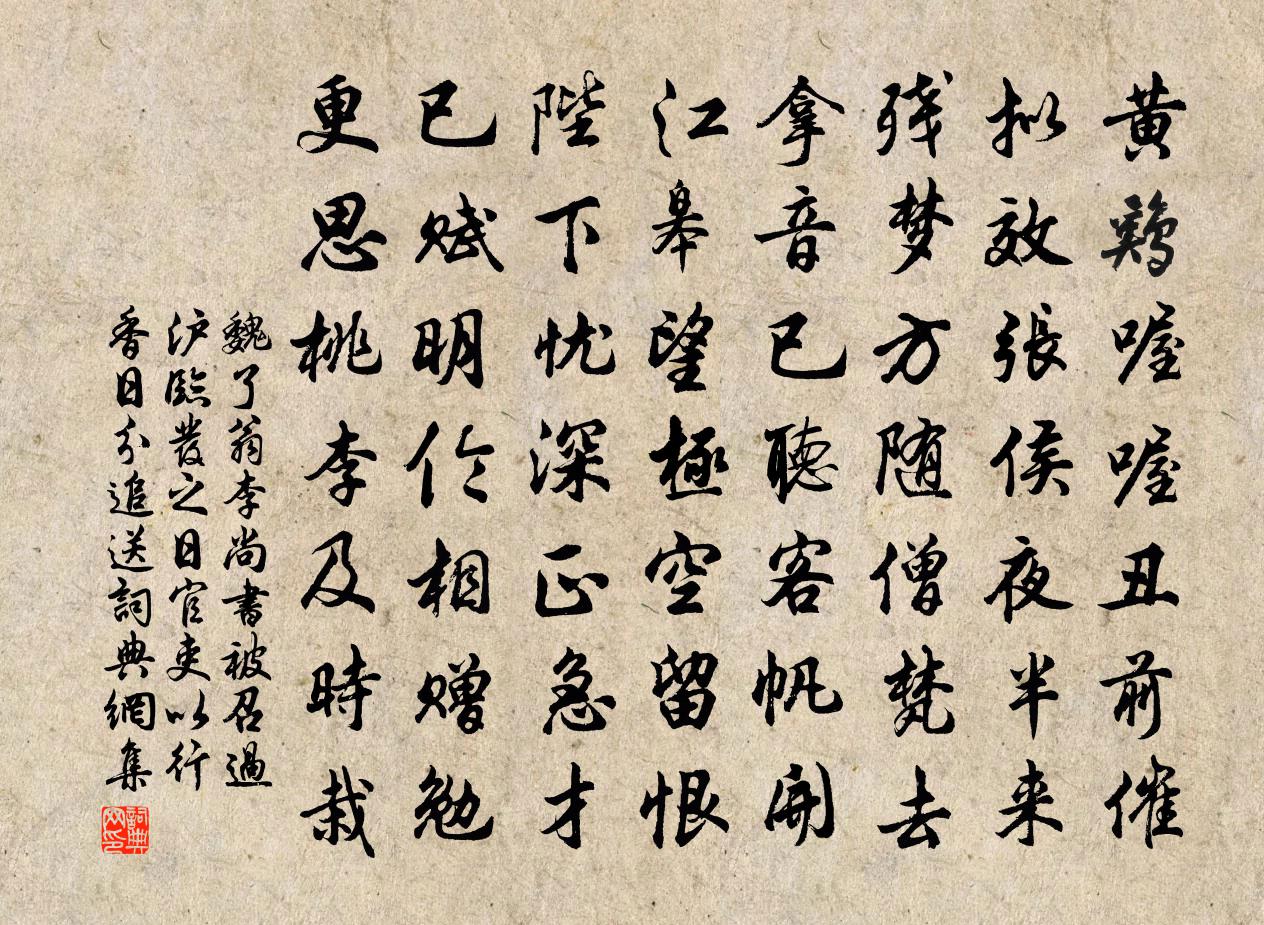 詩詞名句歷史字典書法欣賞書法字典國語詞典說文解字康熙字典古漢語字典標 題 作 者 詩 句 李尚書被召過滬臨發之日官吏以行香日分追送作者:魏了翁 朝代:宋代原文黃雞喔喔醜前催,擬效張侯夜半來。殘夢方隨僧梵去,拿音已聽客帆開。江皋望極空留恨,陛下憂深正急才。已賦明倫相贈勉,更思桃李及時栽。詩詞問答問:《李尚書被召過滬臨發之日官吏以行香日分追送》的作者是誰?答:魏了翁問:該詩寫於哪個朝代?答:宋代書法欣賞李尚書被召過滬臨發之日官吏以行香日分追送書法作品詩文賞析【原題】:李尚書被召過滬臨發之日官吏以行香日分追送不及明日尚書自合江詰後期次韻以謝詩詞推薦中秋以山居不得與周文對飲況子暢在數百里外趙蕃〔宋代〕山林遠俗人,風月親有輩。涼秋半今夕,痼疾況少退。詩懷客子喔,酒欠伯仁對。百年等夢幻,一笑有成敗。禿巾送廣漕曾郎中赴闕奏事喻良能〔宋代〕綠鬢懷中詔,清秋向上都。聖圖方廣大,賢路不崎嶇。會見除清切,寧須復轉輸。公如任風憲,抨劾莫踟躕。織女贈牽牛詩沈約〔南北朝〕紅妝與明鏡。二物本相親。用持施點畫。不照離居人。往秋雖一照。一照復還塵。塵生不復拂。蓬首對河津。冬夜除夜寄盧菊磵劉過〔宋代〕見說盧夫子,詩成手自書。雪便金帳暖,雲蔭玉山居。椒葉儲名酒,萍虀薦野蔬。夜寒裩犢鼻,應念馬相如。書適陸游〔宋代〕疇昔花前醉放顛,即今不飲亦陶然。太平固自多遺老,獨往何妨是斥仙。扶杖每觀南畝饁,解衣時作北窗眠。人間四威儀釋慧空〔宋代〕行,兩袖清風一瘦藤。人見玩,南寺打齋僧。宿溪村書齋趙希邁〔宋代〕故人能下榻,為喜客相過。不住夜泉滴,常疑春雨多。風來琴自響,冰合硯難磨。明日還分袂,羈吟誰共喔。寄隱靜山懷賢長老梅堯臣〔宋代〕山有枇杷樹,樹多獼猴群。高僧心不著,一似五峰雲。隨飈來溪口,石上起氤氳。果熟獼猴去,自向瀑澗分。自歸耕篆畦見村婦有摘茶車水賣魚汲水行饁寄舒岳祥〔宋代〕閨中寄衣婦,夫婿在遼陽。夜靜剪刀響,天寒鍼線長。自傷乖匹偶,不肯繡鴛鴦。早願王師息,我歡遠故鄉。次韻王鞏留別蘇軾〔宋代〕去國已八年,故人今有誰。當時交遊內,未數蔡克兒。豈無知我者,好爵半已縻。爭為東閣吏,不顧北山移。公子感昔侯懷風〔清代〕黃河水流響潺潺,當日腥風戰血殷。大地盡拋金鎖甲,長星亂落玉門關。居延蔓草縈枯骨,太液芙蓉失舊顏。成敗詠雲李邕〔唐代〕彩雲驚歲晚,繚繞孤山頭。散作五般色,凝為一段愁。影雖沉澗底,形在天際游。風動必飛去,不應長此留。登白帝城二首張嵲〔宋代〕霜風吹日下長原,夔子城荒灌木繁。東去諸山朝峽口,西來眾水會關門。千年白帝空祠廟,萬里家山只夢魂。絕寒春融融效李長吉體范浚〔宋代〕天暄地媚春融融,化工點染分花容。東風夜半入香陌,雜樹曉繁爭白紅。蘭叢蕙根芳翠滴,柳艷明眉輕羃{上四下送杜陽安奉親還蜀二首洪咨夔〔宋代〕訪落方勤止,而翁苦掉頭。立幾遺世獨,行盍為王留。日月馳雙轂,乾坤寄一舟。勿緣歸計得,忘卻緯邊憂。冰壺二首錢時〔宋代〕一掃從前萬慮非,寒光冷照發幽微。乾坤總在冰壺裹,不費壺公日暮歸。鵲踏枝馮延巳〔唐代〕蕭索清秋珠淚墜,枕簟微涼,展轉渾無寐。殘酒欲醒中夜起,月明如練天如水。階下寒聲啼絡緯,庭樹金風,悄悄邑人李子寬公綽以所著十說及論孟解相示極有孫應時〔宋代〕少日胸中萬丈虹,著書老尚有新功,同鄉我惜知君晚,善士天胡賦此窮。無槨去年非孔鯉,有家何地客梁鴻。秋風訴衷情晏幾道〔宋代〕種花人自蕊宮來。牽衣問小梅。今年芳意何似,應向舊枝開。憑寄語,謝瑤台。客無才。粉香傳信,玉盞開筵,莫送表忠觀錢道士歸杭蘇軾〔宋代〕先王舊德在民心,著令稱忠上意深。墮淚行看會祠下,掛名爭欲刻碑陰。淒涼破屋塵凝坐,憔悴雲孫雪滿簪。未信名句推薦至今窺牧馬,不敢過臨洮。西鄙人《哥舒歌》 春風江上路,不覺到君家高啟《尋胡隱君》 內官初賜清明火,上相閒分白打錢。韋莊《長安清明》 燕支長寒雪作花,蛾眉憔悴沒胡沙。李白《王昭君二首》 天清一雁遠,海闊孤帆遲。李白《送張舍人之江東》 長安大雪天,鳥雀難相覓。張孜《雪詩》 夫眾喣漂山,聚蚊成雷班固《漢書·傳·景十三王傳》 春衫猶是,小蠻針線,曾濕西湖雨。蘇軾《青玉案·送伯固歸吳中》 三日入廚下,洗手作羹湯。王建《新嫁娘詞三首》 去日兒童皆長大,昔年親友半凋零。竇叔向《夏夜宿表兄話舊》