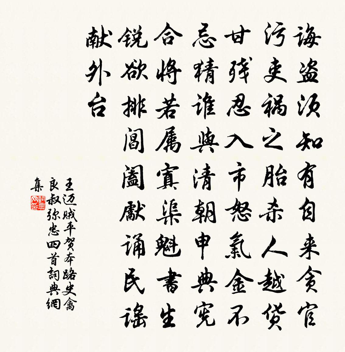 詩詞名句歷史字典書法欣賞書法字典國語詞典說文解字康熙字典古漢語字典標 題 作 者 詩 句 賊平賀本路史禽良叔彌忠四首作者:王邁 朝代:宋代原文誨盜須知有自來,貪官污吏禍之胎。殺1/1人越貨甘殘忍,入市怒氣金不忌猜。誰與清朝申典憲,合將若屬寘渠魁。書生銳欲排閶闔,先誦民謠獻外台。詩詞問答問:《賊平賀本路史禽良叔彌忠四首》的作者是誰?答:王邁問:該詩寫於哪個朝代?答:宋代書法欣賞賊平賀本路史禽良叔彌忠四首書法作品詩詞推薦尾犯佚名〔宋代〕輕風淅淅,正園林蕭索,未回暖律。嶺頭昨夜,寒梅初發,一枝訊息。香苞漸拆。天不許、雪霜欺得。望東吳,驛疇依王柏〔宋代〕虞舜則微,重華協帝。父頑母嚚,烝烝以乂。天理之極,人倫之至。恭已當天,雲行雨施。麥晁公溯〔宋代〕層雲挾雨來,四郊樹木蒼。東風吹春促,尚帶花葯香。年華不可駐,倏見夏日長。近傳陵陂麥,宿昔青已黃。隣舍嚼菜根顧逢〔宋代〕口體累人終不免,菜根能嚼樂無空。吾儒食慣知真味,誰信猶便幾富翁。挽汪約叟王柏〔宋代〕憶昔先君子,金蘭氣味投。中間有生死,一別幾春秋。曉漏傳幽夢,英魂覓舊遊。城東煙月冷,應是訪新丘。春帖子詞皇后閣十首宋祁〔宋代〕宮裡春花才灼灼,殿前春仗已峨峨。東風盡解天池凍,不及君王慶澤多。雜記十首劉克莊〔宋代〕登庸局面變,報復念頭差。貶削村夫子,褒崇笑夜叉。杖藜劉子翬〔宋代〕亂後惟憂死,無心問歲華。故園依草莽,今日見梅花。閩俗嘗三飯,僧房但一茶。海瀕猶未穩,更擬訪仙槎。題亦足堂王大受〔宋代〕舊聞有欲常難足,今日縱飽旋復飢。蟻穴夢濃方大妄,渭城歌斷正全痴。栽梅豈必萬株好,種竹何須千畝為。想見辛丑歲十一月二十六日東歸舟中示三子戴表元〔宋代〕節物悠悠不負公,江行三日雪花風。雲侵賀監山亭白,日在徐仙海島紅。自笑得雛如病鶴,也思結伴附歸鴻。何時海棠晏殊〔宋代〕輕盈千結亂櫻叢,占得年芳近碧櫳。逐處間勻高下萼,幾番分破淺深紅。煙晴始覺香纓綻,日極猶疑蠟蔕融。數夕秋懷元好問〔金代〕涼葉蕭蕭散雨聲,虛堂淅淅掩霜清。黃華自與西風約,白髮先從遠客生。吟似候蟲秋更苦,夢和寒鵲夜頻驚。何時南安王使君領客湛泉流觴曲水戴復古〔宋代〕橫浦堂前舉一卮,古榕陰下坐多時。連朝好雨千山澗,昨夜新秋一葉知。梅嶺鄉來逢行者,蘭亭今日又羲之。家聲追懷甲戌清明宇文信仲知郡大卿同尤張二倅過方回〔宋代〕甲戌清明鬢未翁,邦君過我小園中。牡丹初喜開千朵,劫火何知村一空。展轉干戈春夢斷,淒涼風雨客途窮。九原元夕八首陳世崇〔宋代〕看燈螃蟹月前供,迓鼓金銷畫領中。簾卷重樓燈乍試,柳稍風暖雪初融。發潯陽孔武仲〔宋代〕西遊不敢避殘年,兄弟分攜楚水邊。浩蕩東風回草木,朦瞳曉色滿山川。卻穿梅徑花爭落,久憩郵亭日未偏。安佚寄題廬陵王晉輔先輩桂堂陸游〔宋代〕楚人記草木,桂在椒蘭中,我懹小山句,妙絻窮化工。唐人作山水,亦以桂配松,丹葩間綠葉,錦繡相疊重。不知閱史感事文同〔宋代〕世間諸味已全疏,惟愛縑緗似蠹魚。名霸者來為御史,姓關人去作尚書。晉師嘿嘿曾何害,楚客昂昂只自如。安得鵲橋仙(和蔡子周)侯置〔宋代〕鶴髮蕭森,玉顏腴潤,養就黃芽金鼎。一區松菊老湘濱,但心遠、何妨人境。袞衣家世,鳴鸞歌舞,到了春冰消盡吳秘監每有美酒獨酌獨醉但蒙詩報不以飲招…酬兼呈夢得白居易〔唐代〕蓬山仙客下煙霄,對酒唯吟獨酌謠。不怕道狂揮玉爵,亦曾乘興解金貂。君稱名士誇能飲,我是愚夫肯見招。賴有名句推薦十二樓中盡曉妝,望仙樓上望君王。薛逢《宮詞》 玉帛朝回望帝鄉,烏孫歸去不稱王常建《塞下曲四首·其一》 故人應念,杜鵑枝上殘月。文天祥《酹江月·和友驛中言別》 天南地北雙飛客,老翅幾回寒暑。元好問《摸魚兒·雁丘詞 / 邁陂塘》 一寸光陰一寸金,寸金難買寸光陰。佚名《增廣賢文·上集》 一看腸一斷,好去莫回頭。白居易《南浦別》 但願蒼生俱飽暖,不辭辛苦出山林。于謙《詠煤炭》 社下燒錢鼓似雷,日斜扶得醉翁回。范成大《春日田園雜興》 想雁空、北落冬深,澹墨晚天雲闊。吳文英《暗香疏影·夾鍾宮賦墨梅》 卻恨悲風時起,冉冉雲間新雁,邊馬怨胡笳。葉夢得《水調歌頭·秋色漸將晚》