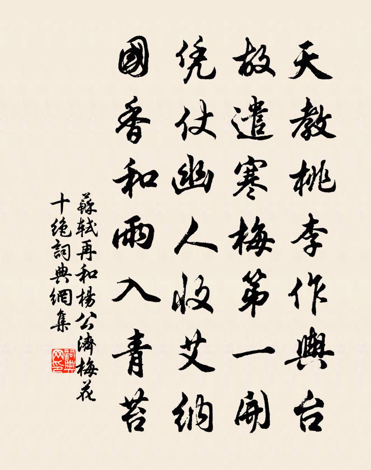 詩詞名句歷史字典書法欣賞書法字典國語詞典說文解字康熙字典古漢語字典標 題 作 者 詩 句 再和楊公濟梅花十絕作者:蘇軾 朝代:宋代再和楊公濟梅花十絕原文天教桃李作輿台,故遣寒梅第一開。憑仗幽人收艾納,國香和雨入青苔。詩詞問答問:再和楊公濟梅花十絕的作者是誰?答:蘇軾問:再和楊公濟梅花十絕寫於哪個朝代?答:宋代問:蘇軾的名句有哪些?答:蘇軾名句大全蘇軾再和楊公濟梅花十絕書法欣賞再和楊公濟梅花十絕書法作品詩詞推薦卜運算元姜夔〔宋代〕御苑接湖波,松下春風細。雲綠峨峨玉萬枝,別有仙風味。長信昨來看,憶共東皇醉。此樹婆娑一惘然,苔蘚生春游東堂詠桐詩謝朓〔南北朝〕孤桐北窗外。高枝百尺余。葉生既婀娜。葉落更扶疏。無華復無實。何以贈離居。裁為珪與瑞。足可命參墟。送僧歸護國寺王化基〔宋代〕巋然傍勢浙江東,不羨金庭第一峰。法境常清五十里,妙蓮今現幾千重。清涼解洗枝頭露,變更能飛缽底龍。平日詠竹火籠詩沈約〔南北朝〕結根終南下。防露復披雲。雖為九華扇。聊可滌炎氛。安能偶狐白。鶴夘織成文。覆持鴛鴦被。百和吐氛氳。忽為次韻高秀才重九二首項安世〔宋代〕未待經霜拆嫩黃,已思斜日醉高陽。鬢毛擬共冠巾約,詩句先含萸菊香。小雨微雲愁令節,批風借月倚新章。應門頌證道歌證道歌釋印肅〔宋代〕不是標形虛事持,釋迦老子要人知。拈來放去非他物,運水搬柴事事宜。素梅 其五王冕〔元代〕五雲縹緲隔蓬萊,仙子 * 月下回。轉首不知春幾許,霜花如雪滿瑤台。出真陽峽十首楊萬里〔宋代〕過盡危磯出小潭,回頭失卻石峰巉。春寒料峭元無事,知我猶藏一布衫。記夢三首楊萬里〔宋代〕雲袖危相復,霜鍾韻政遲。忽然數聲急,卻是住撞時。殘句:為君寫就黃庭了黃庭堅〔宋代〕為君寫就黃庭了,不博山 * 士鵝。別聶之美司馬光〔宋代〕客宦常漂泊,離懷徒自勞。貧無衣換酒,空有涕沾袍。木葉寒猶在,江潮暮更豪。行舟遠不見,賴有片帆高。和周濤見寄金君卿〔宋代〕薄宦留連未得歸,思親懷舊兩依依。嶺頭梅信憑誰去,枕上鴻聲到此稀。君喜及瓜催北嚮,我嗟垂翅倦南飛。何時東湖湯餅後進翁展墓飲嵩山踏雨泳歸在行相繼張埴〔宋代〕諸老襟期三十年,看花杖屨又棲禪。春風不斷期文意,噓拂衣冠著一邊。栲栳山章潛〔宋代〕秀色團團如栲栳,孤高端可壓群山。藏雲蓄雨無蹤跡,怨鶴啼猿自往還。次韻陸虞仲學士塗中詠雪二首李彌遜〔宋代〕可笑無氈老鄭虔,甘寒忍喜詠豐年。飛花穿樹春疑早,秀麥分岐瑞有先。白玉樓成迷萬井, * 繞認雙川。輕縑寄衣鄧氏〔宋代〕欲寄寒衣上帝都,連宵裁剪眼模糊。可憐寬窄無人試,淚逐西風灑去途。夏日原西避暑寄吟友齊己〔唐代〕熱煙疏竹古原西,日日乘涼此杖藜。閒處雨聲隨霹靂,旱田人望隔虹霓。蟬依獨樹幹吟苦,鳥憶平川渴過齊。別有乞金魚詞崔日用〔唐代〕台中鼠子直須諳,信足跳樑上壁龕。倚翻燈脂污張五,還來齧帶報韓三。莫浪語,直王相。大家必若賜金龜,賣卻讀李憕碑張耒〔宋代〕自唐中微北方沸,胡馬長鳴飲清渭。李公守節陷賊庭,身死骷髏行萬里。百年事往誰復省,一丘榛莽無人祭。荒碑謝張子儀尚書寄天雄附子北果十包楊萬里〔宋代〕今古交情市道同,轉頭立地馬牛風。如何聽履星晨客,猶念孤舟蓑笠翁。饋藥雙奩芬玉雪,解包百果粲青紅。看渠名句推薦念月榭攜手,露橋聞笛。周邦彥《蘭陵王·柳》 惟有樓前流水,應念我、終日凝眸。李清照《鳳凰台上憶 * ·香冷金猊》 春陽如昨日,碧樹鳴黃鸝。李白《秋思》 夜來幽夢忽還鄉,小軒窗,正梳妝。相顧無言,惟有淚千行。蘇軾《江城子·乙卯正月二十日夜記夢》 生事且瀰漫,願為持竿叟。綦毋潛《春泛若耶溪》 同為懶慢園林客,共對蕭條雨雪天。白居易《雪夜小飲贈夢得》 長恨去年今夜雨,灑離亭。晏幾道《愁倚闌令·花陰月》 想雁空、北落冬深,澹墨晚天雲闊。吳文英《暗香疏影·夾鍾宮賦墨梅》 晚鴉飛去,一枝花影送黃昏夏完淳《婆羅門引·春盡夜》 恩宜自淡而濃,先濃後淡者人忘其惠洪應明《菜根譚·概論》