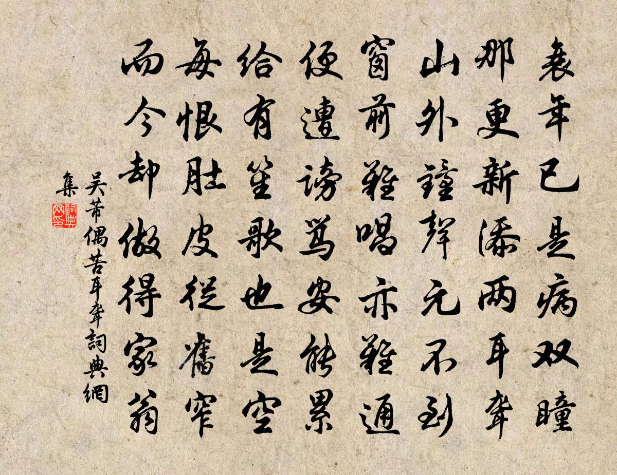 詩詞名句歷史字典書法欣賞書法字典國語詞典說文解字康熙字典古漢語字典標 題 作 者 詩 句 偶苦耳聾作者:吳芾 朝代:宋代偶苦耳聾原文衰年已是病雙瞳,那更新添兩耳聾。山外鐘聲元不到,窗前難唱亦難通。便遭謗罵安能累,給有笙歌也是空。每恨肚皮從舊窄,而今卻做得家翁。詩詞問答問:偶苦耳聾的作者是誰?答:吳芾問:偶苦耳聾寫於哪個朝代?答:宋代吳芾偶苦耳聾書法欣賞偶苦耳聾書法作品詩詞推薦減字木蘭花譚處端〔元代〕遇而不悟。可惜惺惺逐欲去。目下蹉跎。教我如今怎奈何。他時若到。悔晚投玄親妙道。早早回修。免向三塗六道偈頌十一首釋了演〔宋代〕昨日鬧浩浩,今朝靜悄悄。靜悄悄處鬧浩浩,鬧浩浩處靜悄悄。諸公載酒賀余休致水村農卿有詩次韻劉克莊〔宋代〕指法金針不許窺,笑他貧女織寒機。謫仙曲奏調羹賜,之問詩成奪錦歸。論定會盼銀信召,眷濃漫妒玉環肥。溪邊閨情代作杜牧〔唐代〕梧桐葉落雁初歸,迢遞無因寄遠衣。月照石泉金點冷,鳳酣簫管玉聲微。佳人刀杵秋風外,盪子從征夢寐希。遙望寄蕭大山兄弟樂雷發〔宋代〕梅花好處共心期,曾擷天葩寄夢思。兄弟自為千古計,江湖方誦二蕭詩。貪泉定喜逢廉吏,倭國何因拜老師。剩擬大行皇帝輓詩六首劉克莊〔宋代〕臨照三千界,涵濡四十春。沙難量福壽,天不大堯仁。眇小坡詩案,優容濮議人。老臣偏慟絕,曾扈屬車塵。邯鄲驛范成大〔宋代〕長安大道走邯鄲,倚瑟佳人悵望間。若見膻腥似今日,漢宮何用憶關山!賦得明星玉女壇,送廉察尉華陰王翰〔唐代〕洪河之南曰秦鎮,發地削成五千仞。三峰離地皆倚天,唯獨中峰特修峻。上有明星玉女祠,祠壇高眇路逶迤。三十王母歌(一作玉女歌)韋應物〔唐代〕眾仙翼神母,羽蓋隨雲起。上游玄極杳冥中,下看東海一杯水。海畔種桃經幾時,千年開花千年子。玉顏眇眇何處綸閣有感司空圖〔唐代〕風濤曾阻化鱗來,誰料蓬瀛路卻開。欲去遲遲還自笑,狂才應不是仙才。史太師病癒未果走賀誕辰伊邇作古詩三首寄之劉應時〔宋代〕真隱道骨堅,能御陰陽寇。不藉盧扁術,自得喬松壽。香馥東籬菊,樽余北海酒,裁詩千百篇,年年登袞繡。相和歌辭。江南曲八首劉希夷〔唐代〕暮宿南洲草,晨行北岸林。日懸滄海闊,水隔洞庭深。煙景無留意,風波有異潯。歲游難極目,春戲易為心。朝夕走筆和曾無逸掌故約觀玉照堂梅詩六首張鎡〔宋代〕才晴便是看花時,自看何如與客期。亦有數篇花下句,苦無風味怕人知。山茶蘇軾〔宋代〕游蜂掠盡冬粉黃,落蕊猶收蜜露香。待得春風幾枝在,年來殺菽有飛霜。句釋惠崇〔宋代〕鶴傳滄海信,僧和白雲詩。示寶覺二首王安石〔宋代〕重將壞色染衣裙,共臥鍾山一塢雲。客舍黃粱今始熟,鳥殘紅柿昔曾分。辯謗吟邵雍〔宋代〕田丹功蓋國,貂勃語回君。謗者古來有,猶能殺九人。寄趙帥三首陳造〔宋代〕銀鉤滿紙墮荊扉,樂事如今與願違。撫己可憐多病過,憶公深愧食言肥。早春雨中因呈邑大夫宋祁〔宋代〕瑞澍沾春陸,膚雲壓暝台。霰寒休雜下,風好即東來。遠岫吞將盡,陰霞照暫開。遍滋畦下麥,並濕隴頭梅。灑罶次韻子瞻杜介供奉送魚蘇轍〔宋代〕天街雪霽初通駟,禁籞冰開漸躍魚。十尾煩君穿細柳,一杯勸我芼青蔬。寒樽獨酌偶逢客,佳句相酬不用書。江海名句推薦手攜稚子夜歸院,月冷空房不見人。白居易《為薛台悼亡》 厭名利之談者,未必盡忘名利之情。陳繼儒《小窗幽記·集醒篇》 為者敗之,執者失之。老子《老子·道經·第二十九章》 竹樹無聲或有聲,霏霏漠漠散還凝。杜荀鶴《春日山中對雪有作》 客醉倚河橋,清光愁玉簫。高觀國《菩薩蠻·何須急管吹雲暝》 德者才之主,才者德之奴。洪應明《菜根譚·概論》 想當年,金戈鐵馬,氣吞萬里如虎。辛棄疾《永遇樂·京口北固亭懷古》 涉世無一段圓活的機趣,便是個木人,處處有礙。洪應明《菜根譚·概論》 見人不正,雖貴不敬也;見人有污,雖尊不下也。司馬遷《史記·日者列傳》 清江一曲柳千條,二十年前舊板橋。劉禹錫《楊柳枝 / 柳枝詞》