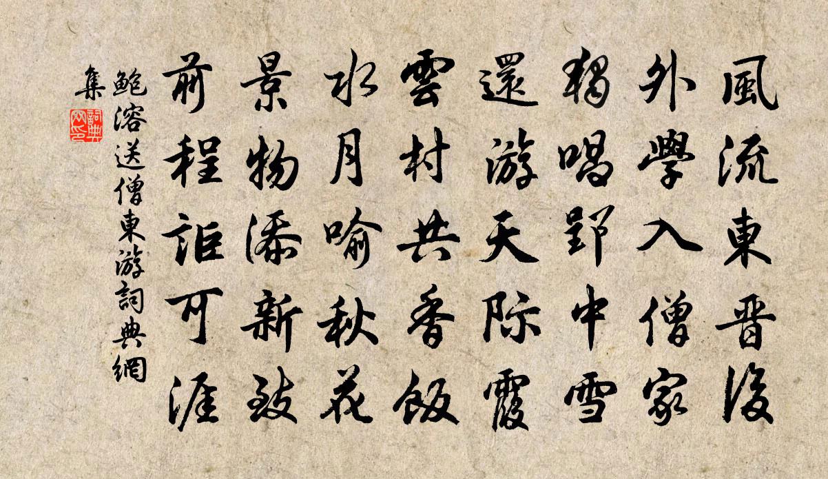詩詞名句歷史字典書法欣賞書法字典國語詞典說文解字康熙字典古漢語字典標 題 作 者 詩 句 送僧東遊作者:鮑溶 朝代:唐代送僧東遊原文風流東晉後,外學入僧家。獨唱郢中雪,還游天際霞。雲村共香飯,水月喻秋花。景物添新致,前程詎可涯。詩詞問答問:送僧東遊的作者是誰?答:鮑溶問:送僧東遊寫於哪個朝代?答:唐代鮑溶送僧東遊書法欣賞送僧東遊書法作品詩詞推薦喜雪用禁物體二首吳潛〔宋代〕傍海風痴翦水難,偷他瑞葉散雲端。可須滕巽同宣力,坐使顓冥不曠官。衣被麥苗攙臘到,裝褫花樹借春看。明年雲門溪上獨步陸游〔宋代〕山路聯翩十日陰,晚晴剩喜得幽尋。殘紅猶有數枝在,漲綠真成一倍深。泉響佩環鳴闇壑,月明珠璧散疏林。歸來漁家傲佚名〔宋代〕雪點江梅才可可。梅心暗弄纖纖朵。疑是月娥庭下過。仙翹嚲。雲衫密綴真珠顆。玉斝金甌連臂坐。芳辰莫把離魂山居雜詩九十首曹勛〔宋代〕孟夏物物茂,瓜瓠行置架。引苗上扶疏,須蔓競纏掛。白花亦已出,青實旋造化。會喜園枯時,匕箸不增價。和丹岩以青溪至有作衛宗武〔宋代〕故人未到欠詩催,才到九山云為開。野鶴正思尋老伴,盟鷗亦競喜朋來。免教北隴慚空帳,消得南山詠有台。梅信贈傅商卿陳造〔宋代〕殘年多病更銜哀,今日衰懷得好開。聞道場功因雨止,徑緣老子犯寒來。下簾小熾萁爐火,煨芋聊持藥玉杯。翻憶夢中作陸游〔宋代〕試說山翁事,諸君且勿嘩。百年看似夢,萬里不思家。夜艾猶添酒,春殘更覓花。卻嗤勾漏令,辛苦學丹砂。奉和襲美贈魏處士五貺詩太湖硯陸龜蒙〔唐代〕誰截小秋灘,閒窺四緒寬。繞為千嶂遠,深置一潭寒。坐久雲應出,詩成墨未乾。不知新博物,何處擬重刊。調笑毛滂〔宋代〕心醉雙翠翹。西廂月冷蒙花霧。落霞零亂牆東樹。此夜靈犀已暗通,玉環寄恨人何處。何處。長安路。不記牆東花戲贈崔千牛劉禹錫〔唐代〕學道深山許老人,留名萬代不關身。勸君多買長安酒,南陌東城占取春。孫賁知衢州去疑冢以其所得雙石作堂乞詩張舜民〔宋代〕芝蘭雖好忌當門,何況庭前惡土墩。畚鍤才興雙劍出,狐狸盡去老松蹲。百年守冢真堪笑,一日開軒亦可尊。安得壬辰日蝕陳普〔宋代〕憶昔度宗皇帝時,十年十三日食之。似道屓贔湖海曲,天 * 庭耽樂嬉。滿朝翕翕皆婦人,禍來照鏡方畫眉。北軍好事近(和城中諸友韻)辛棄疾〔宋代〕雲氣上林梢,畢竟非空非色。風景不隨人去,到而今留得。老無情味到篇章,詩債怕人索。卻笑近來林下,有許多頌古九十八首釋印肅〔宋代〕帶識髑髏撥死屍,箇中許道實難為。任渠碎我骨消散,終須不賺釋迦兒。水仙花畫方回〔宋代〕□繪水仙陪魯直,梅邊更有子瞻形。蘇兄黃弟神遊處,重築人間頓有亭。行香子 原誤作南香子 此下原有虞美人重陽飲佚名〔宋代〕一個蒼蠅,飛入腥盆。顧甜時、直入中心去,忘了抬身。沾其足,沾其翅,喪其形。我好嗟吁,怎不動心。甜中有送孫十尉溫縣錢起〔唐代〕飛花落絮滿河橋,千里傷心送客遙。不惜芸香染黃綬,惟憐鴻羽下青霄。雲衢有志終驤首,吏道無媒且折腰。急管有感陸游〔宋代〕雲崦重重不易尋,庖廚性命走山林。但令有月同幽夢,更用何人識苦心。流輩漸稀知死近,鬢毛無色覺愁侵。平生若耶曲喻良能〔宋代〕若耶溪上涼如許,五月清風不知暑。半空濃翠接蒼煙,滿眼輕陰覺疏雨。織女潭邊深復深,繞門山畔石成林。紅妝思子虡陸游〔宋代〕里堠迢迢阻問津,年光冉冉苦催人。未能免俗予嗟老,豈不懷歸汝念親。家釀湖蓴誰共醉?江雲淮月又經春。新詩名句推薦今歲早梅開,依舊年時月。張孝祥《卜運算元·雪月最相宜》 僵臥孤村不自哀,尚思為國戍輪台。陸游《十一月四日風雨大作》 不知而自以為知,百禍之宗也。呂不韋《呂氏春秋·覽·有始覽》 未羞他、雙燕歸來,畫簾半卷張炎《解連環·孤雁》 日晚江南望江北,寒鴉飛盡水悠悠。嚴維《丹陽送韋參軍》 雨中禁火空齋冷,江上流鶯獨坐聽。韋應物《寒食寄京師諸弟》 斜風細雨作春寒。對尊前。朱淑真《江城子·賞春》 夫魚食其餌,乃牽於緡;人食其祿,乃服於君。姜子牙《六韜·文韜·文師》 白兔搗藥秋復春,嫦娥孤棲與誰鄰?李白《把酒問月·故人賈淳令予問之》 紅豆不堪看,滿眼相思淚。牛希濟《生查子·新月曲如眉》