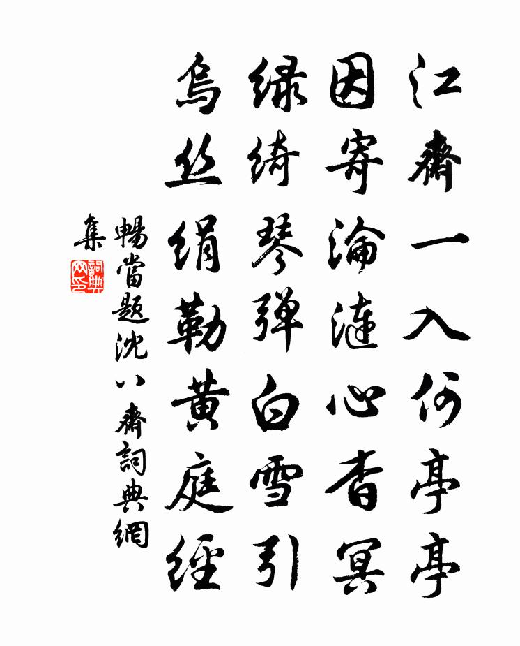 詩詞名句歷史字典書法欣賞書法字典國語詞典說文解字康熙字典古漢語字典標 題 作 者 詩 句 題沈八齋作者:暢當 朝代:唐代題沈八齋原文江齋一入何亭亭,因寄淪漣心杳冥。綠綺琴彈白雪引,烏絲絹勒黃庭經。詩詞問答問:題沈八齋的作者是誰?答:暢當問:題沈八齋寫於哪個朝代?答:唐代問:題沈八齋是什麼體裁?答:七絕暢當題沈八齋書法欣賞題沈八齋書法作品注釋全唐詩:卷287_15詩詞推薦依韻和武平九月十五日夜北樓望太湖梅堯臣〔宋代〕東吳臨海若,看月上青冥。河漢微分練,星辰淡布螢。細煙沈遠水,重露裛空庭。孤坐饒清興,惟將影對形。贈別藤州法曹南劍張仲明曾豐〔宋代〕天上張公子,名家更好修。文章虹貫日,意氣鶚橫秋。桃李春風發,桑榆晚景收。丹心猶自在,素業未容休。游淳化寺陸游〔宋代〕蕭寺久不到,偶來幽興長。螘穿珠九曲,蜂釀蜜千房。雨過山橫翠,霜新橘弄黃。年衰道不進,珍重一爐香。新居感詠杜衍〔宋代〕無似老且病,惟恐歸田遲。一旦得引年,九天還聽卑。尚沾二品祿,俾盡百年期。恩深淪骨髓,感極橫涕洟。始營憶李友叔皓三首陳淳〔宋代〕初見即我贈,東京博雅堂。再見復我和,北窗小梅章。此物今只存,而人乃雲亡。有時牽龍尾,濃磨發精光。恍惚寄翁丹山侍郎劉克莊〔宋代〕閱盡諸公上要津,丹山除目一番新。六卿尤重大宗伯,九制須還老舍人。太史將封乃留滯,紀瞻雖召尚逡巡。應憐毗陵郡齋冬至晴寒楊萬里〔宋代〕竹屋消殘半瓦霜,水河凍裂一漁航。不須宮線量曦影,化日今年特地長。壽定叟弟張栻〔宋代〕堂堂自昔源流遠,袞袞方來事業長。駟馬安車遵大道,正須緩轡不須忙。失題吳可〔宋代〕熱官惱狂士,冰山倚嚴冬。此計定不長,會作須臾空。先生踏金門,大節孝與忠。能事不掛口,處之如無功。高隱九日浮梁有約登高者以病不赴黎廷瑞〔宋代〕老樹荒城噪暮鴉,淒涼節氣滿天涯。絕憐多病相疏酒,又是重陽不在家。浮世光陰易紅葉,秋籬晚節復黃花。閉關次韻荼槱二絕洪咨夔〔宋代〕愛春留得瓊英在,添竹扶將翠蔓高。更著金沙相間種,主人四壁錦周遭。代公慶上郭帥王灼〔宋代〕昔年先廟謁汾陽,提筆從公寫短牆。再別巴江油戟下,七逢天竺桂枝香。宦途自許安仁拙,浮俗誰憐處士狂。客舍滿江紅慢王吉昌〔元代〕勘破榮華,提智劍、急逃生死。要黜聰、隳體虛室,內專窮理。綠水青山成伴侶,清風明月為知己。得自歌自樂樂水龍吟 送程達之萬戶還宣城張之翰〔元代〕我從年少知君,胸中氣與秋天杳。天戈南下,幾番屯戍,幾番征討。筆硯從戎,詩書為將,世間元少。想何如靜處次韻子瞻和淵明擬古九首蘇轍〔宋代〕夜夢被發翁,騎驎下大荒。獨行無與游,闖然款我堂。高論何崢嶸,微言何渺茫。我徐聽其說,未離翰墨場。平生太皇太后閣六首蘇軾〔宋代〕共道十年無臘雪,且欣三白壓春田。盡驅南畝扶犁手,稍發中都朽貫錢。閒居雜詠三十二首審問陳淳〔宋代〕物理本不齊,雜然各異分。參伍寧無疑,要在審所問。別諸同志(得新鴻)鍾蒨〔唐代〕隨陽來萬里,點點度遙空。影落長江水,聲悲半夜風。殘秋辭絕漠,無定似驚蓬。我有離群恨,飄飄類此鴻。用明發不寐有懷二人為韻寄李秉彝德叟黃庭堅〔宋代〕人生不如意,十事恆 * 。未見歷下人,徒傾歷城酒。從來親骨肉,不免相可不。但願崇事實,虛名等箕斗。十一月初三日插梅花古罍洗中因成四絕舒岳祥〔宋代〕雪中點綴精神好,月下橫陳骨格真。更有風煙生別恨,隔簾遙望李夫人。名句推薦激氣已能驅粉黛,舉杯便可吞吳越。史達祖《滿江紅·中秋夜潮》 無稽之言,不見之行,不聞之謀,君子慎之。荀子《荀子·正名》 金陵子弟來相送,欲行不行各盡觴。李白《金陵酒肆留別》 零淚向誰道,雞鳴徒嘆息。沈約《夜夜曲》 君思潁水綠,忽復歸嵩岑。李白《送裴十八圖南歸嵩山二首》 皮之不存,毛將安傅?左丘明《左傳·僖公·僖公十四年》 掩淚空相向,風塵何處期盧綸《李端公/送李端》 何日平胡虜,良人罷遠征。李白《子夜吳歌·秋歌》 無心非,名為錯。有心非,名為惡。李毓秀《弟子規·信》 錦江春色來天地,玉壘浮雲變古今。杜甫《登樓》