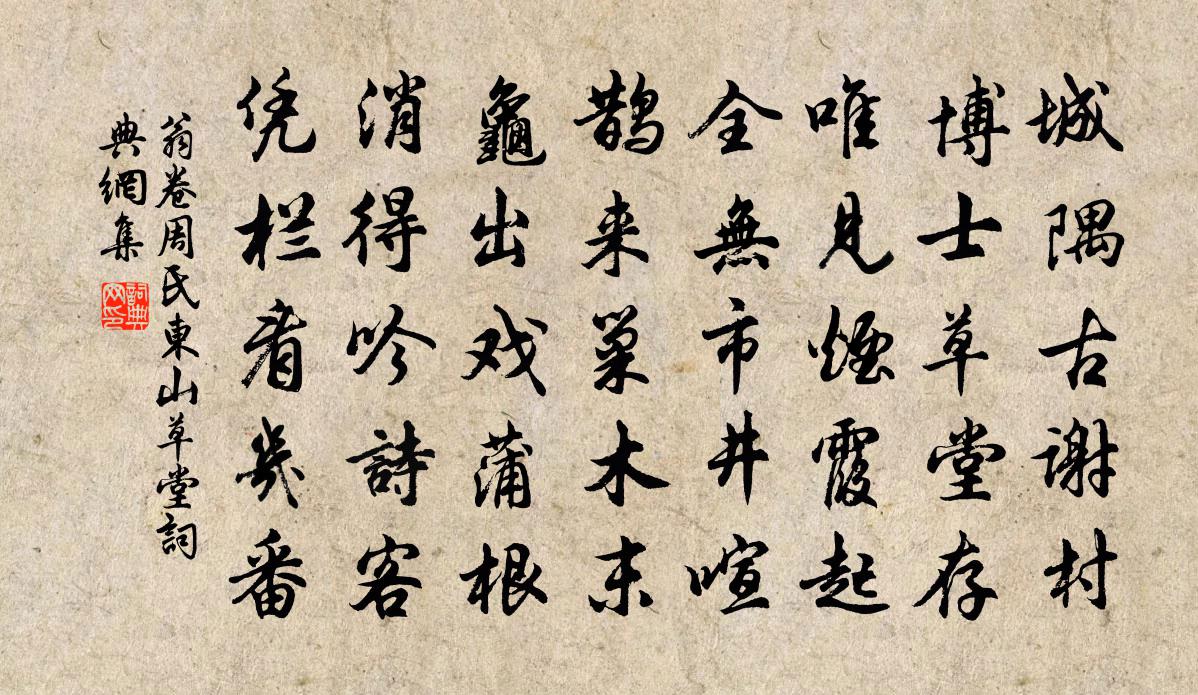詩詞名句歷史字典書法欣賞書法字典國語詞典說文解字康熙字典古漢語字典標 題 作 者 詩 句 周氏東山草堂作者:翁卷 朝代:宋代周氏東山草堂原文城隅古謝村,博士草堂存。唯見煙霞起,全無市井喧。鵲來巢木末,龜出戲蒲根。消得吟詩客,憑欄看幾番。詩詞問答問:周氏東山草堂的作者是誰?答:翁卷問:周氏東山草堂寫於哪個朝代?答:宋代翁卷周氏東山草堂書法欣賞周氏東山草堂書法作品詩詞推薦偈頌一百五十首釋心月〔宋代〕於食等者,於法亦等。於法等者,於食亦等。法食雙運,平等普薰。楚節西塘省鞠張至龍〔宋代〕鞠胎綠蕊未曾成,百種藂中半忘名。試檢記花牌字看,春籬醉墨欠分明。和崔若拙四時田家詞四首之四賀鑄〔宋代〕晚雪漫漫沒兔罝,滿杯豆粥餉鄰家。夜長少婦無舂織,一點青燈伴緝麻。滿庭芳魯訔〔宋代〕坐嘯蓬宮,移旌天府,往來三島十洲。況瑞靄當年,初下瓊樓。自是長生伴侶,那堪更河潤神州。人爭嘆,威名福喜兒輩歸寧劉應時〔宋代〕凜凜寒威欲挾綿,稜稜病骨只忻眠。燈花璀璨人歸後,雲色蒼茫雪作天,百歲光陰寧有幾,四時飲啄且隨緣。擁爐次程直學秋雨感楊公遠〔宋代〕一雨戰秋陽,風生衣袂舉。更不假蒲葵,秋陽眇何許。渾如赫赫人,其技只鼯鼠。須信有循環,涼生屏煩暑。此意頌古三十一首釋如本〔宋代〕不出漫漫草路遮,出門猶更隔天涯。回機踏著通霄路,何處青山不是家。玄武湖曾極〔宋代〕當日湖光澈鏡心,龍旗鳳吹此登臨。而今鐵馬迴旋地,斜照黃塵一尺深。挽林紹伊二首吳芾〔宋代〕三朝褒舊德,一代仰名儒。晚歲持荷橐,頻年剖竹符。共期調鼎鼐,豈謂老江湖。身後知無憾,傳家有鳳雛。薌岩山居孟夏二十絕舒岳祥〔宋代〕雉子行傍叢,鹿麑下飲澗。近人固數驚,無心復遠患。園蔬六首袁燮〔宋代〕白菘肥脃真佳品,紫芥蒙茸亦可人。環舍滿畦多且旨,寒儒專享未為貧。游昭慶寺張鎡〔宋代〕招提徐步已身輕,禮懺僧忙不出迎。側殿掛燈窺塑像,小廊流水愛經聲。心安久矣空塵想,夢異當年記宿生。目送買坡塘/摸魚兒佚名〔宋代〕喜西風、朝來如約,新涼一雨初霽。家山望斷知何處,渺渺長天秋水。空眼底。嘆雁杳魚沈,尺紙無人寄。芸窗草徐郎廟楊時〔宋代〕古廟靈場枕碧巔,松楸依約鎖風煙。羽毛一去無訊息,墮落人間幾百年。黃鶴樓送孟浩然之廣陵李白〔唐代〕故人西辭黃鶴樓,煙花三月下揚州。孤帆遠影碧空盡,唯見長江天際流。寄蕭大山兄弟樂雷發〔宋代〕梅花好處共心期,曾擷天葩寄夢思。兄弟自為千古計,江湖方誦二蕭詩。貪泉定喜逢廉吏,倭國何因拜老師。剩擬浣溪沙仲殊〔宋代〕楚客才華為發揚。深林著意不相忘。夢成燕國正芬芳。莫把品名閒議擬,且看青鳳羽毛長。十分領取面前香。元日登九山潘牥〔宋代〕不到鰲峰久,重來感物華。松應添歲壽,梅尚隔年花。清磬聞朝斗,丹爐借瀹茶。城人記節氣,此日正喧譁。余為華陽違法三直事制置使公牧都漕兩使者以程公許〔宋代〕拄笏西山興已濃,蚌溪邀我采芙蓉。客游舊有詩盟在,迷惘冷新添野庸。世路今方悲梗塞,家山暫許樂從容。等間第七回回前詩曹雪芹〔清代〕十二花容色最新,不知誰是惜花人。相逢若問名何氏,家住江南姓本秦。名句推薦樹德務滋,除惡務本佚名《尚書·周書·泰誓》 日往菲薇,月來扶疏。左思《三都賦》 滿地蘆花和我老,舊家燕子傍誰飛?文天祥《金陵驛二首·其一》 獨上小摟春欲暮,愁望玉關芳草路。韋莊《木蘭花·獨上小樓春欲暮》 高館張燈酒復清,夜鍾殘月雁歸聲。高適《夜別韋司士》 都雲作者痴,誰解其中味。曹雪芹《紅樓夢·第一回》 受任於敗軍之際,奉命於危難之間諸葛亮《前出師表》 虜騎聞之應膽懾,料知短兵不敢接,車師西門佇獻捷。岑參《走馬川行奉送出師西征 / 走馬川行奉送封大夫出師西征》 疑行無成,疑事無功。商鞅《商君書·更法》 人生無根蒂,飄如陌上塵。陶淵明《雜詩》